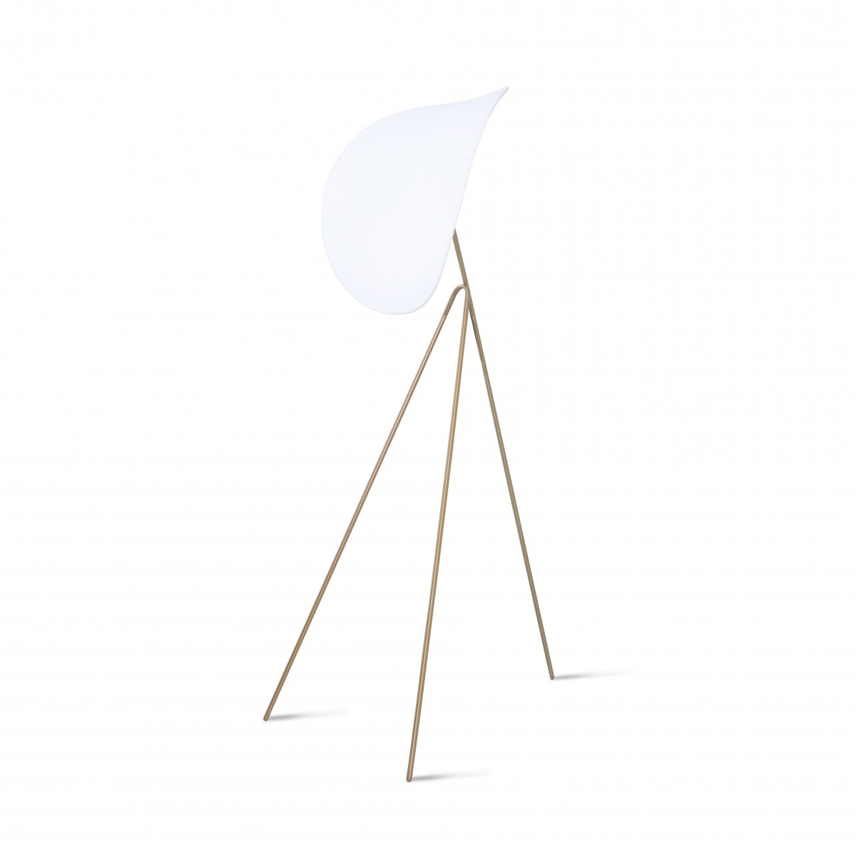 Single white lampshade on brass metal tripod base.