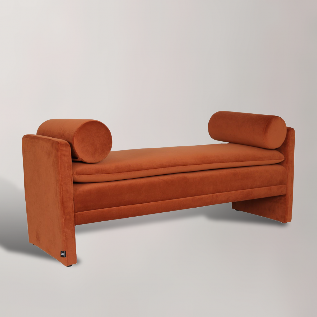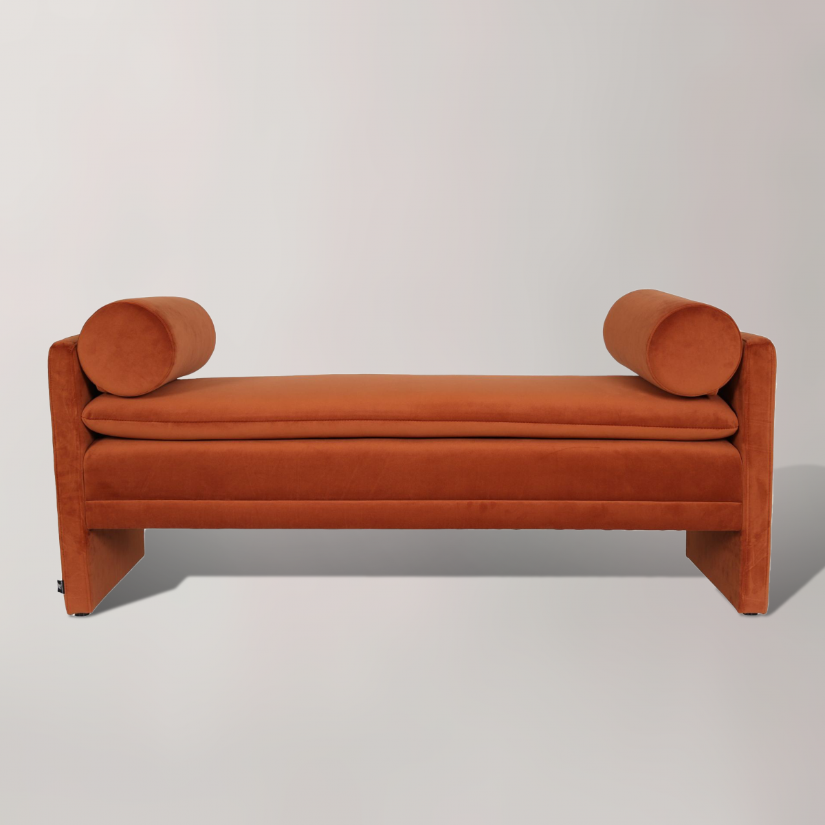 يجمع هذا المقعد بين دفء اللون البرتقالي المحروق ونعومة المخمل، مما يجعله قطعة بارزة تمزج بين الأناقة والراحة