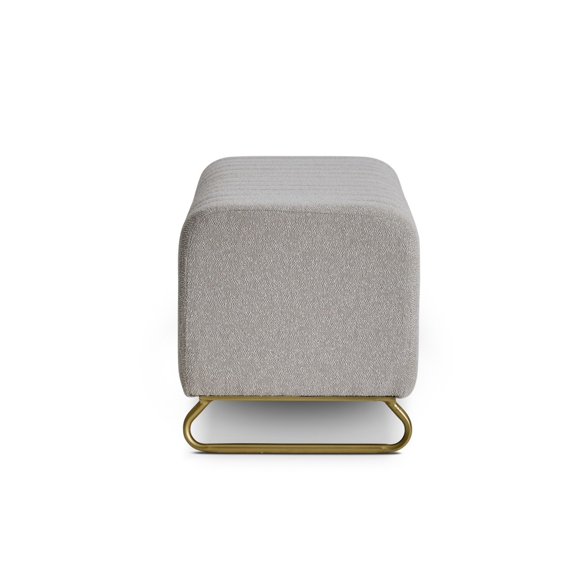 This pouf boasts an elongated silhouette, making it a versatile piece perfect for various uses—whether as extra seating, a chic footrest, or a stylish accent. Its standout feature is the brushed gold metal base, which adds a glamorous touch to its design.