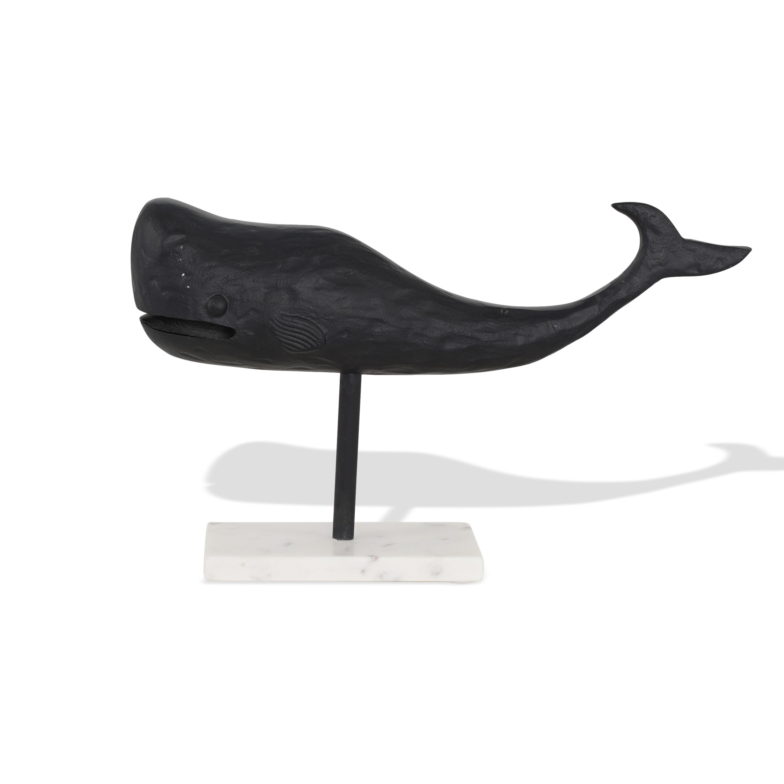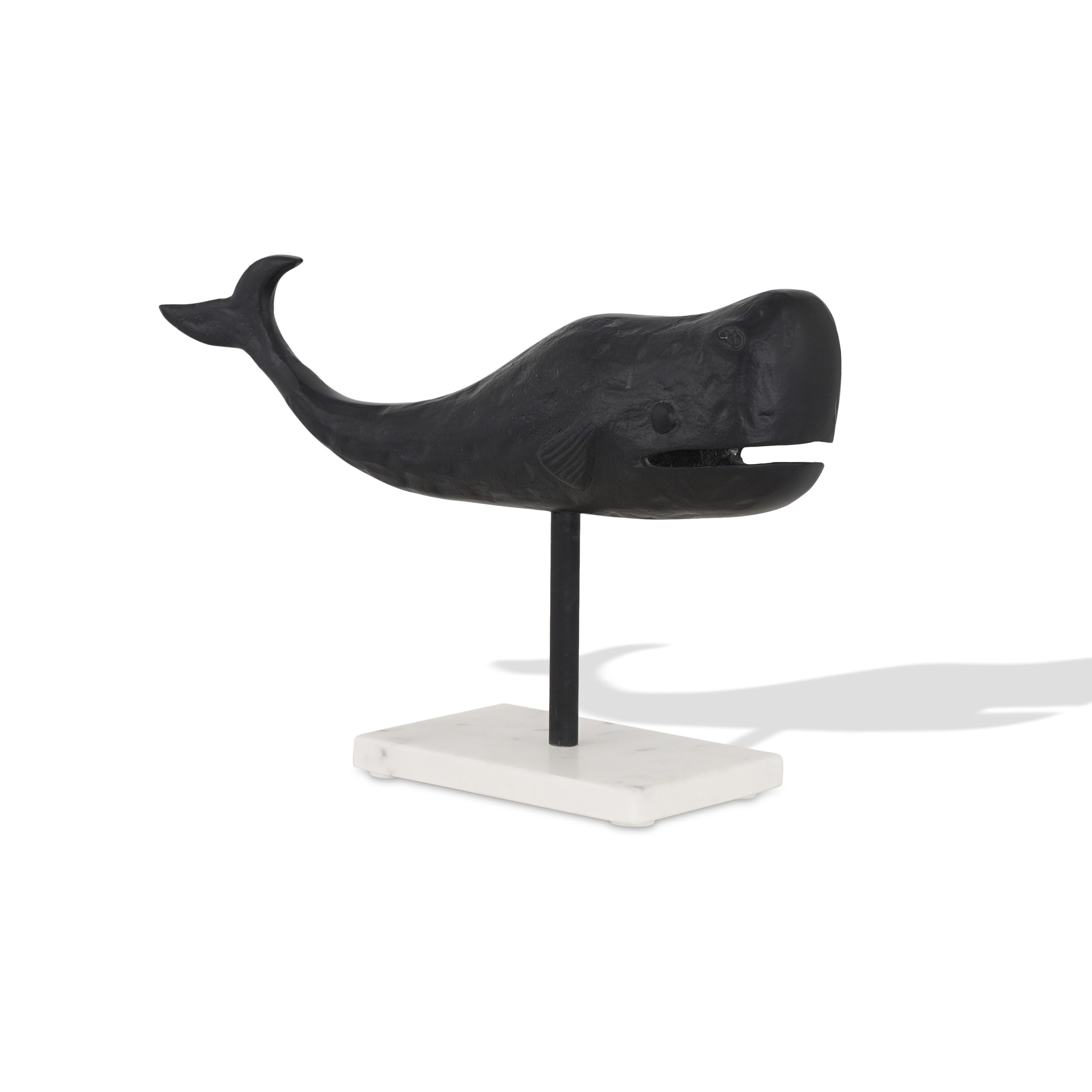 تمثال حوت معدني مطلي بمسحوق أسود على قاعدة من الرخام الأبيض