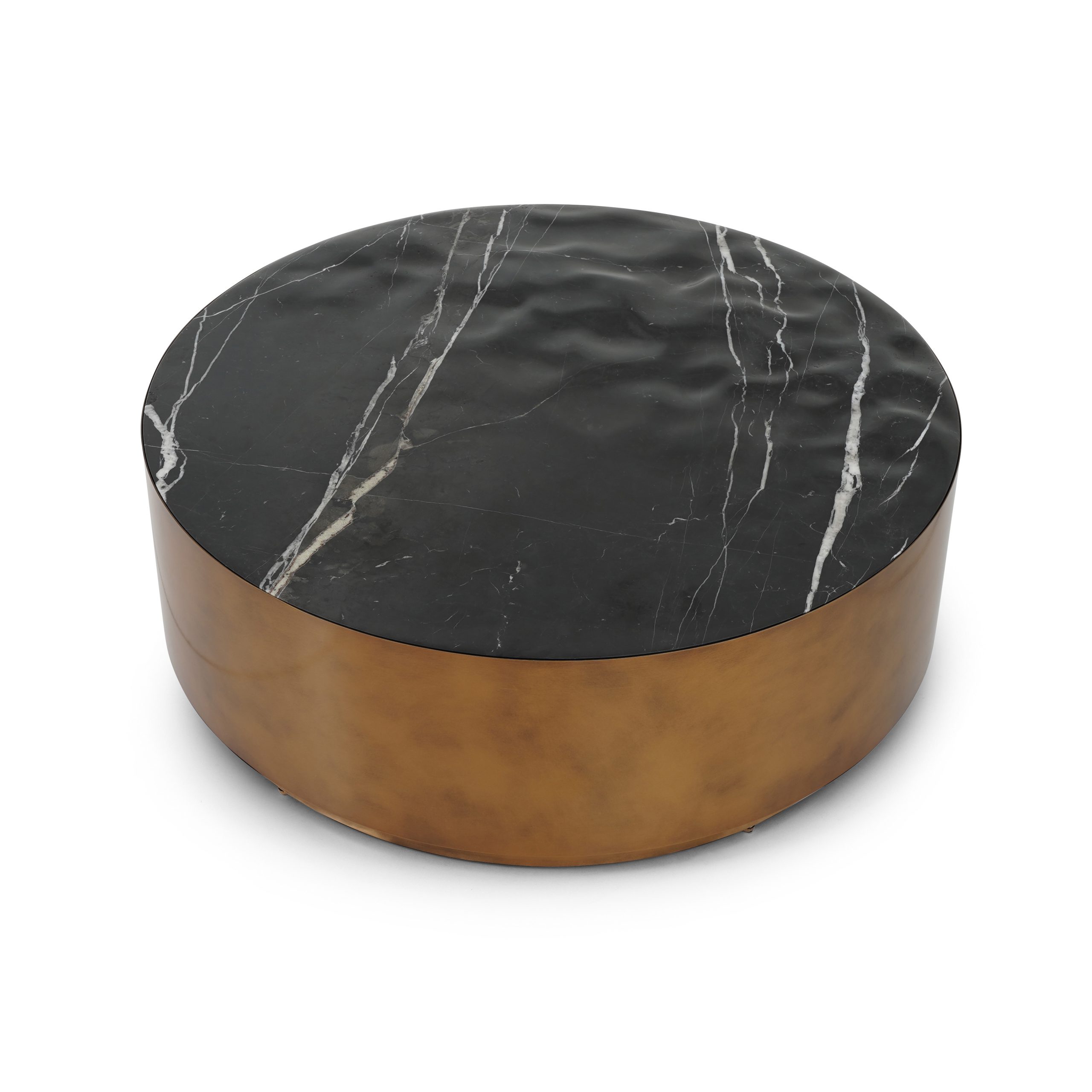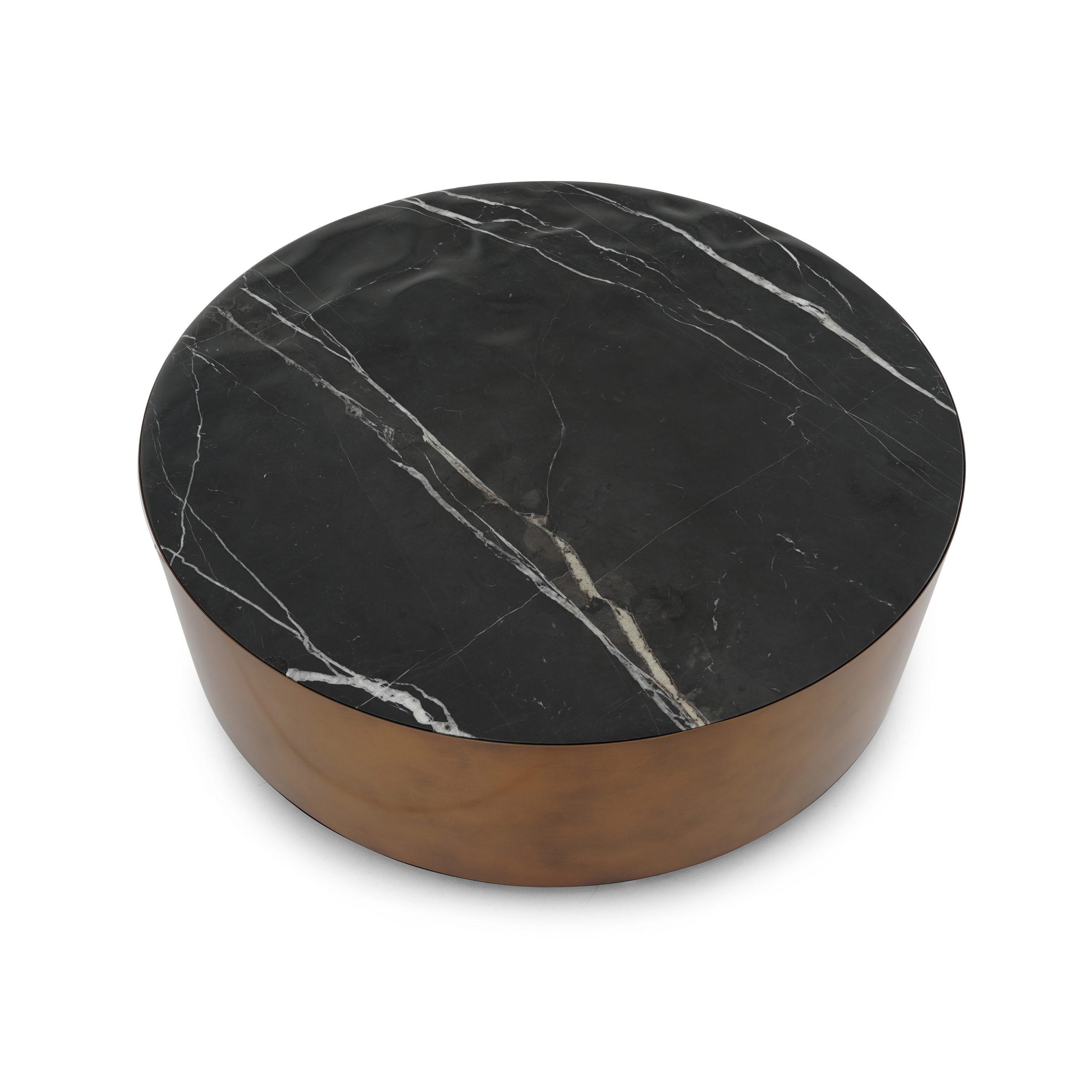 يوجد سطح سيراميك أسود ذو تأثير طقطقة فوق قاعدة من النحاس المصقول، مما يخلق تباينًا جميلًا بين الملمس واللمعان.