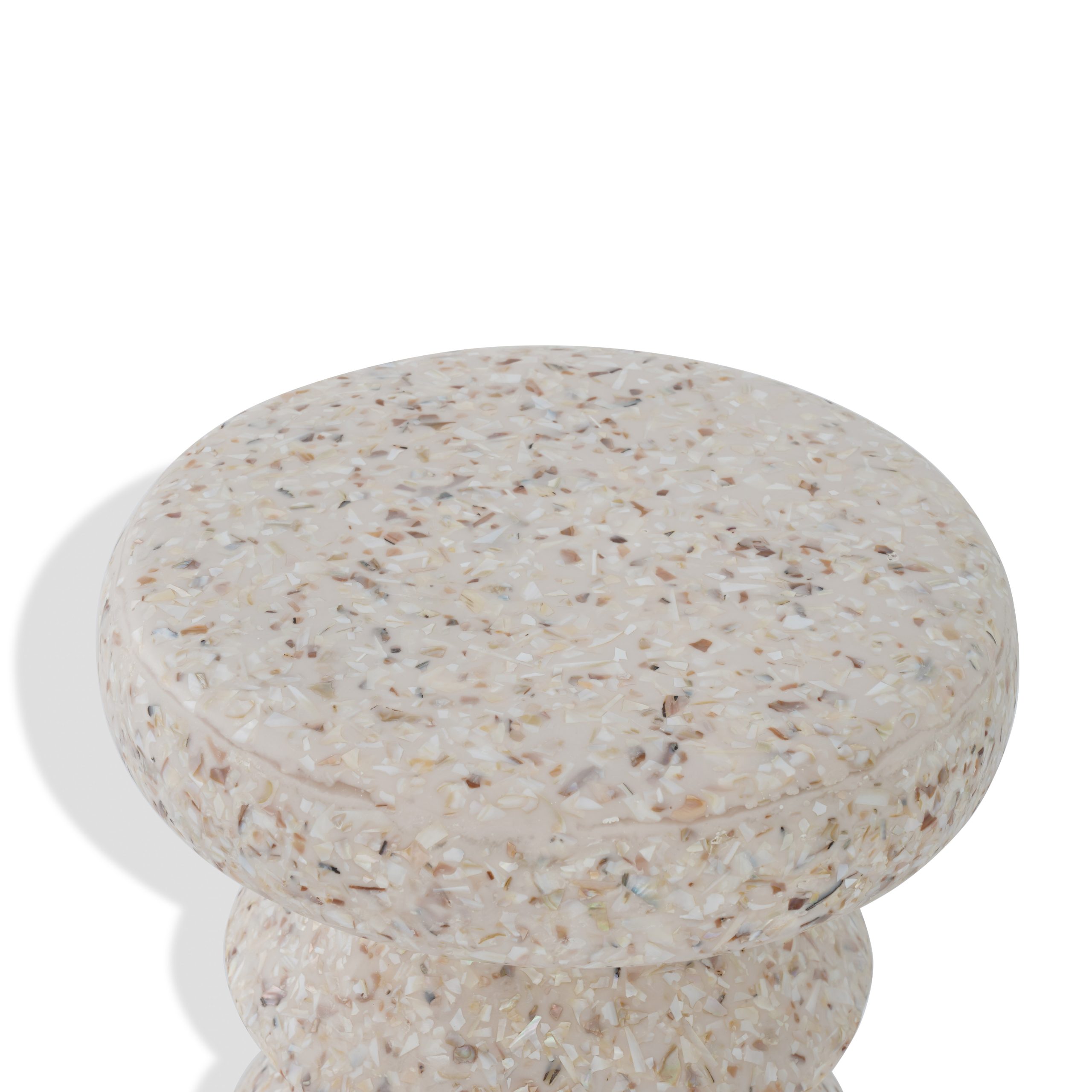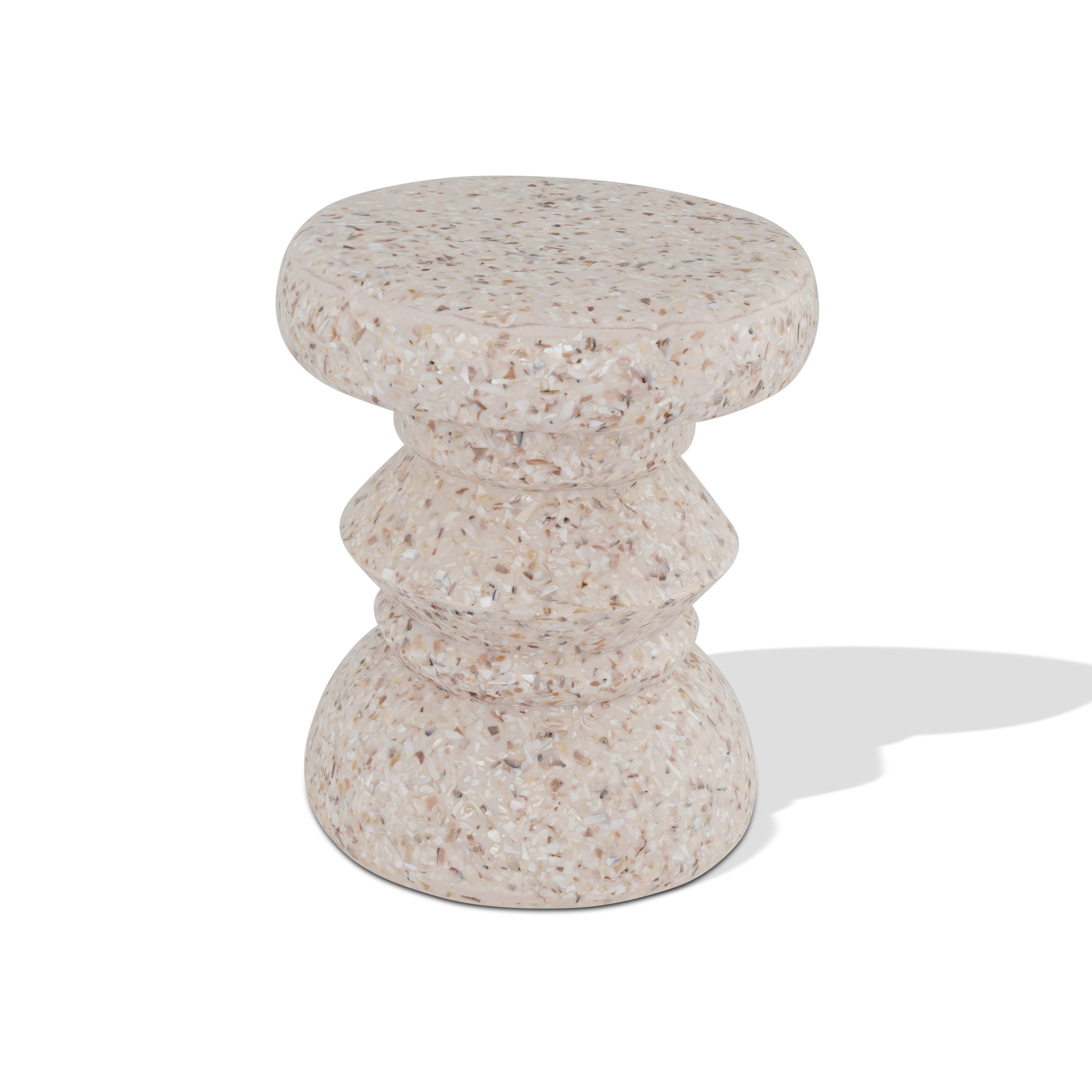 كرسيّ أنيقٌ ومقعدٌ في آنٍ واحد. مُغلّفٌ بتأثير تيرازو بيج أنيق، يمتزج سطحه وقاعدته الحجرية المصنوعة من الألياف بسلاسةٍ لإطلالةٍ عصريةٍ خالدة.