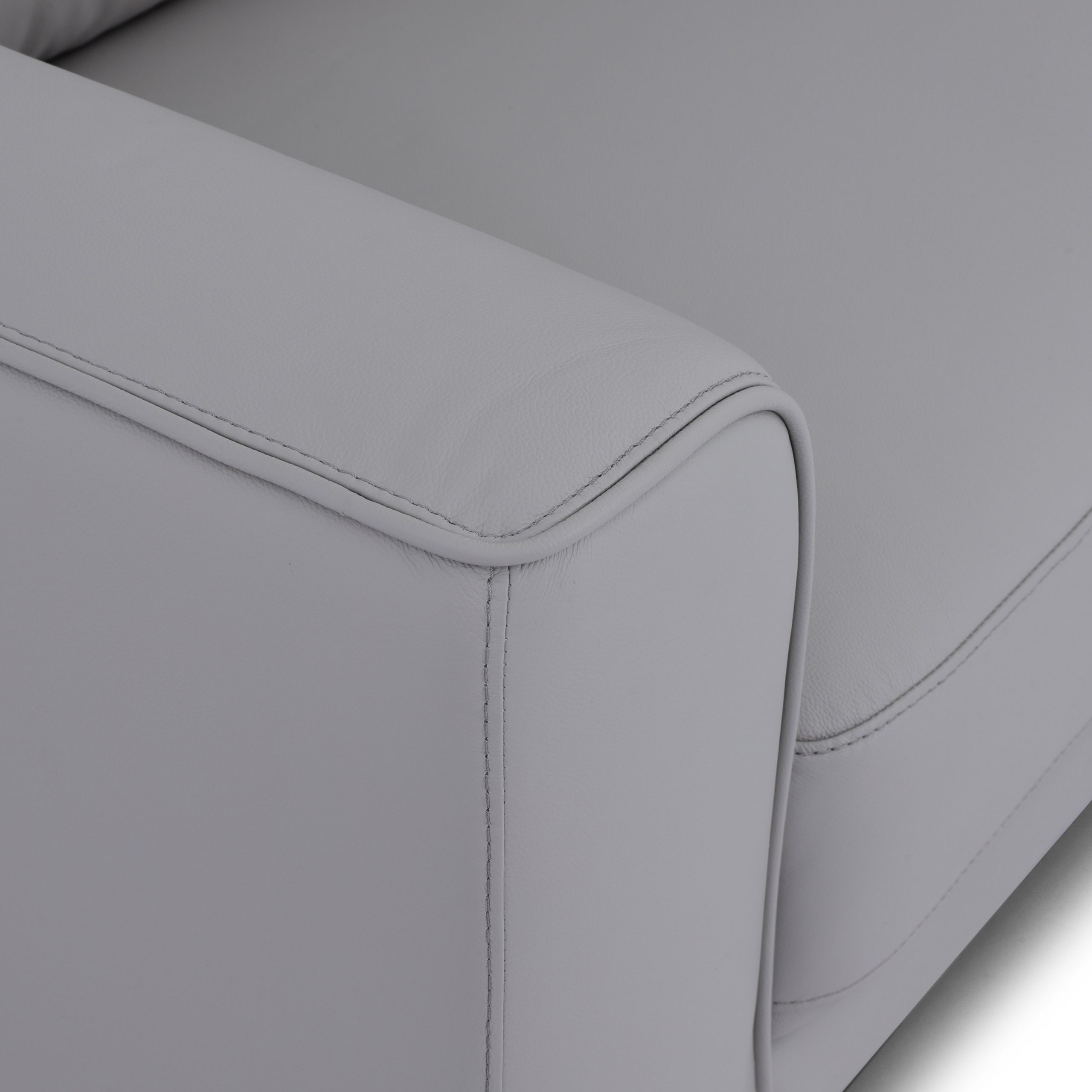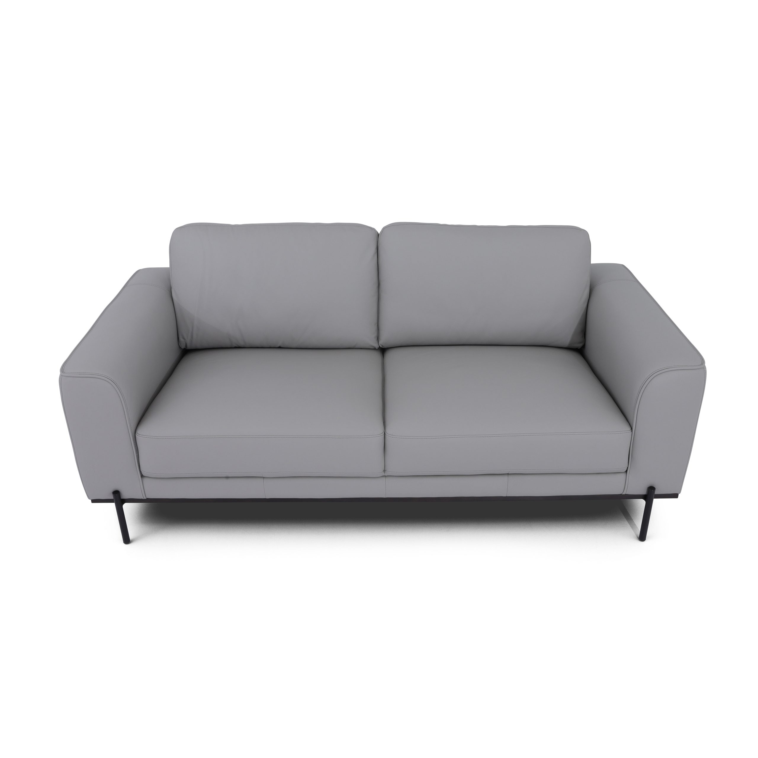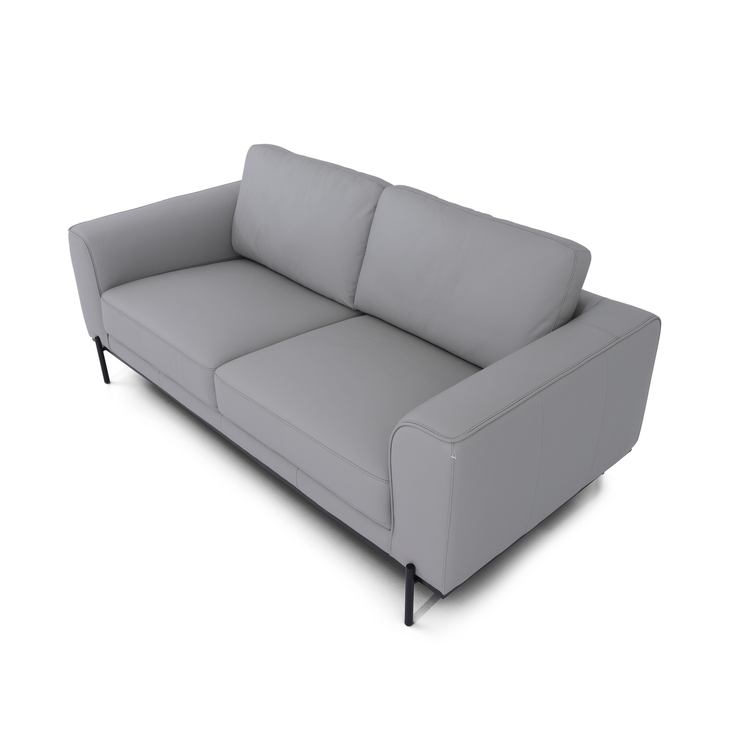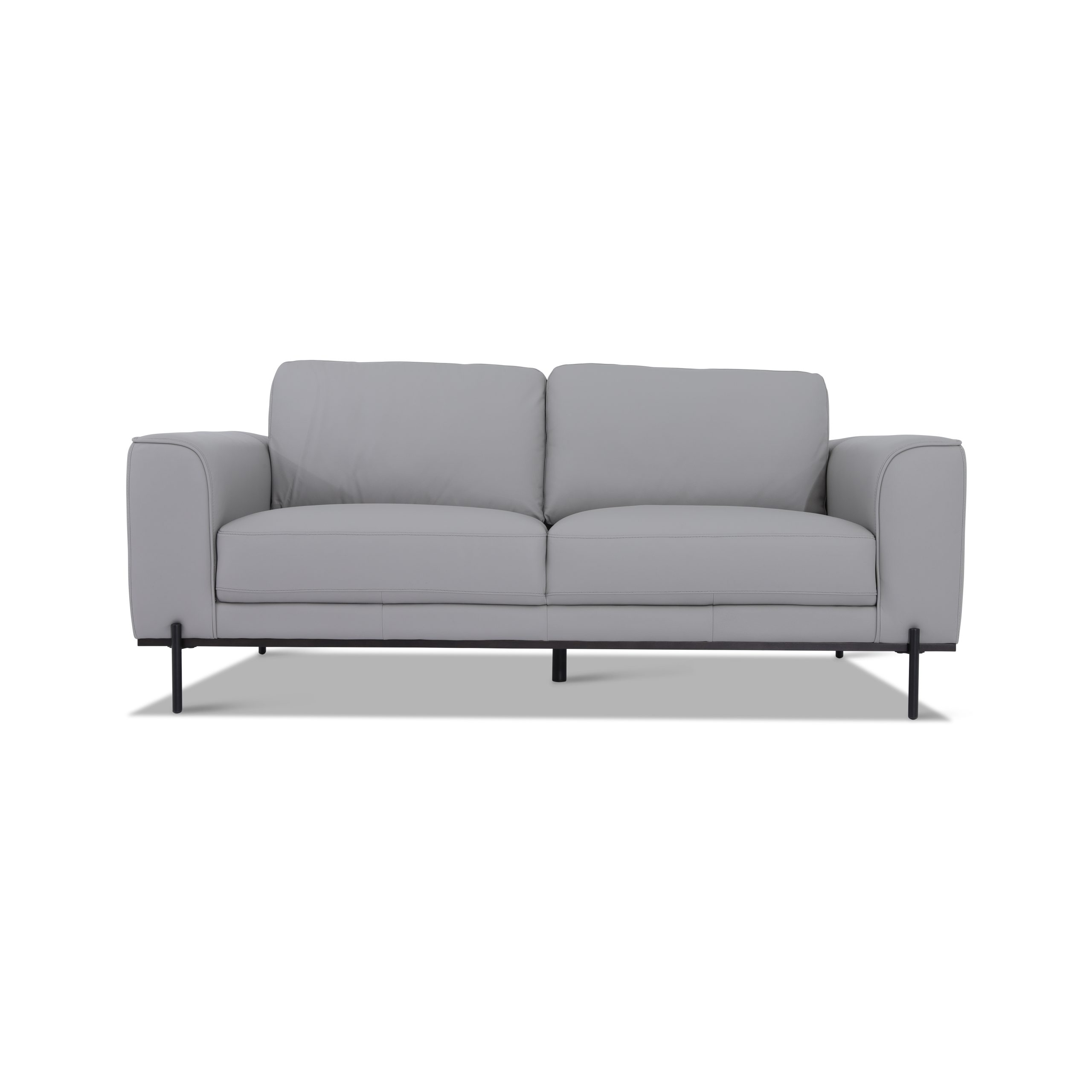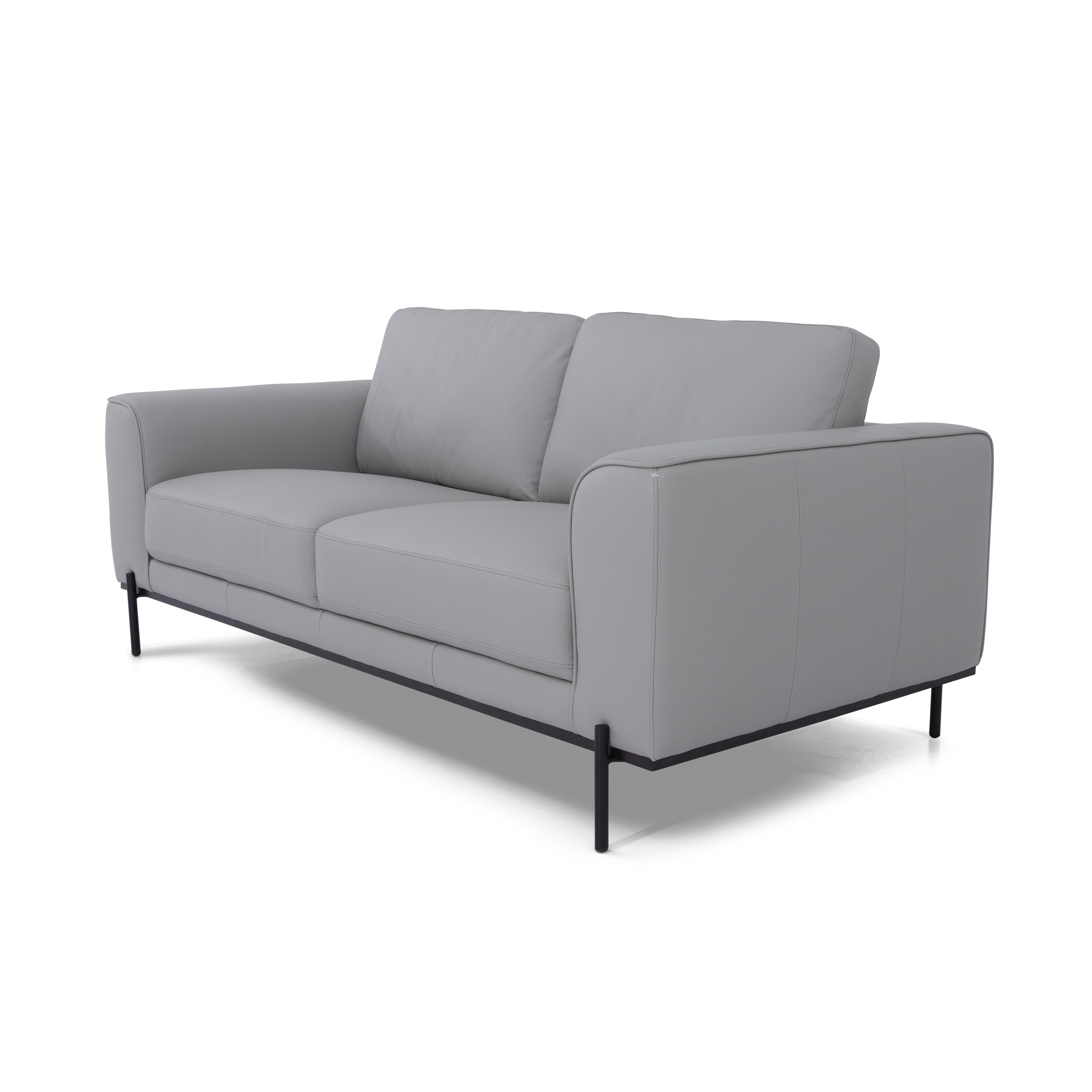 A comfortable three-seater sofa with a gray leather upholstery and a black metal frame.