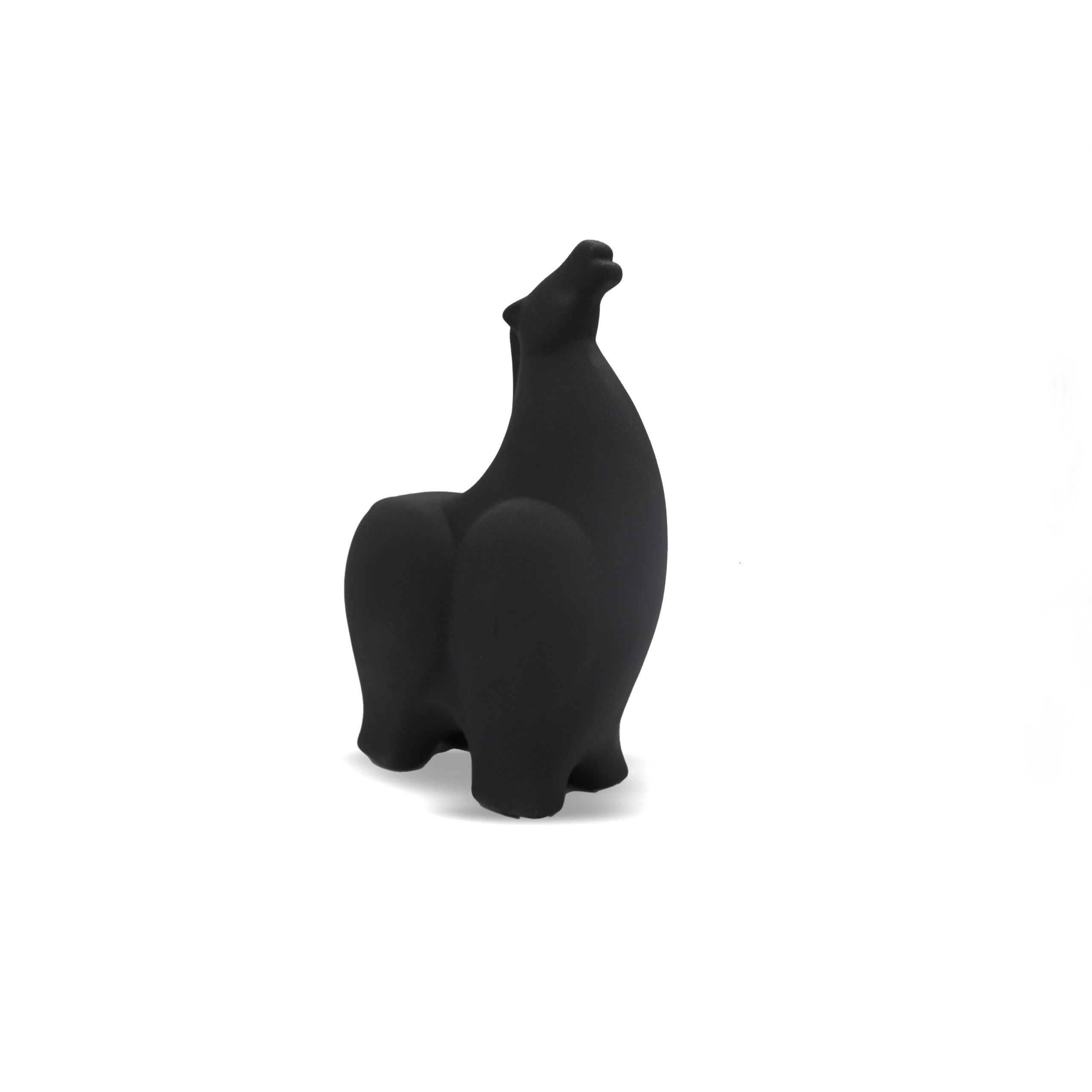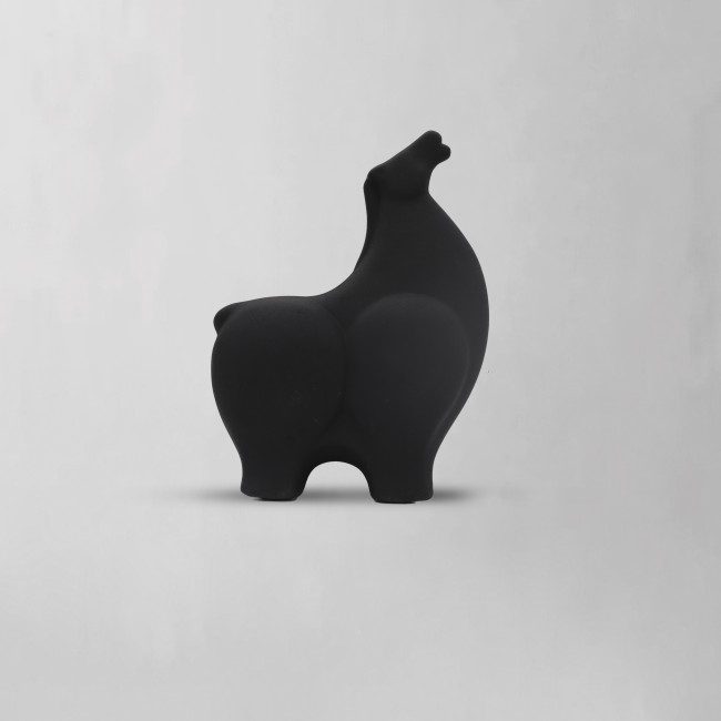 a ceramic sculpture In a matt black finish, featuring a stylized, abstract horse form looking up, with rounded contours and a minimalist design