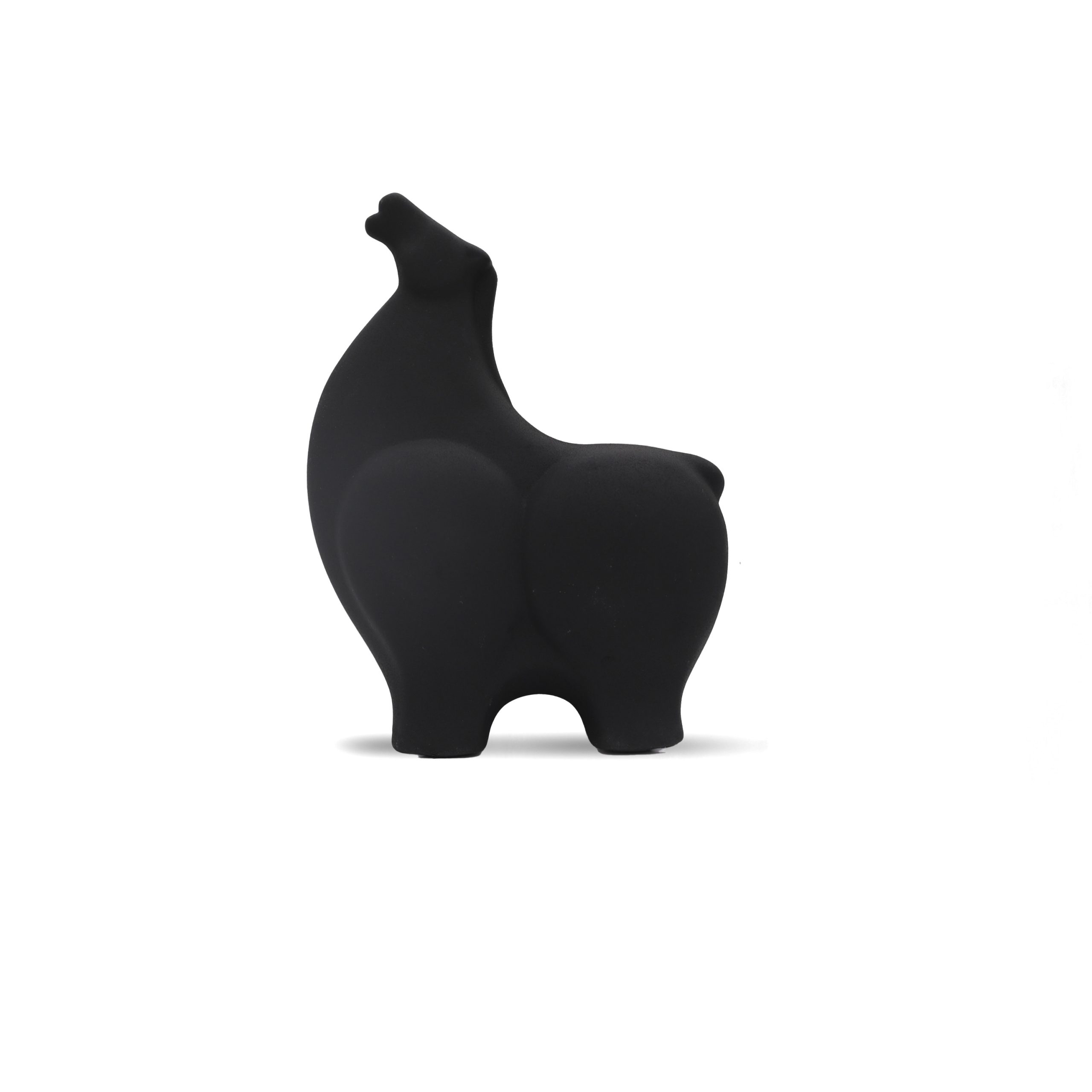 A matte black ceramic horse sculpture with rounded, stylized contours, combining minimalist design with graceful form.