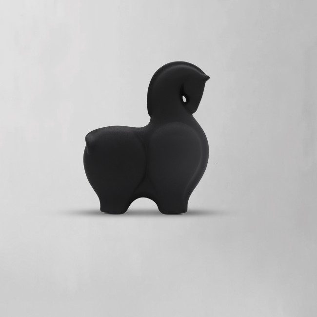 a ceramic sculpture In a matt black finish, featuring a stylized, abstract horse form with rounded contours and a minimalist design