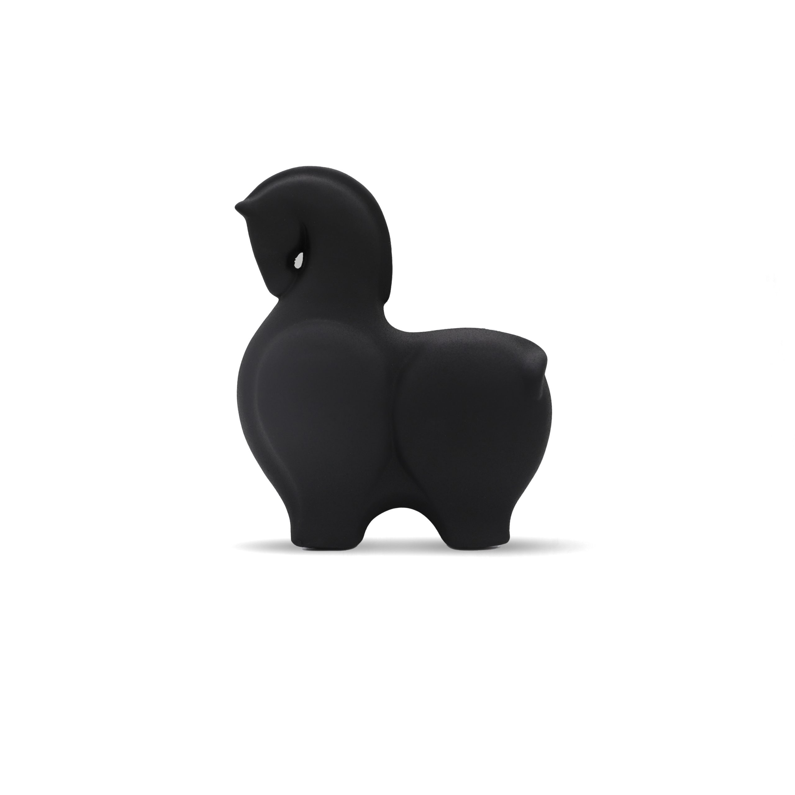 A matte black ceramic horse sculpture with rounded, abstract contours, embodying minimalist elegance.