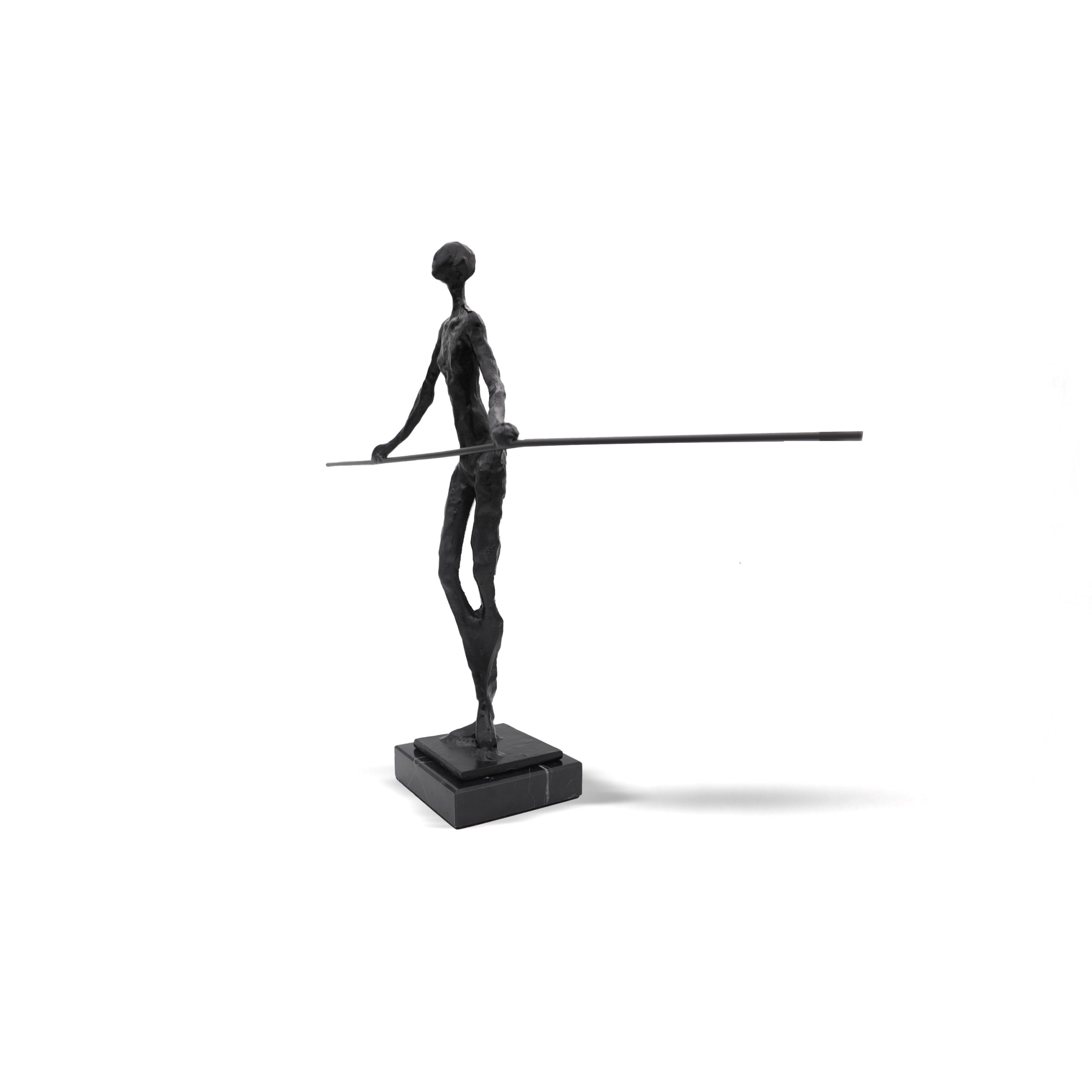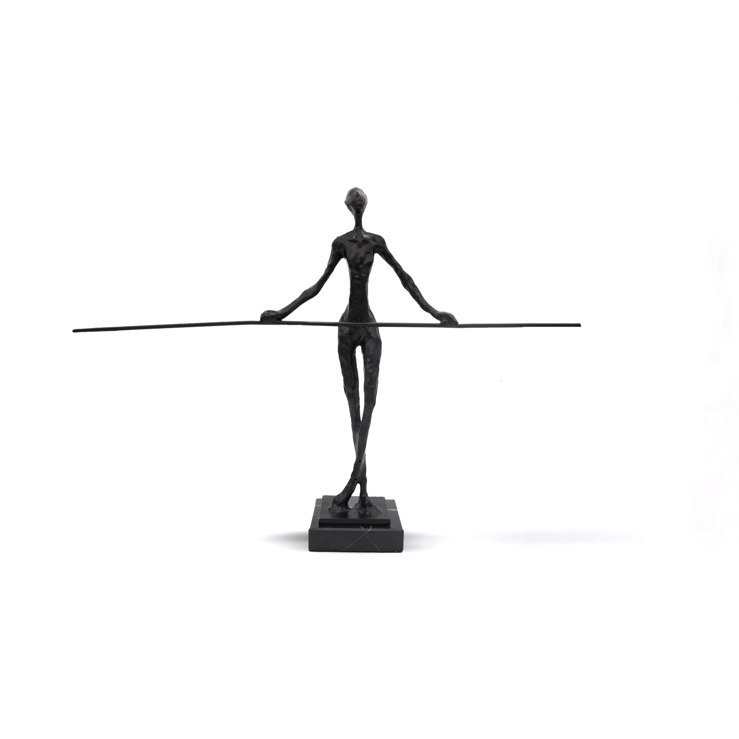 black sculpture portrays a tall, elongated figure holding a long balancing rod, capturing the essence of grace, strength, and stability in motion.