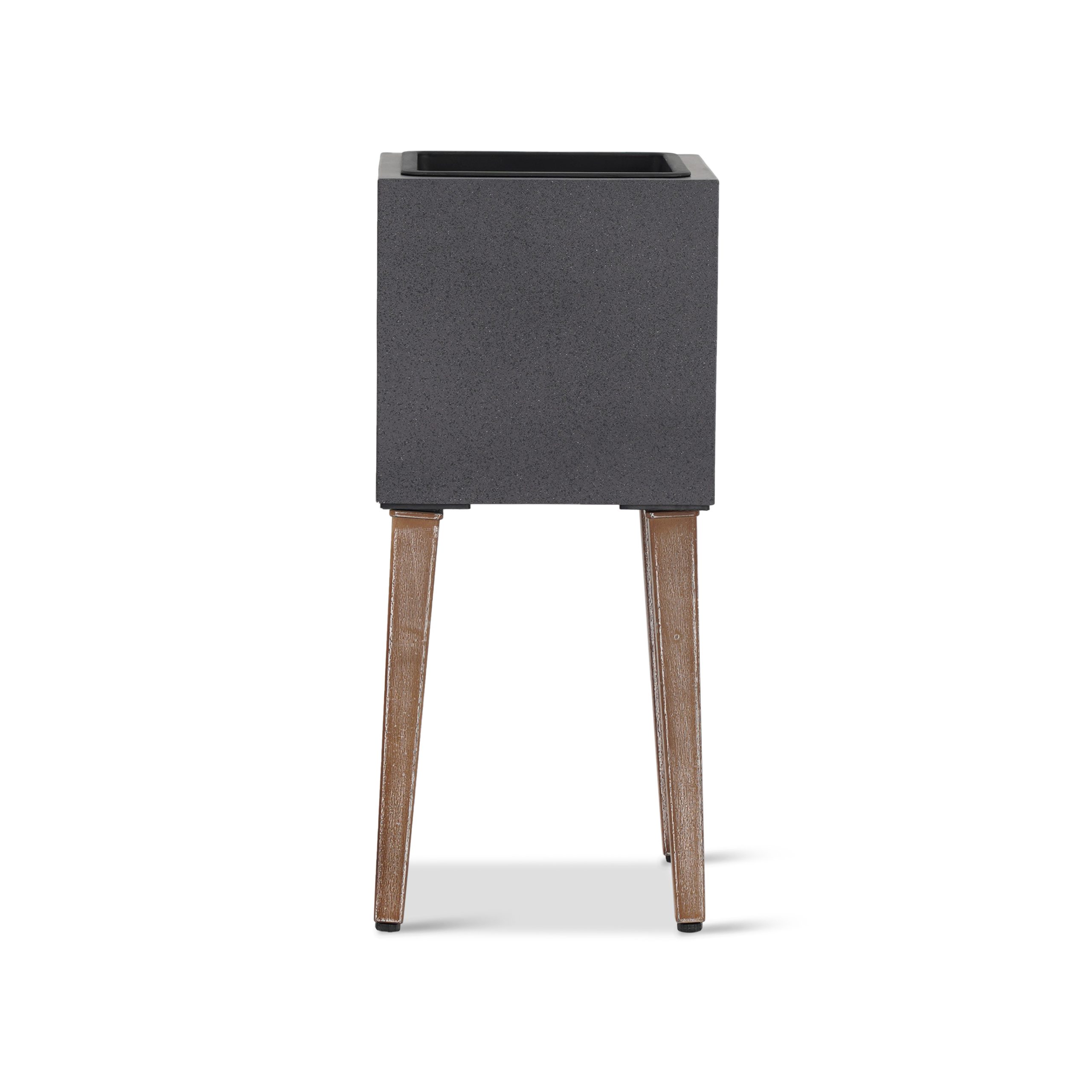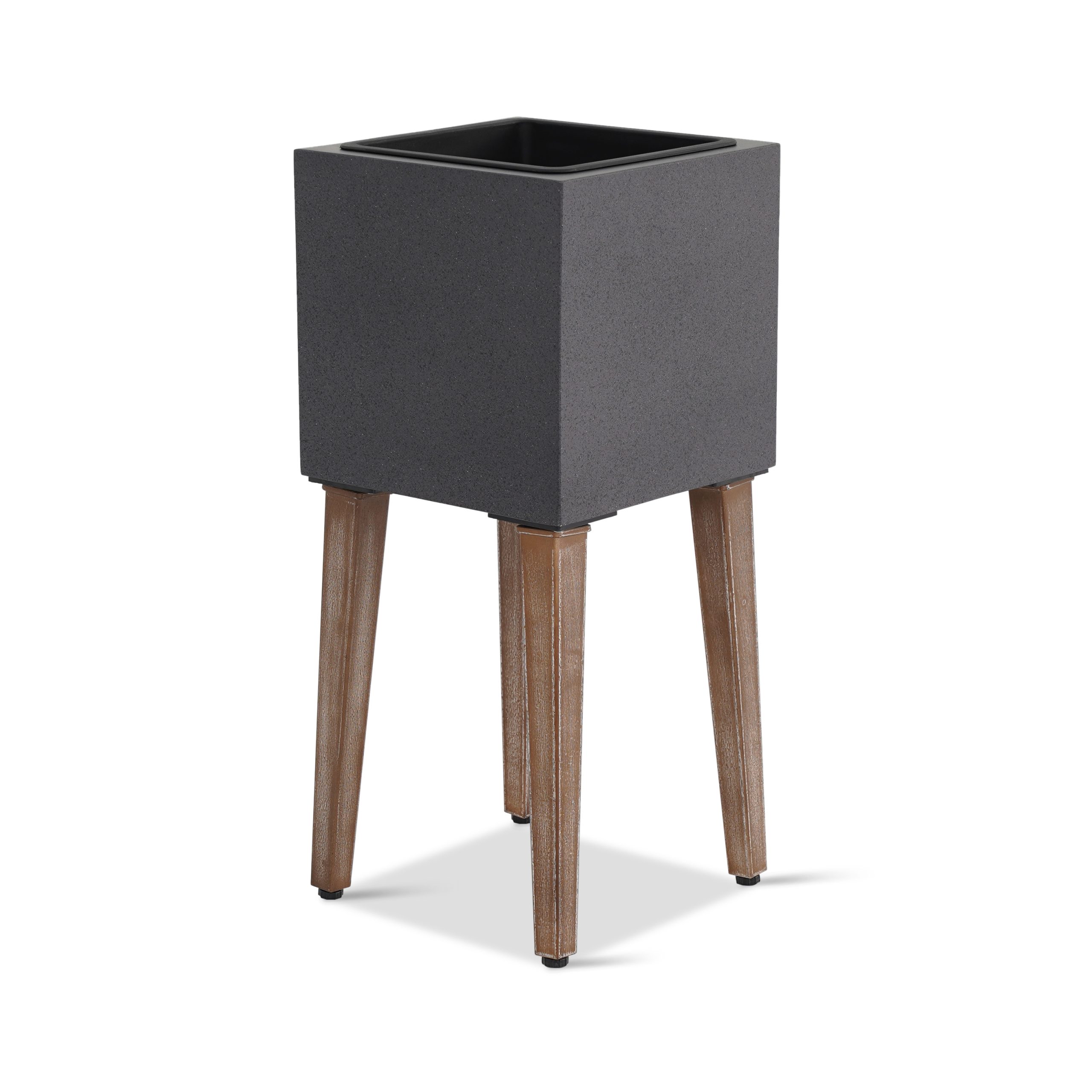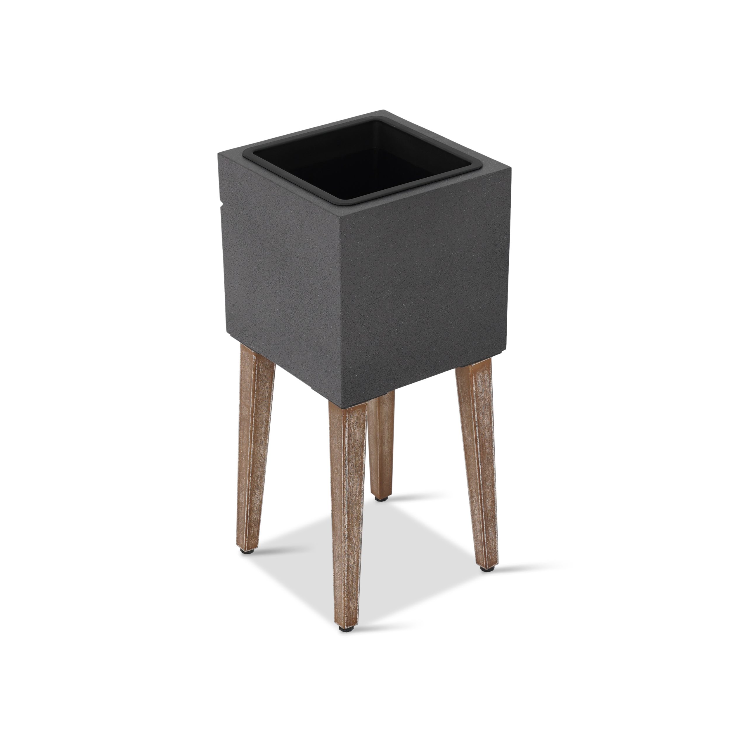 Elevated square planter in grey cement with plastic lining.