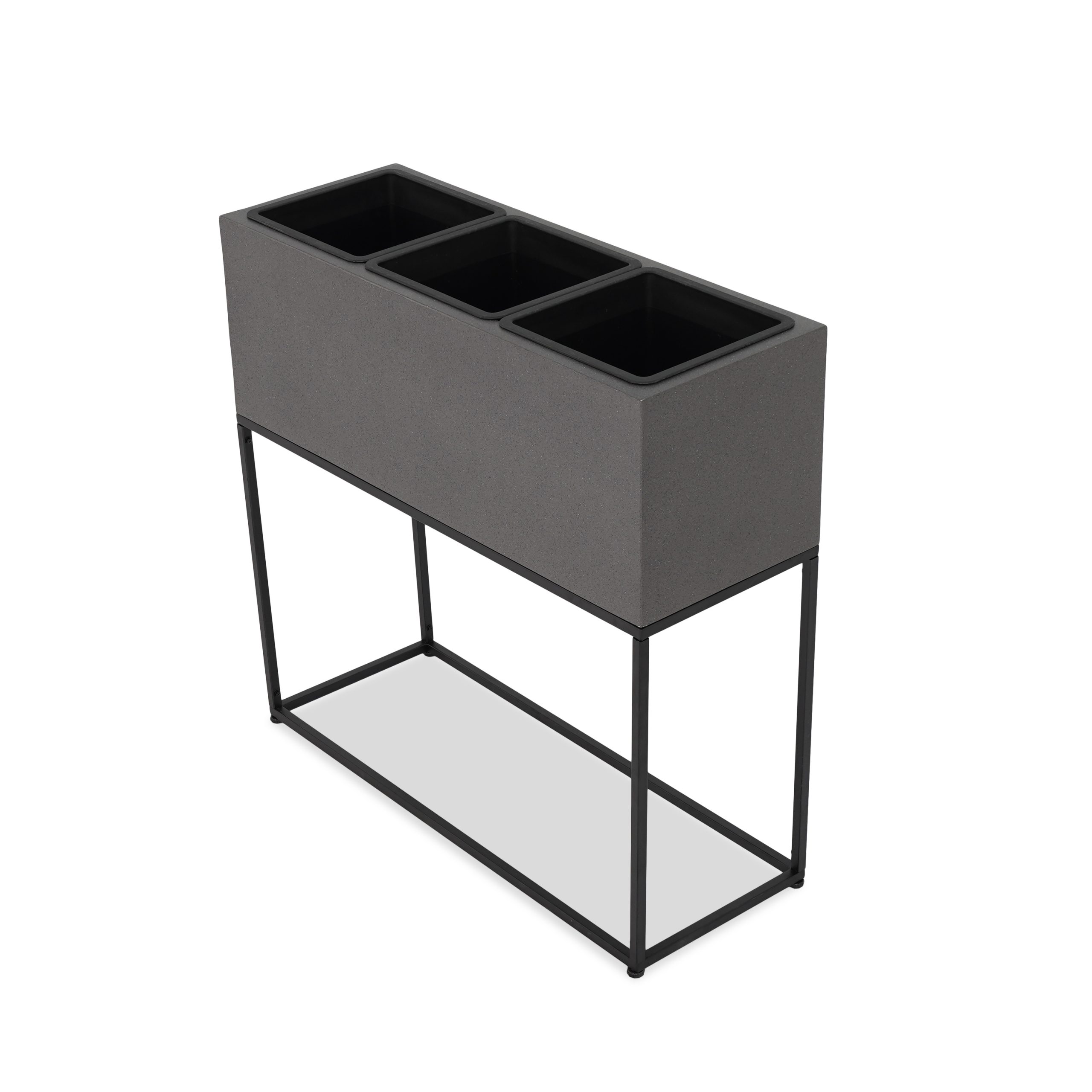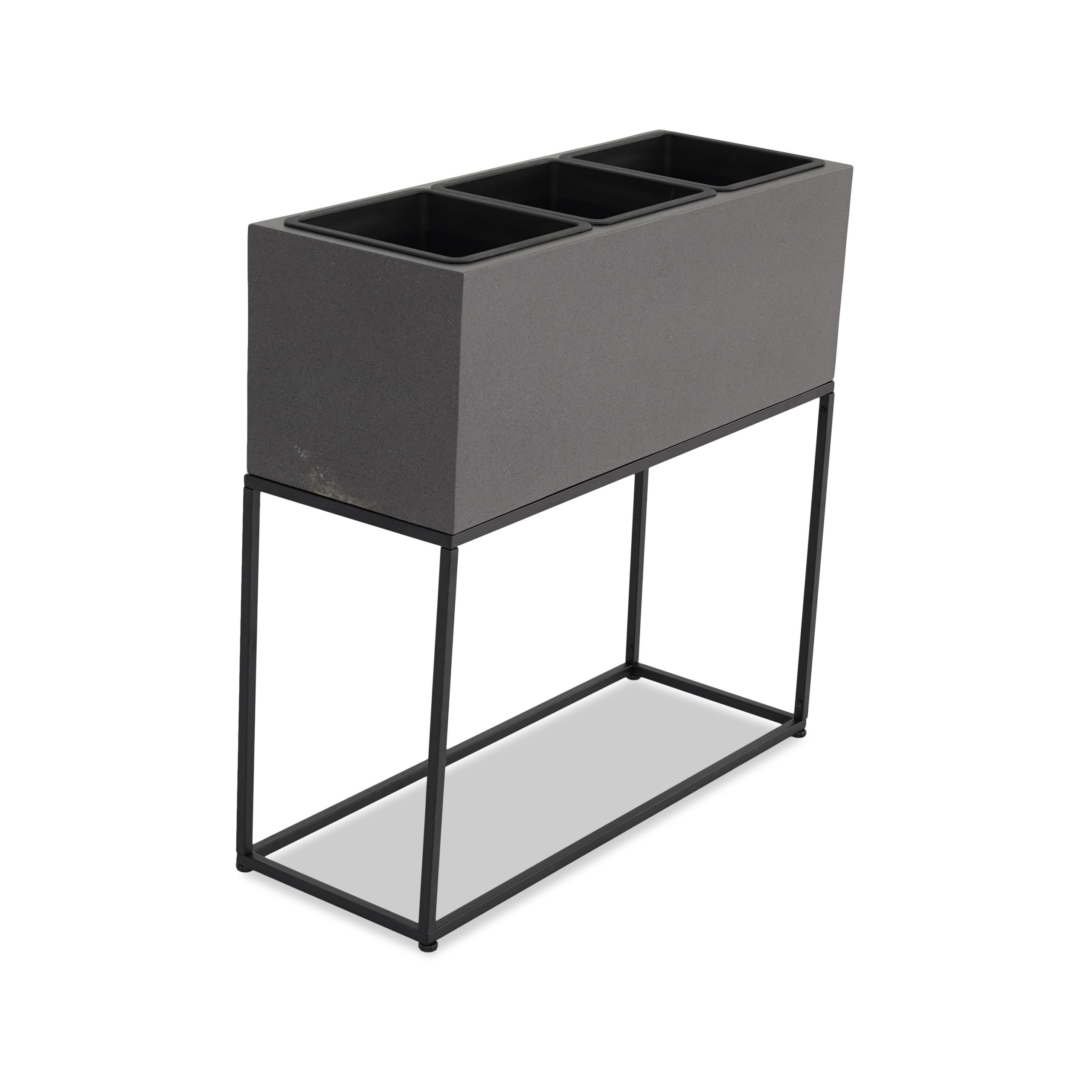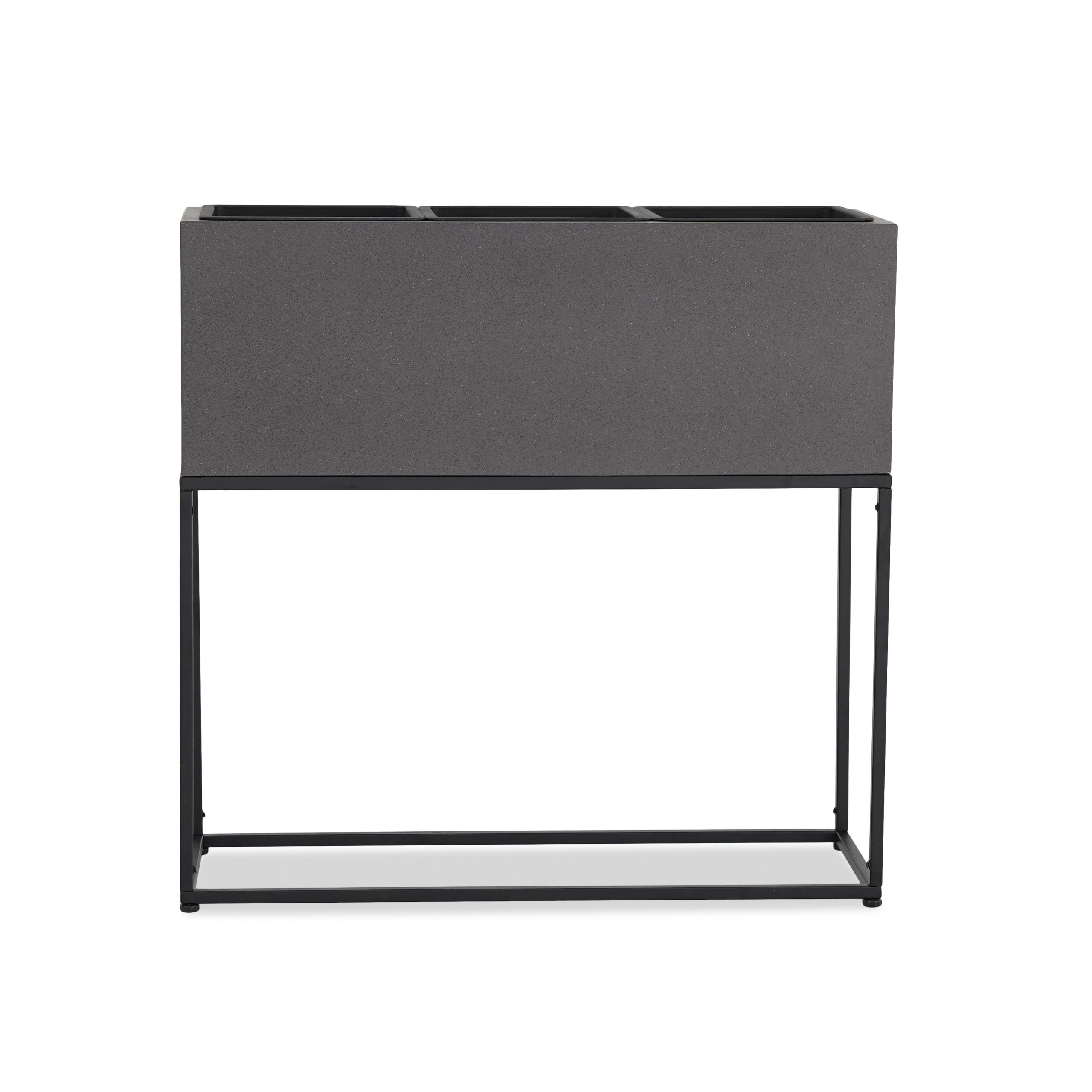 Grey cement rectangular planter elevated on a black powder coated metal base with plastic lining dividers.
