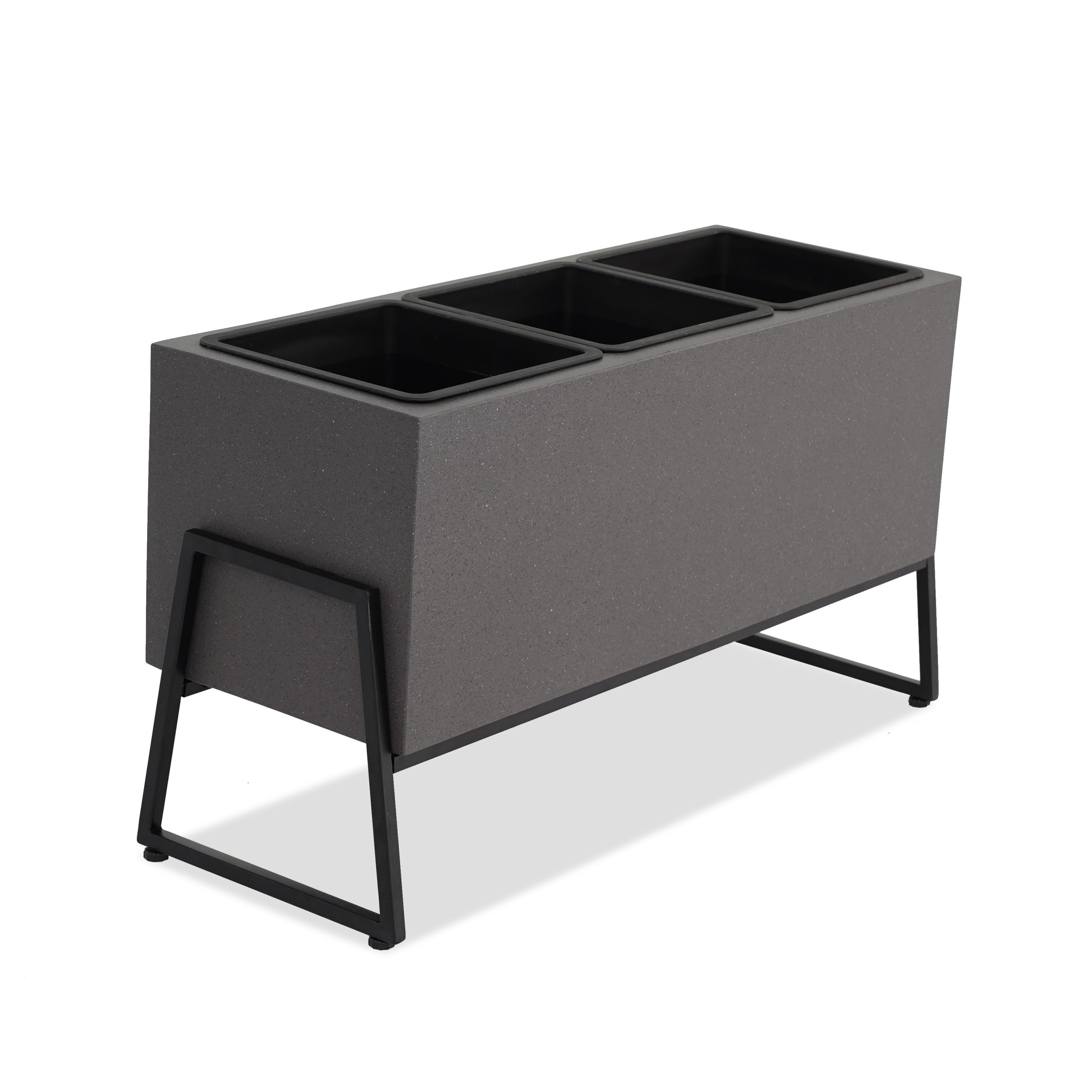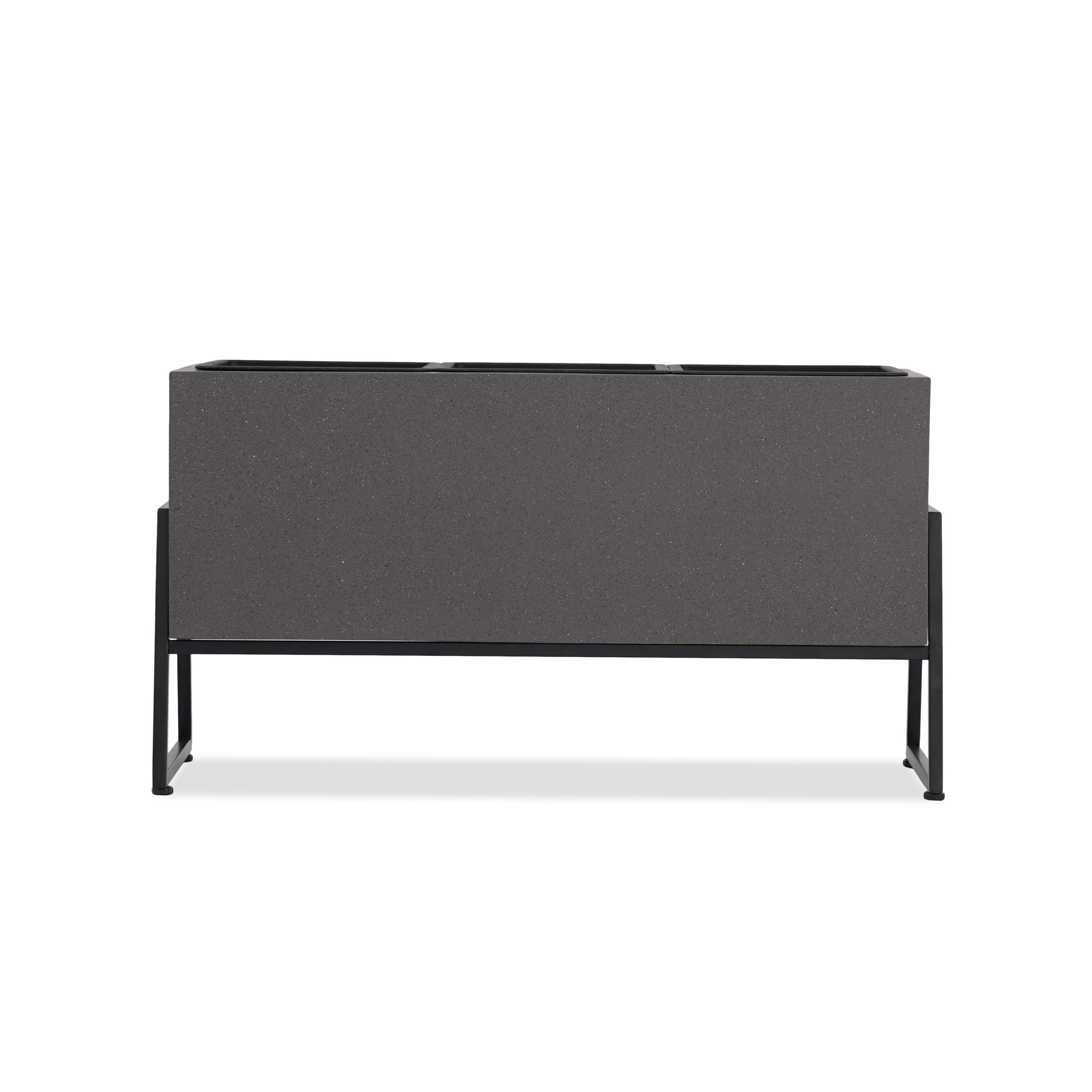Rectangular grey cement planter on black powder coated metal legs with plastic lining dividers.