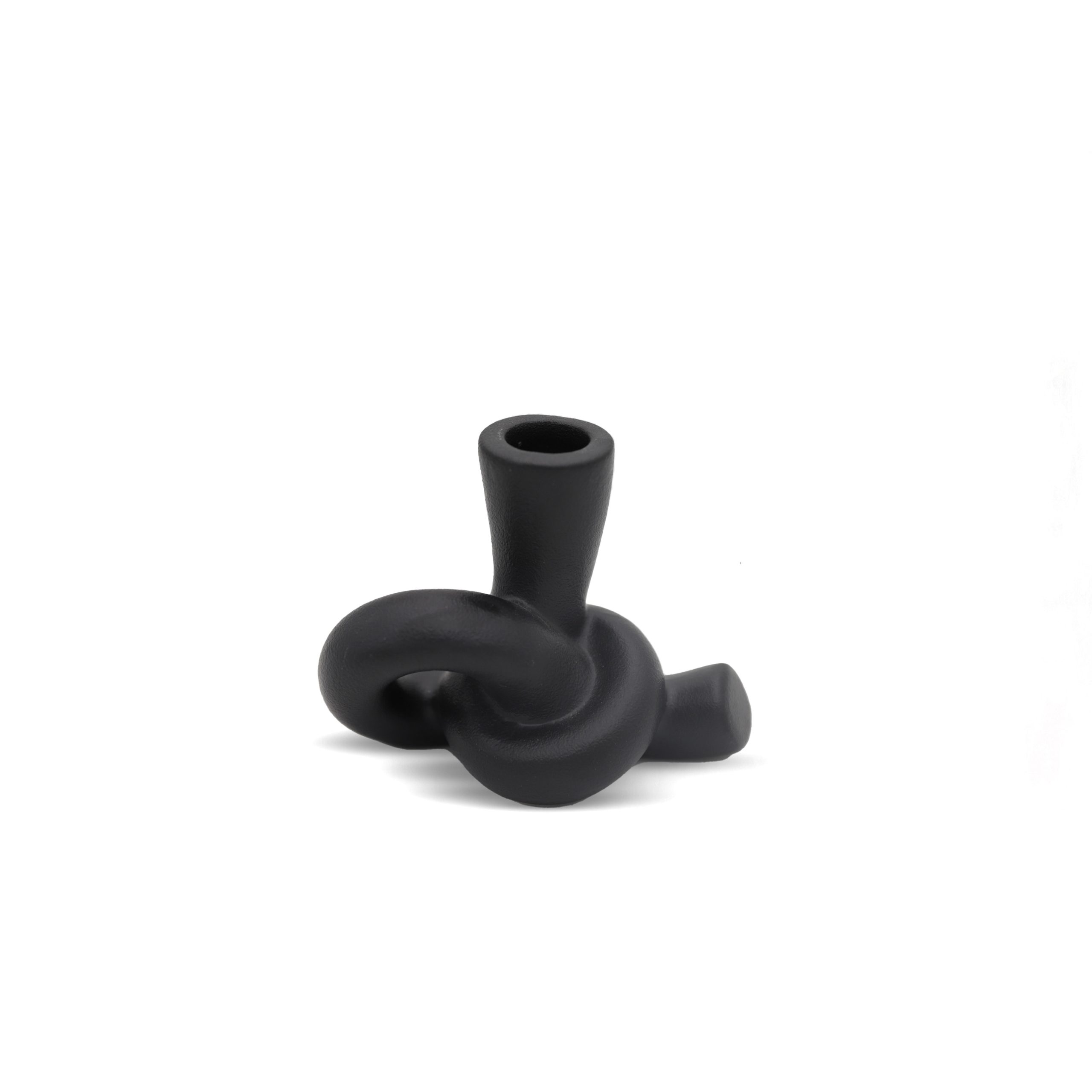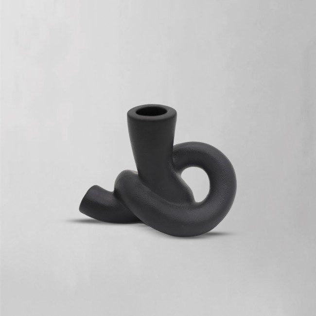 a ceramic sculpture with a smooth, semi-matt black finish and an abstract twisted loop design.