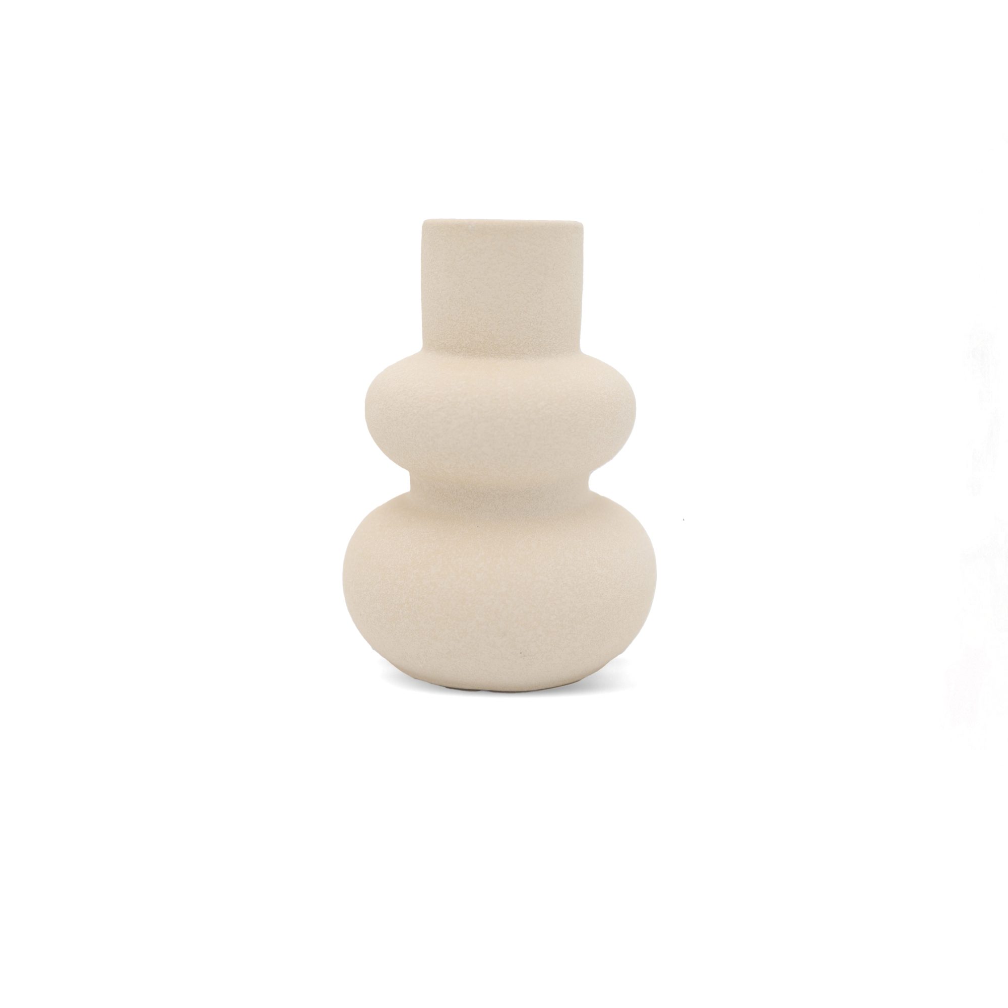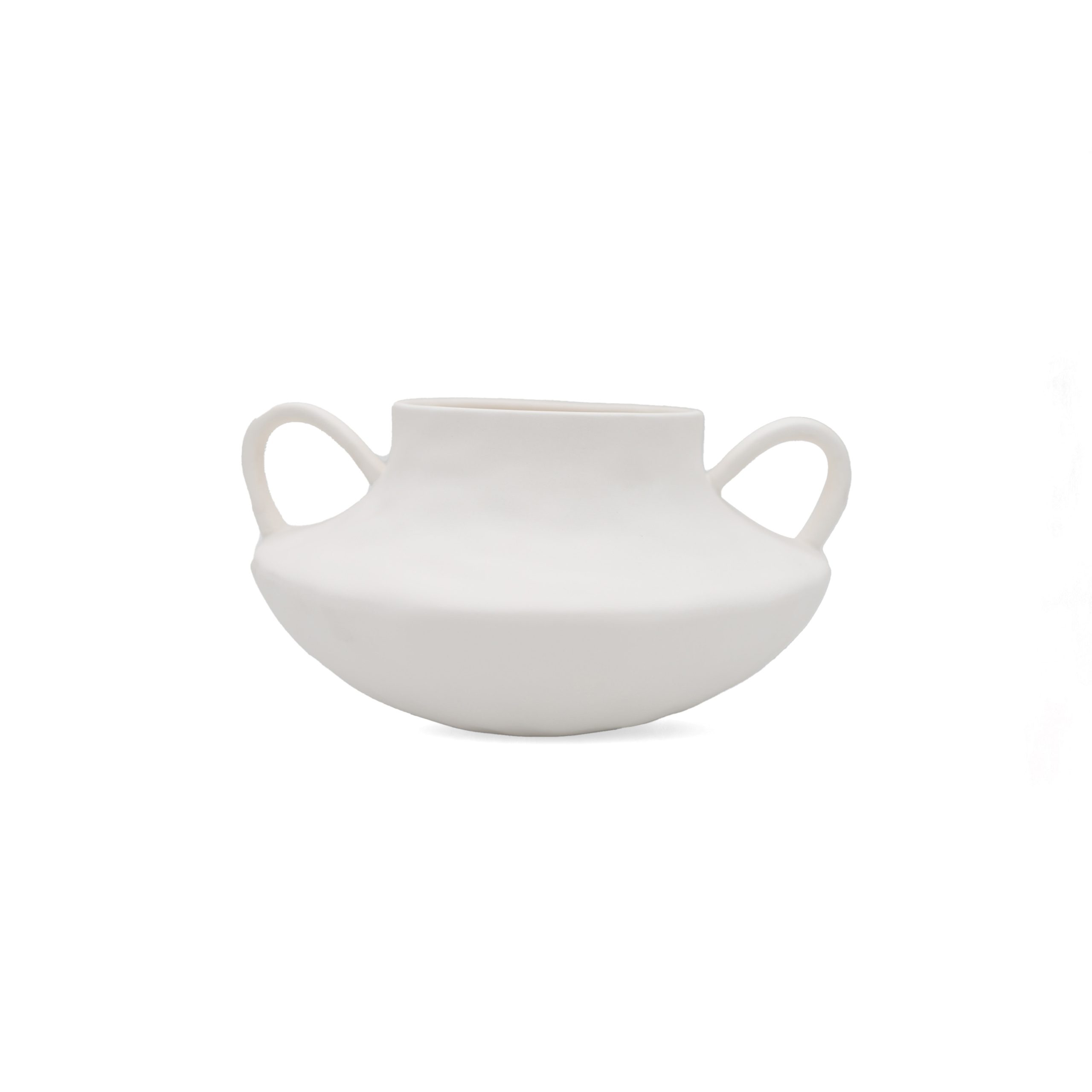 A matt white ceramic vase with a rounded body and elegant curved handles, blending modern design with timeless inspiration.