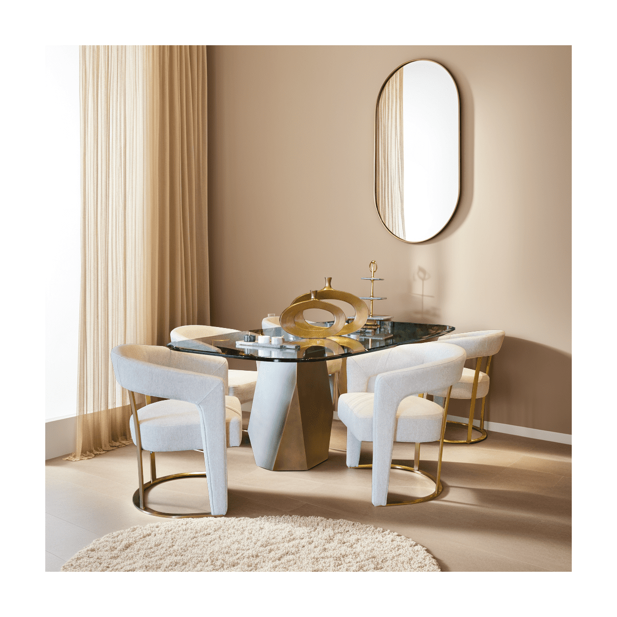 يتميز الكرسي بتصميم منحني أنيق، يوفر الراحة ويثير الإعجاب. صنعت اللمسات الذهبية بعناية فائقة، وهي تندمج بسلاسة في تصميم الكرسي وتضيف لمسة من التألق والرقي