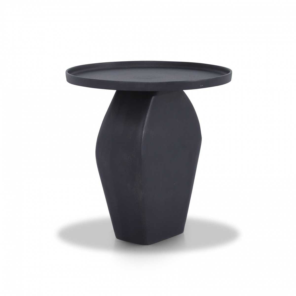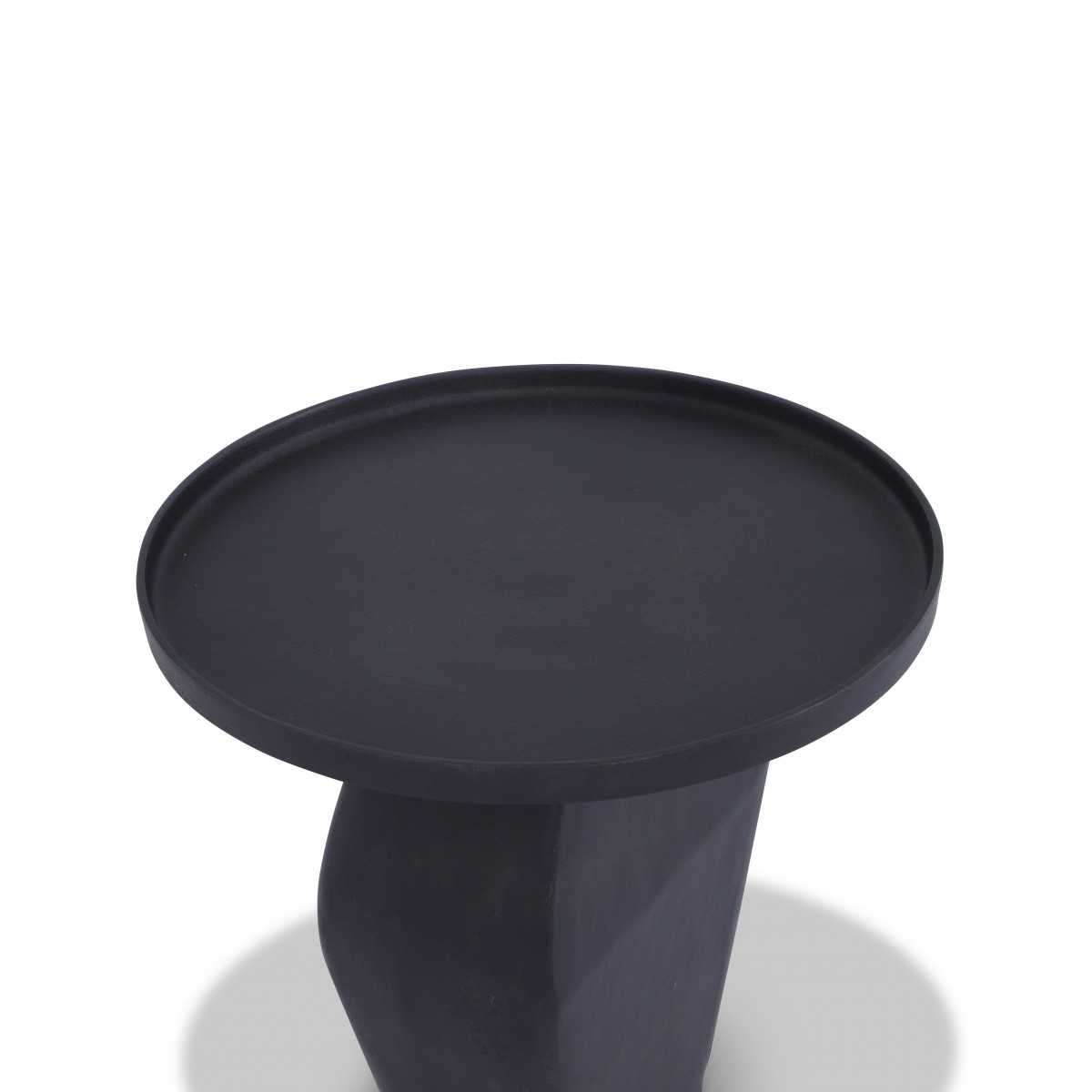 طاولة جانبية ذات سطح أسود دائري وقاعدة منحنية.