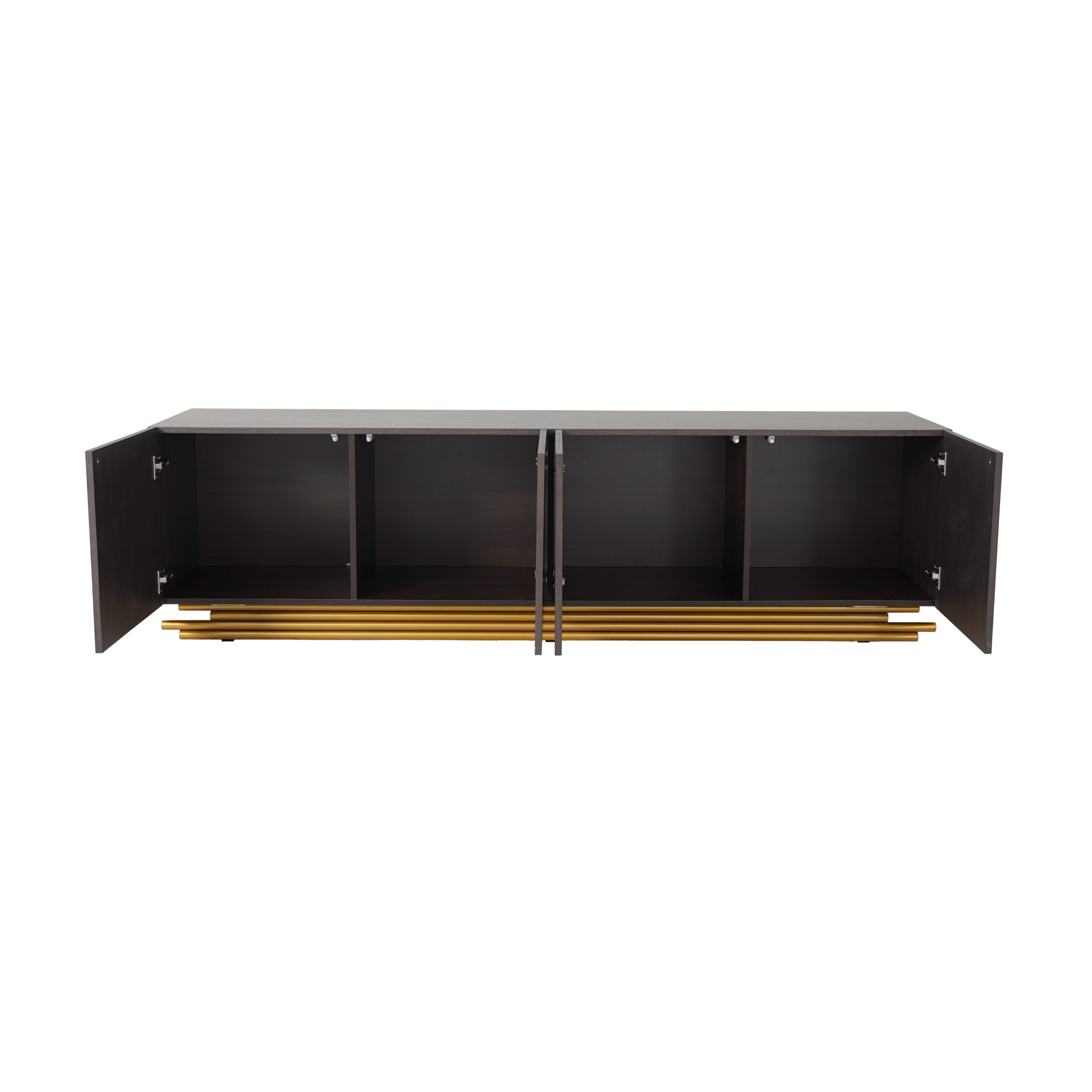 Oak Wood TV unit in smoky brown color & brushed brass metal base. To be wiped with a soft cloth
