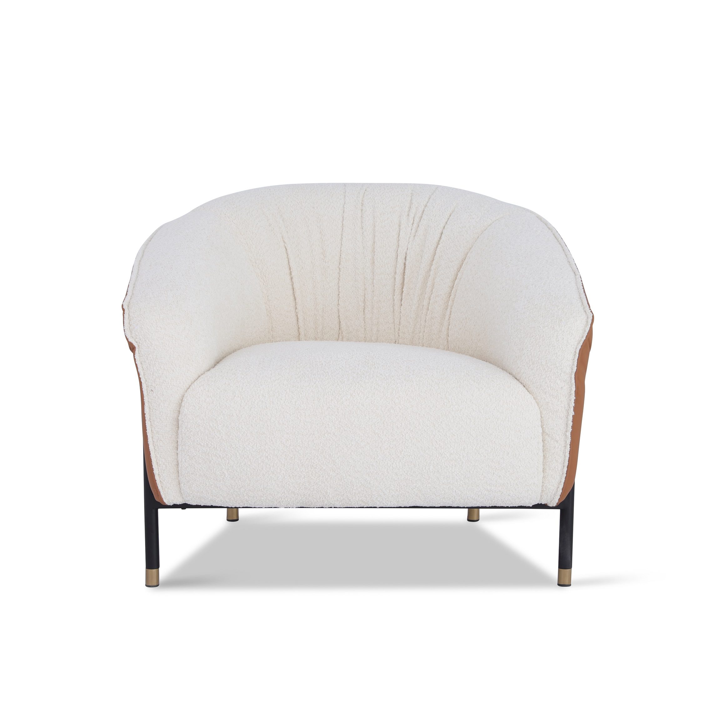 This stylish piece features off-white and camel boucle/micro leather fabric, paired with a black powder-coated metal base.