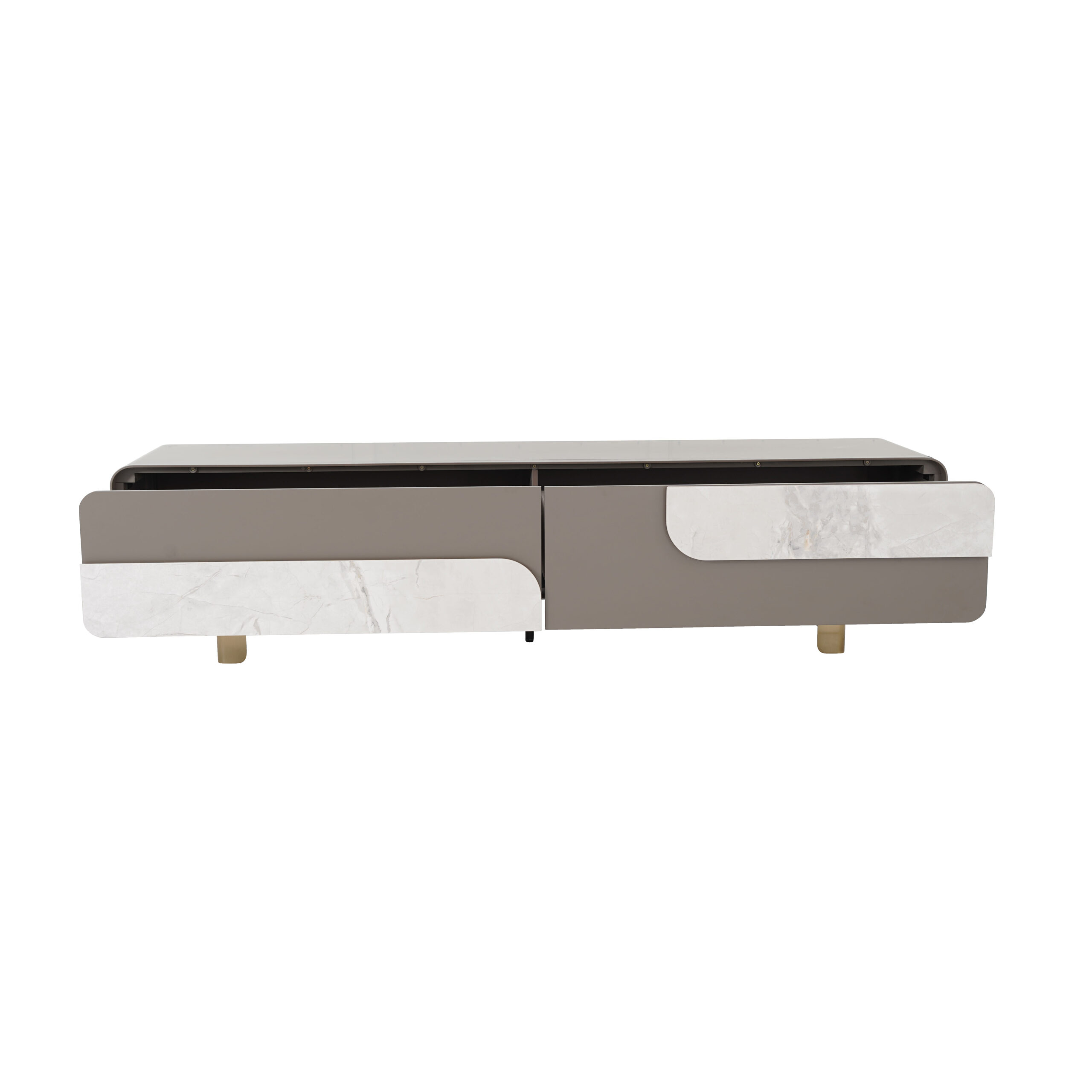 Taupe colored wood TV unit with white ceramic inlays & a brushed brass metal base. To be wiped with a soft cloth