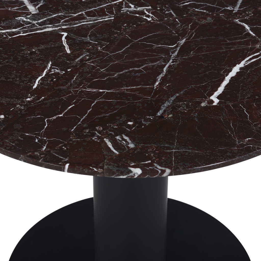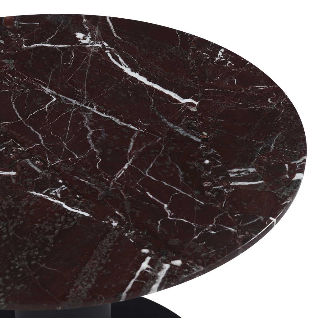 Coffee table in rosso levanto marble top & black powder coated metal base. To be wiped with clean water. Heat resistant ≤100℃