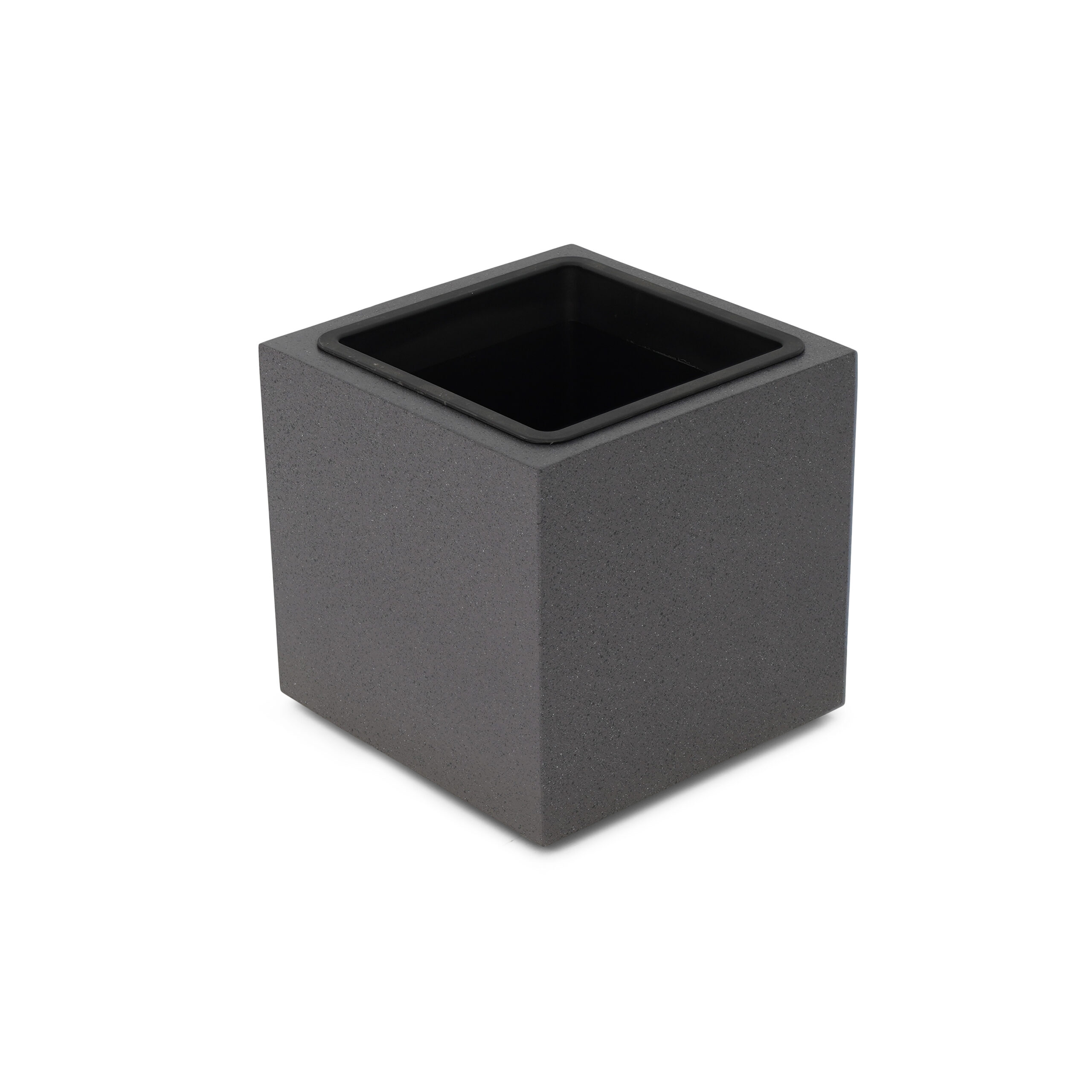 Medium grey cement square planter with plastic lining.