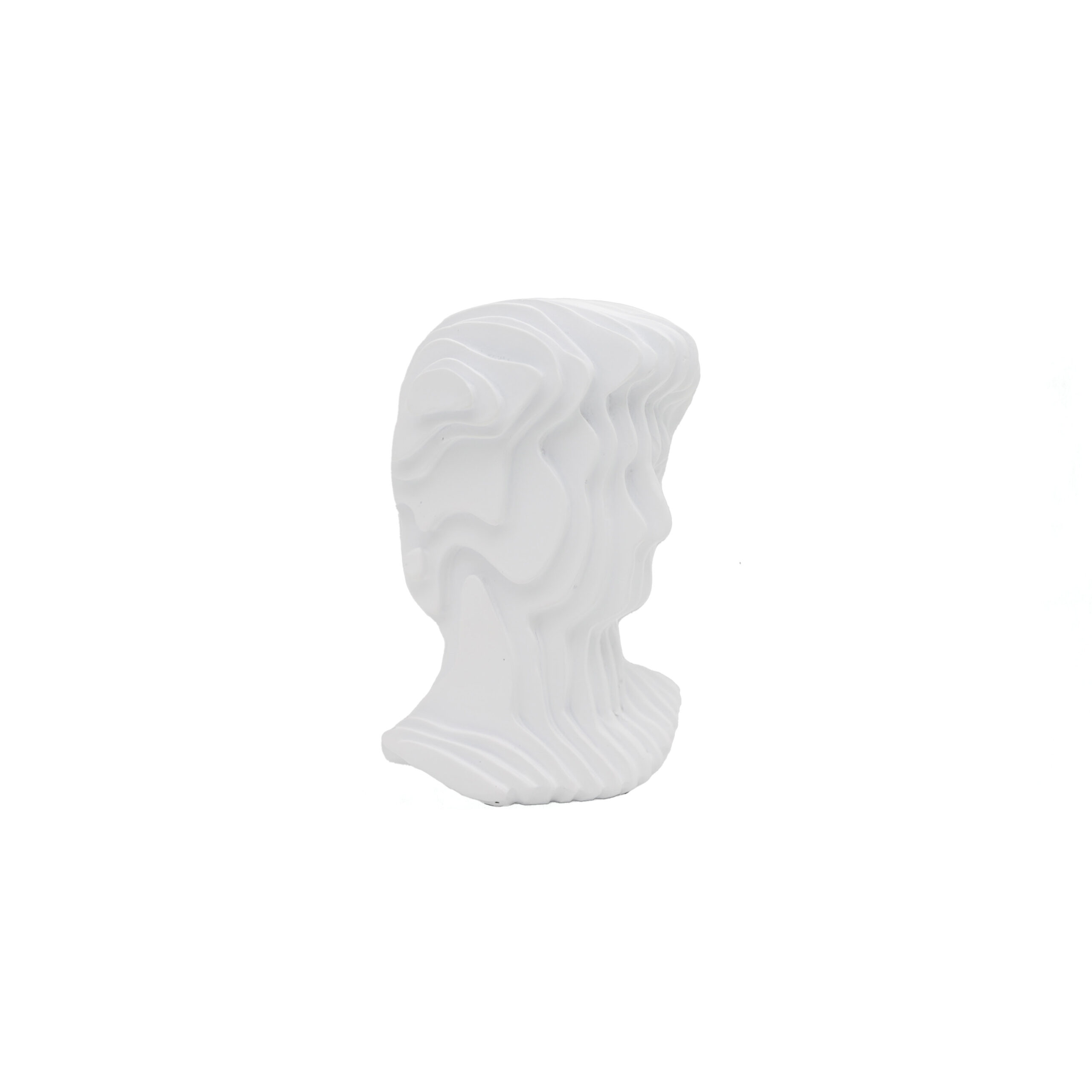 Abstract ceramic man figure with striped details in matte white, a sleek and modern sculptural piece.