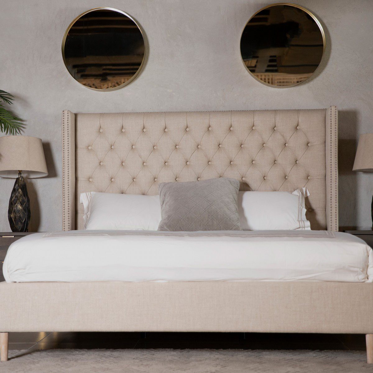 You will wait for bedtime impatiently! A fully upholstered king bed in beige linen fabric, a high diamond tufted headboard and some light toned wooden legs.