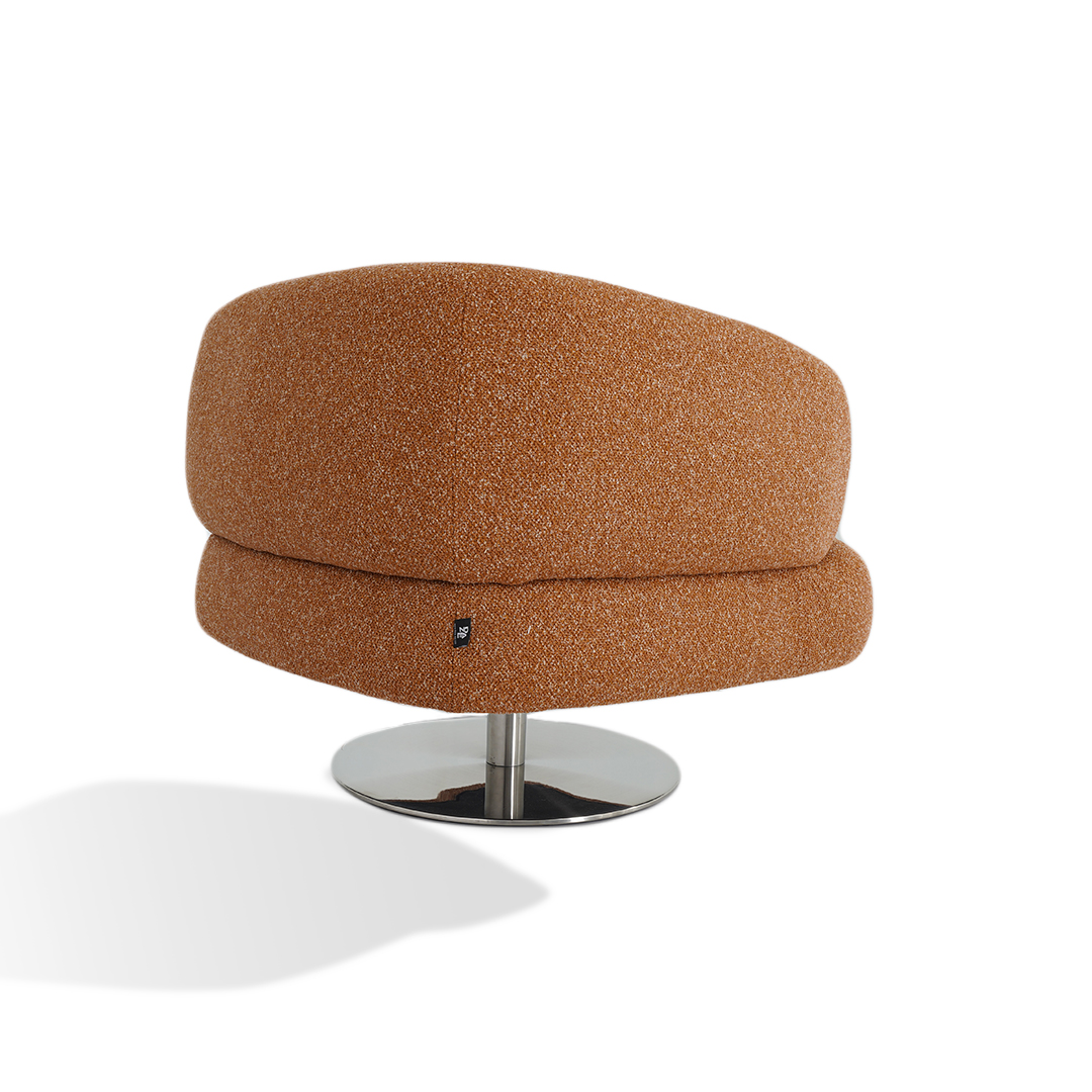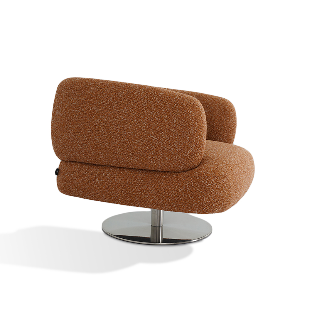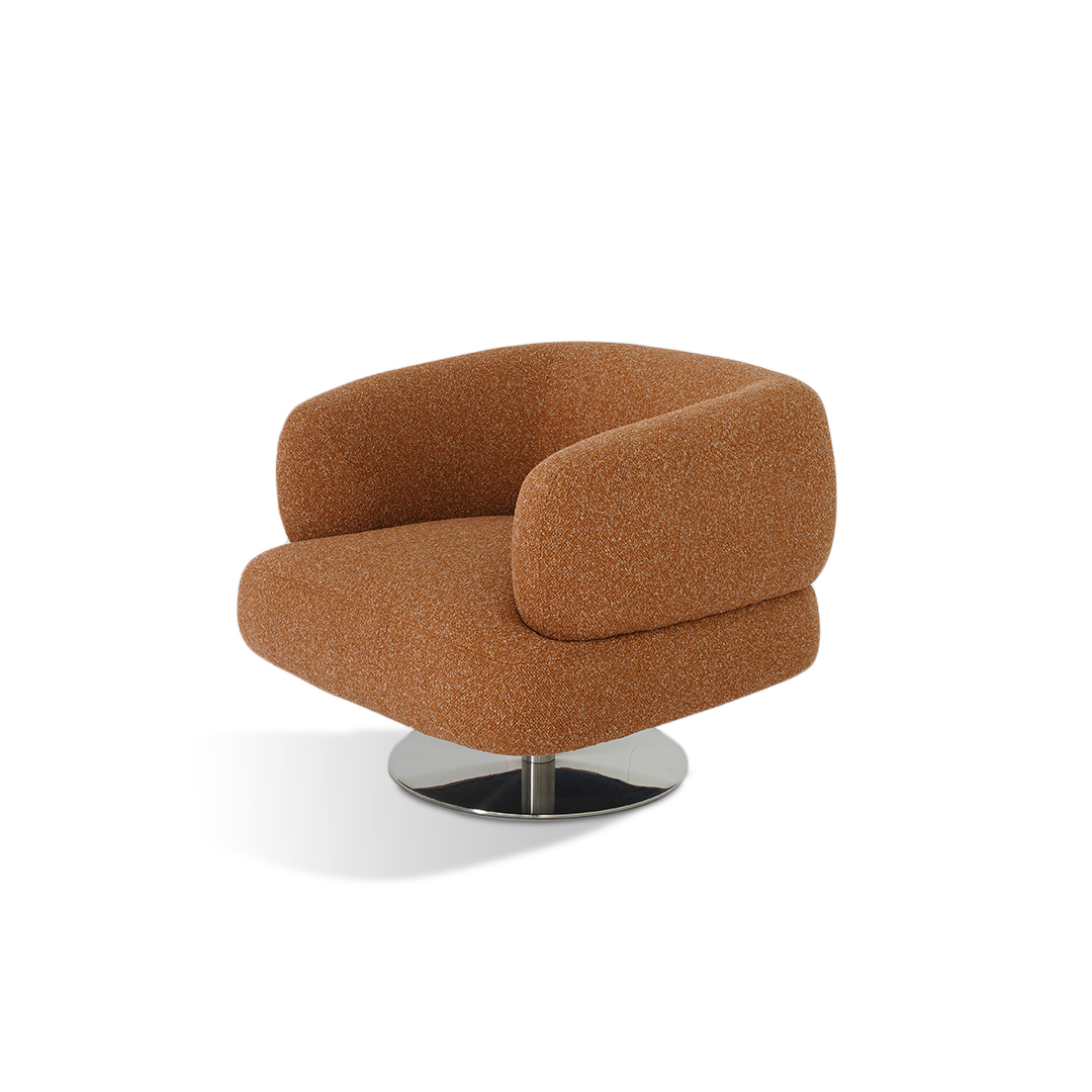 This swivel armchair in brique linen tweed and silver metal base is perfect for those who love comfort with a little spin.