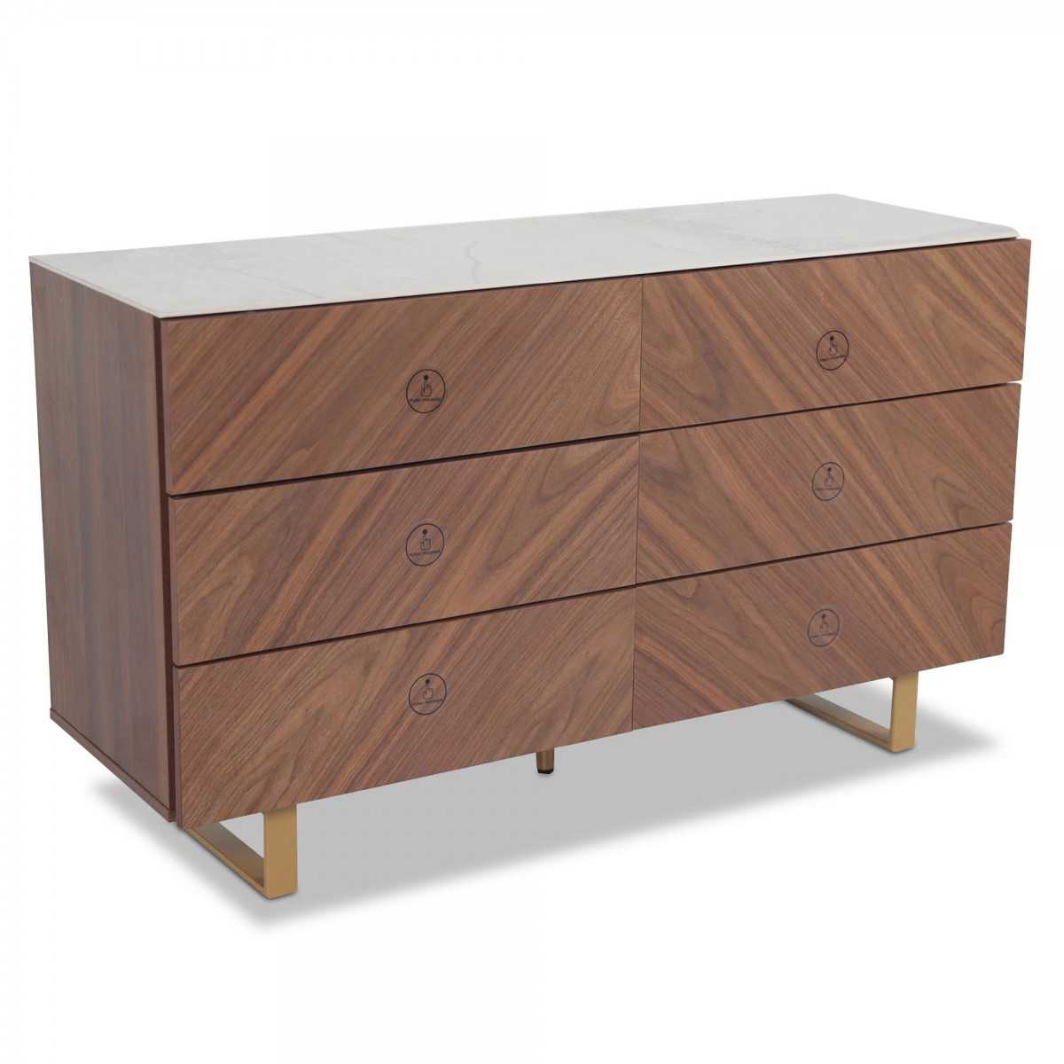 This dresser features a white marble top and a warm wood finish, creating a chic and inviting look.