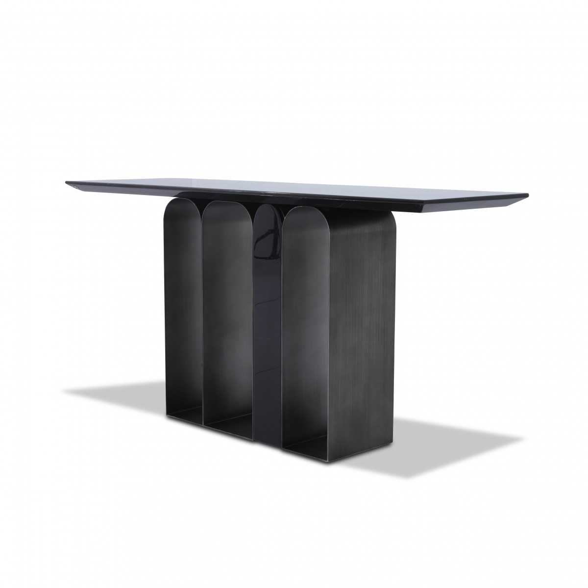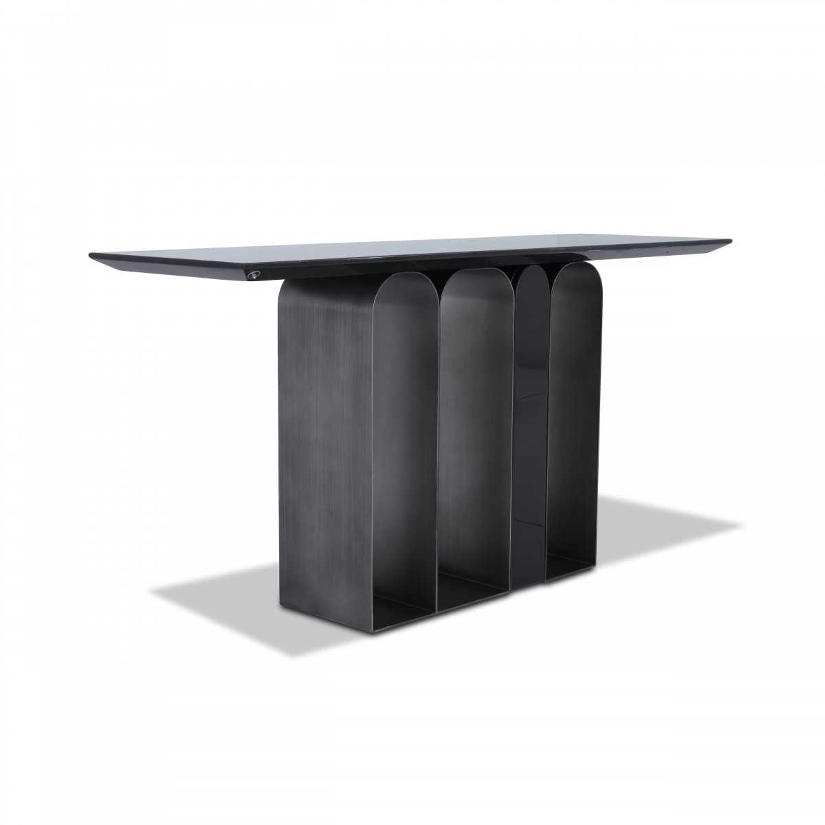 Featuring a black Marquita marble top, this console exudes quiet luxury. The stainless steel base, finished in gun metal, complements the marble perfectly.