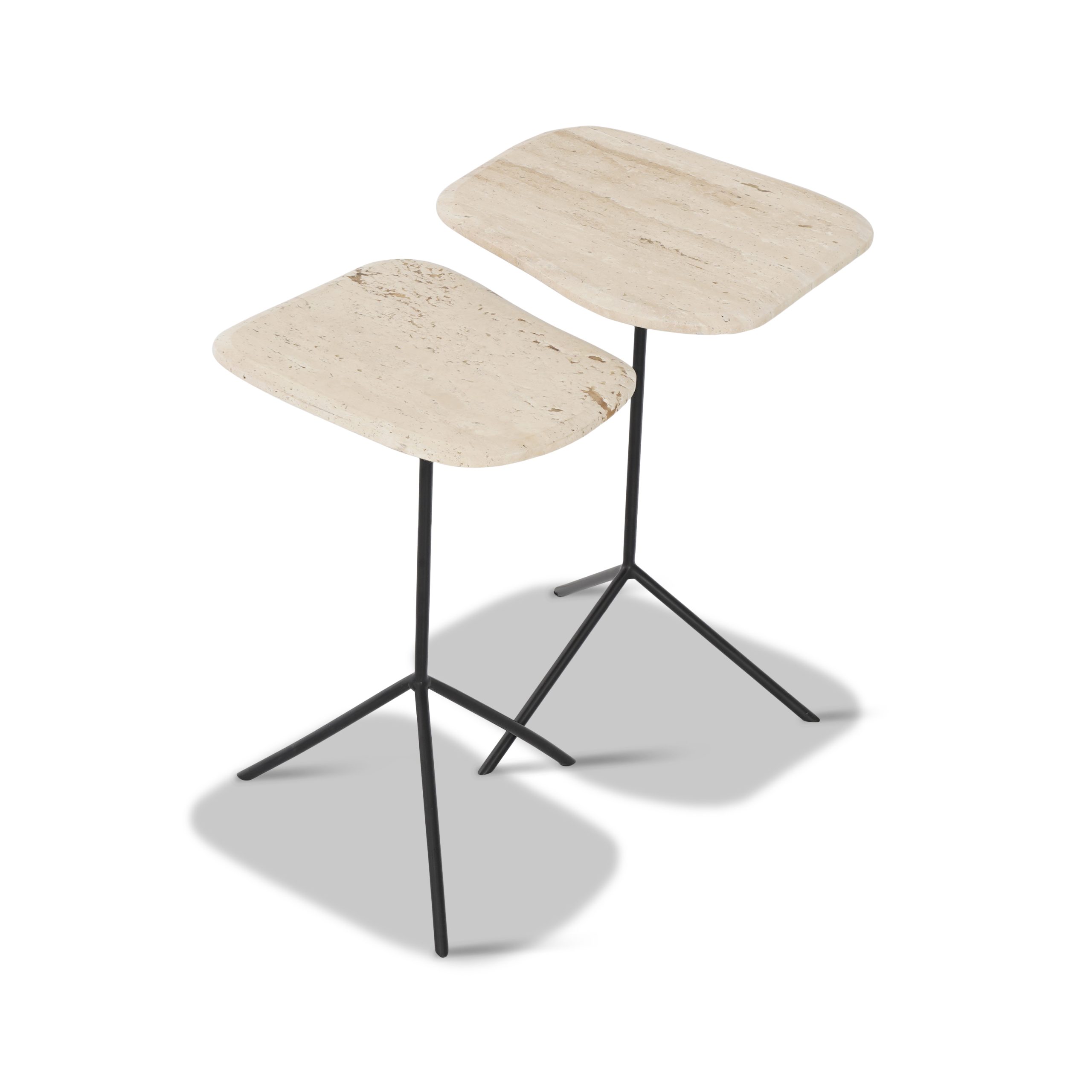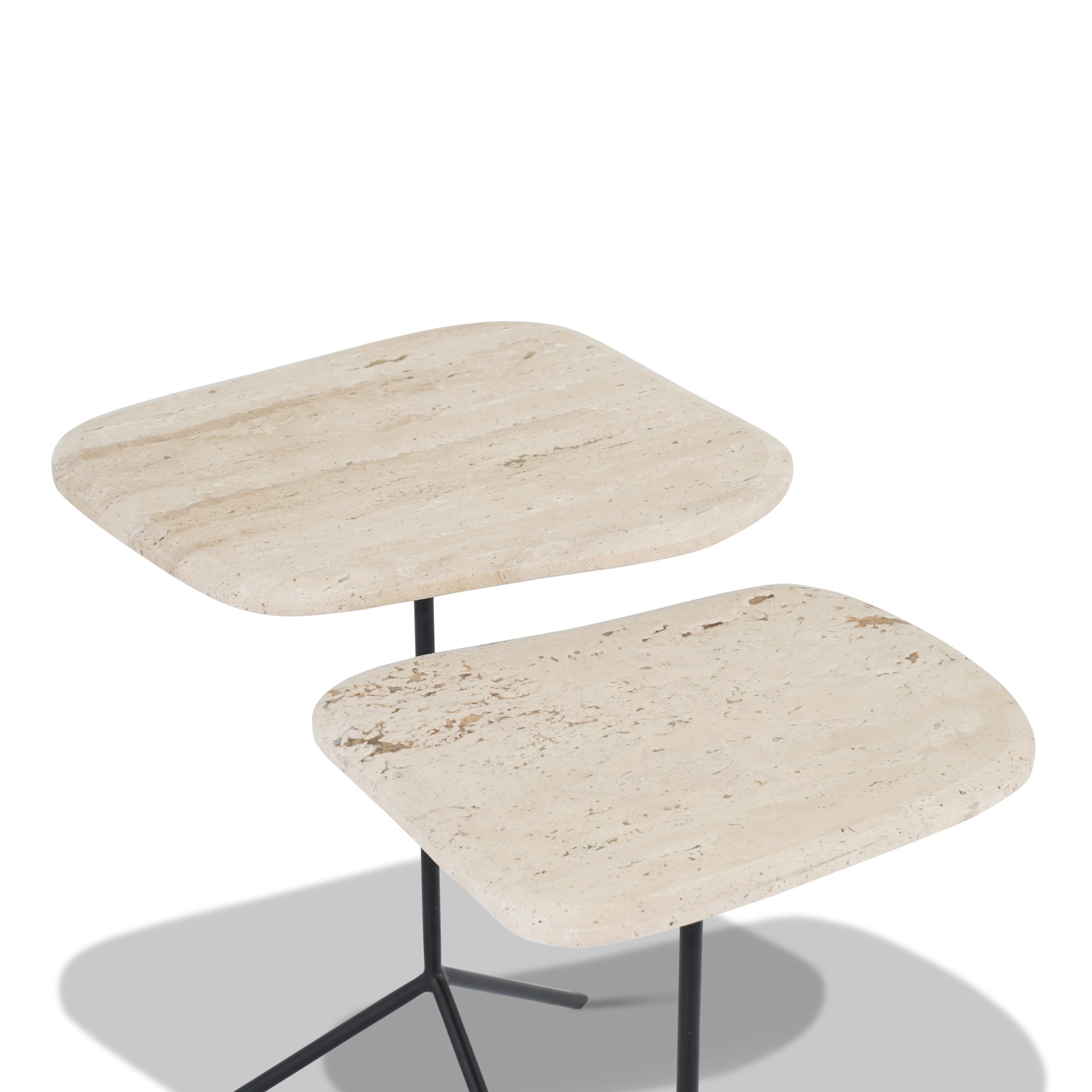 Soft tones, strong structure. This beige travertine side table is naturally elegant, supported by a sturdy black metal base.