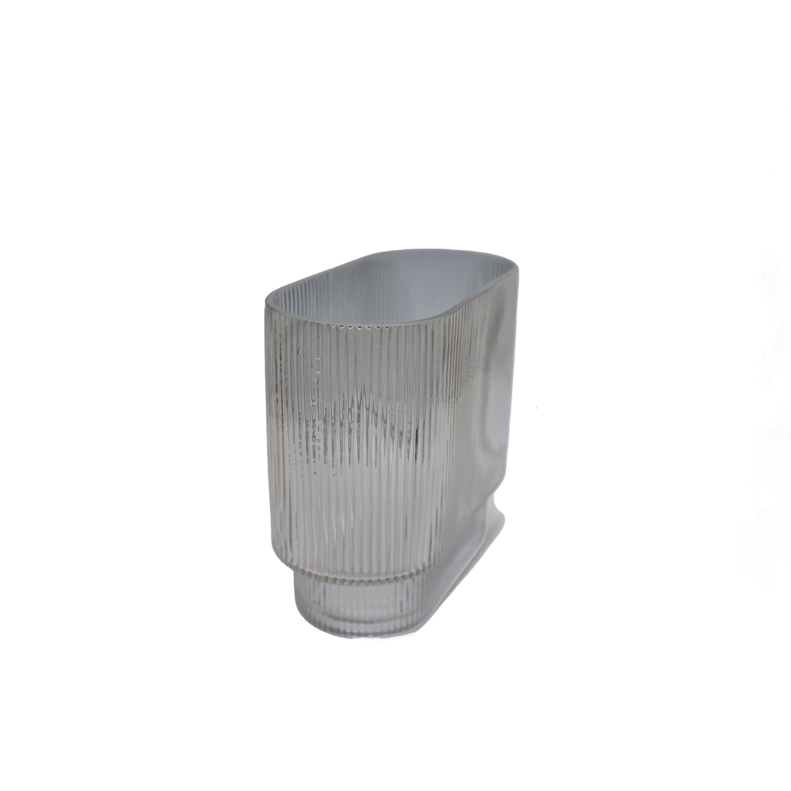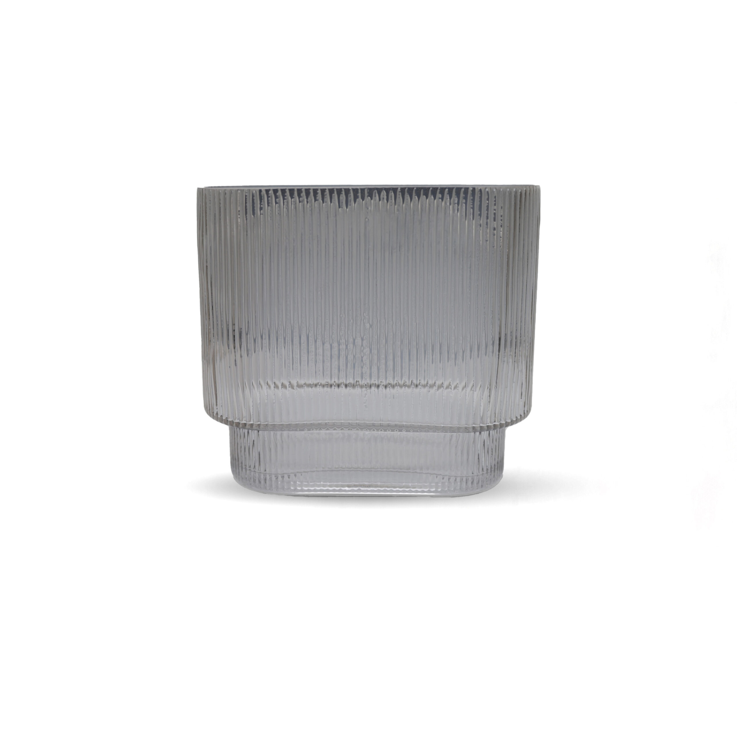 Wide smoked glass vase with subtle striped details, blending modern elegance with refined texture.