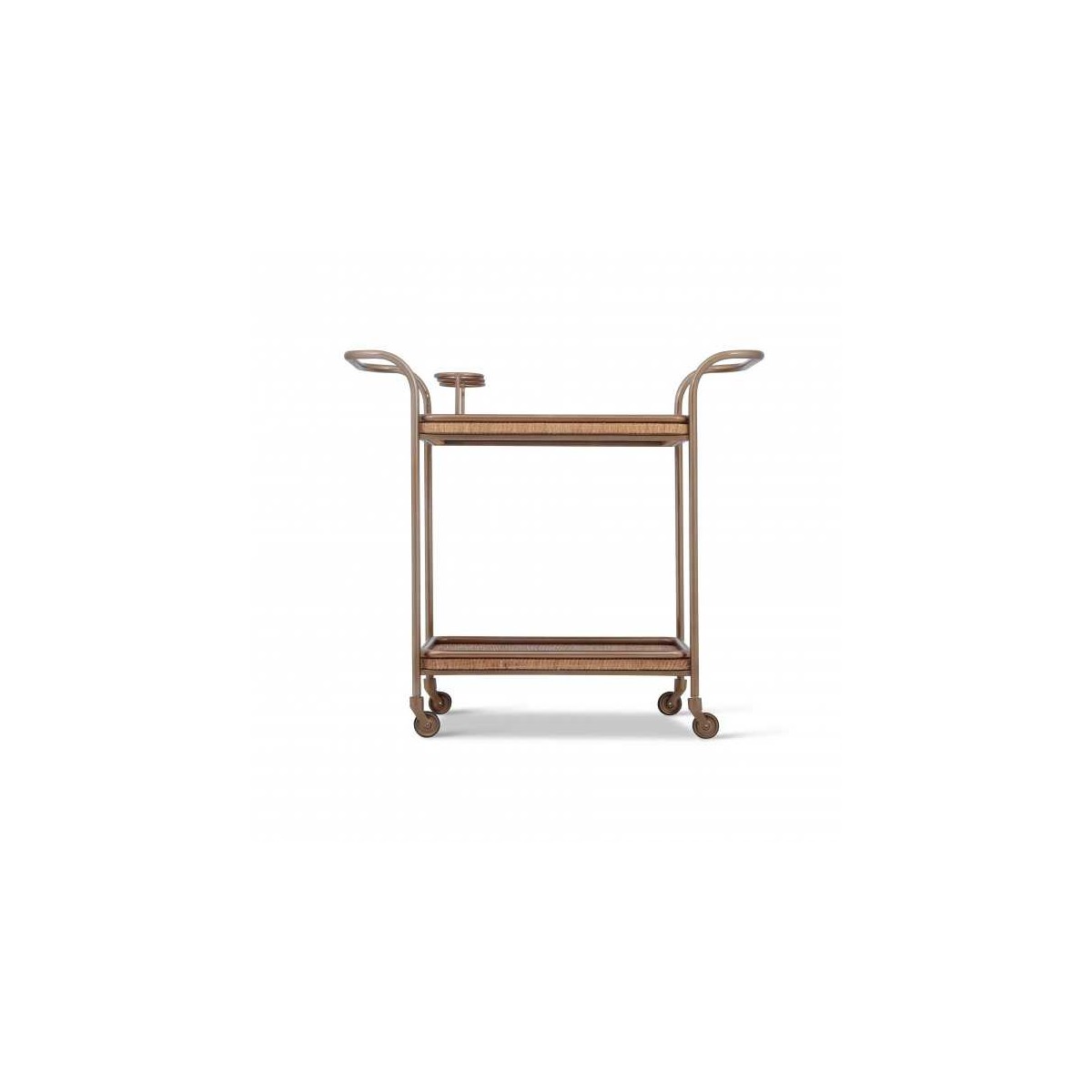 This chic bar cart features a vintage brass frame and natural rattan tiers.