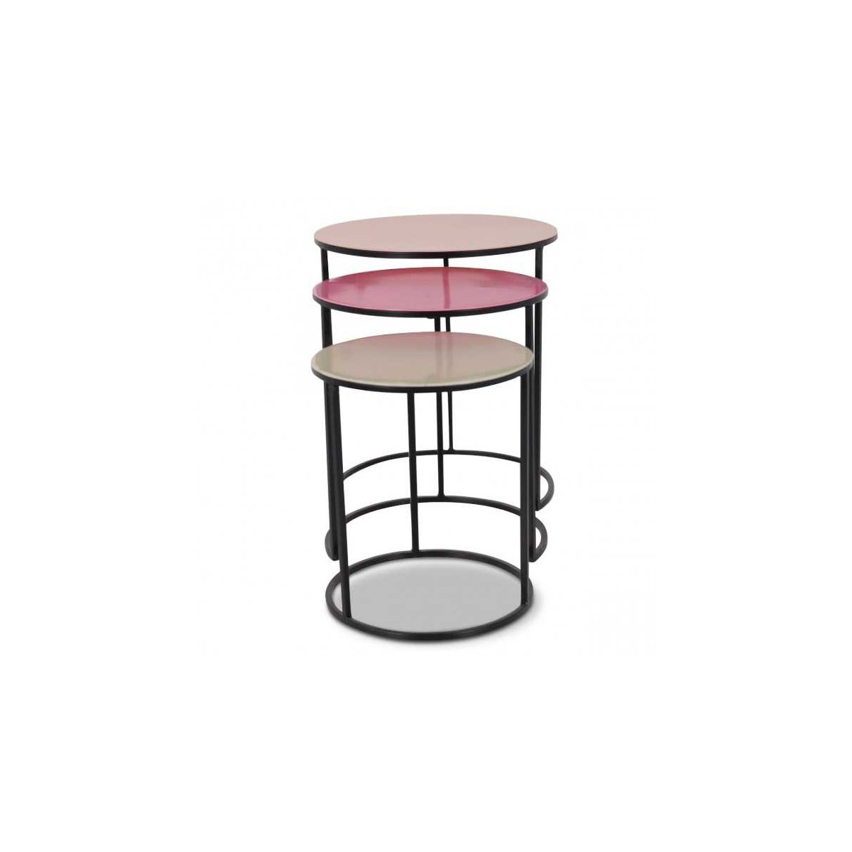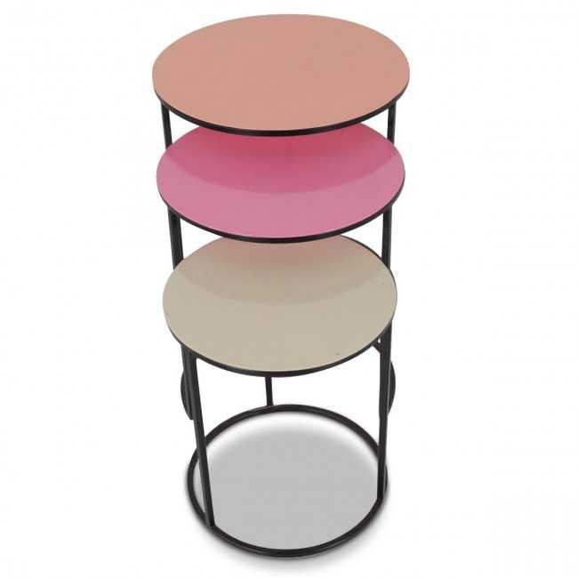 Set of three round nesting tables with colorful painted tops and black metal frames.