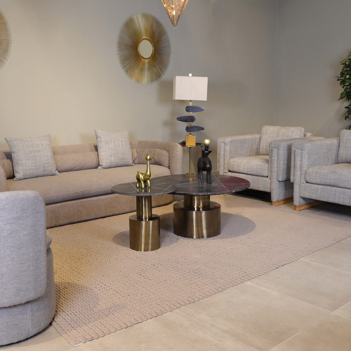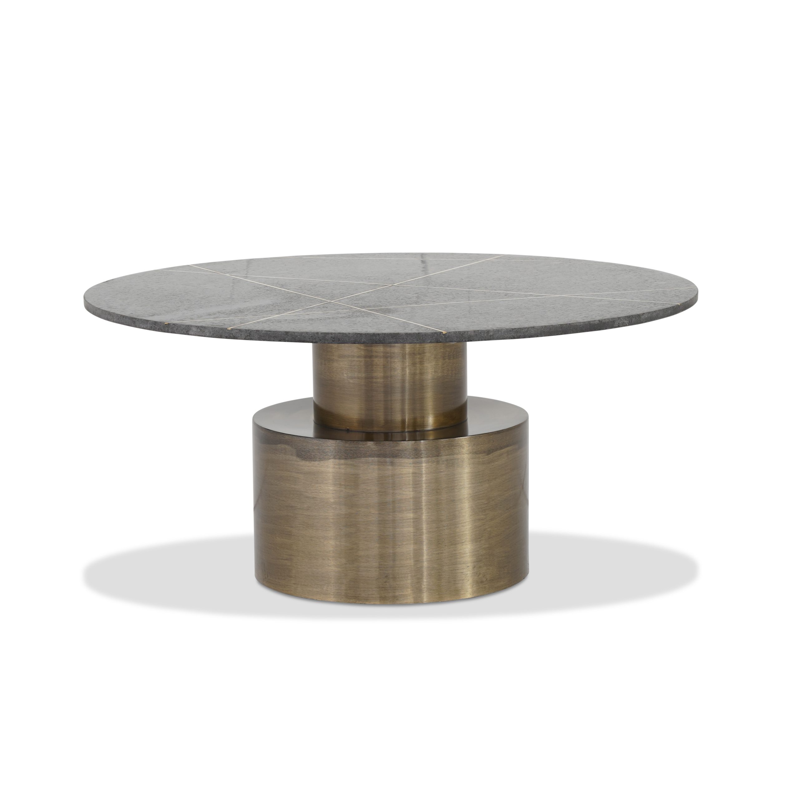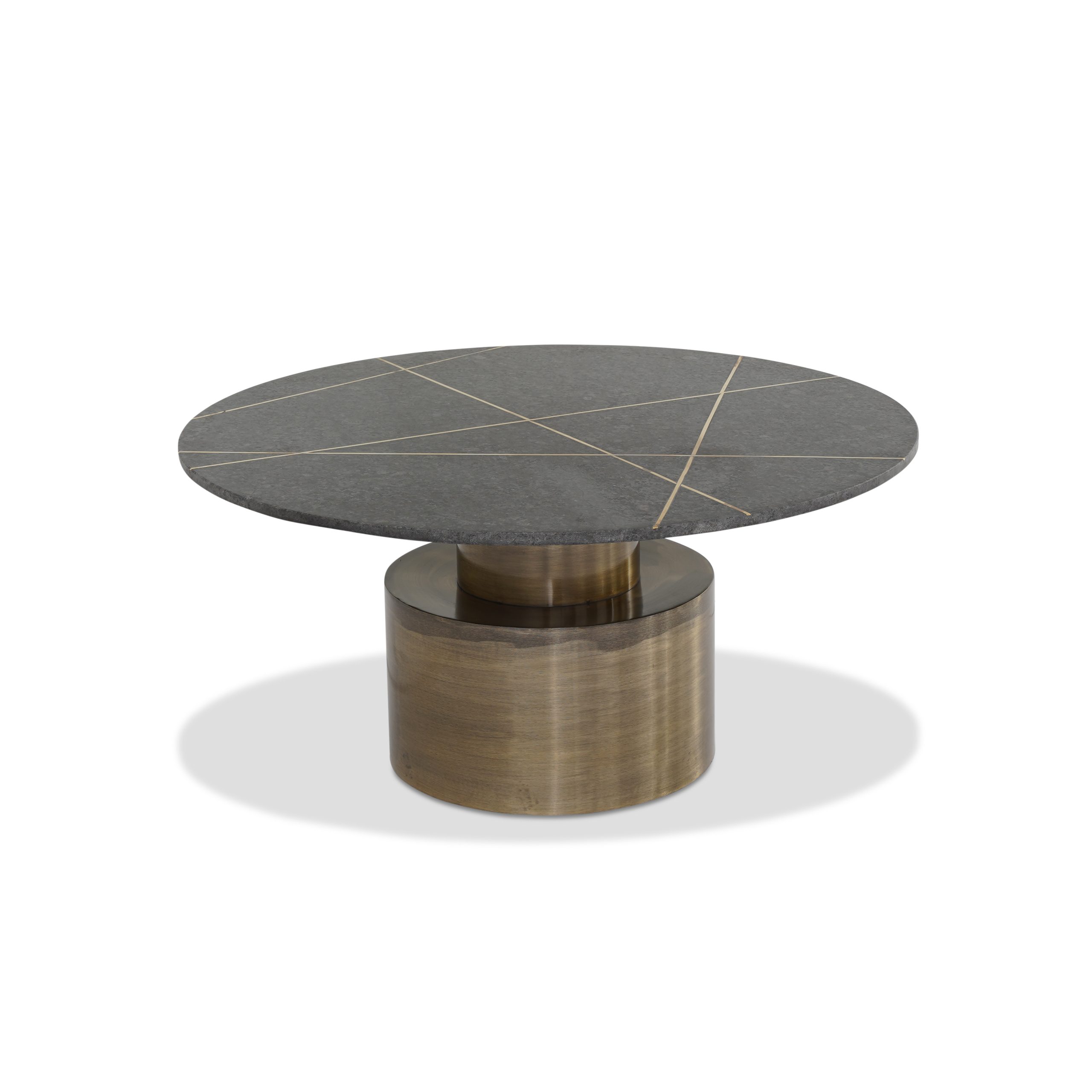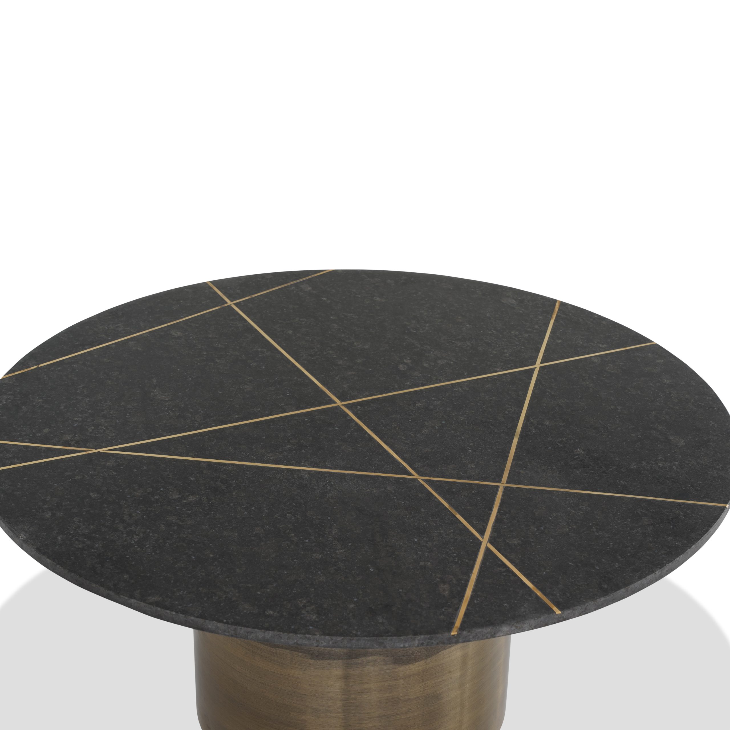 Update minimal space but steals the spotlight of your room. Stainless steel table with black stone top, brushed strip and antique brass finish.