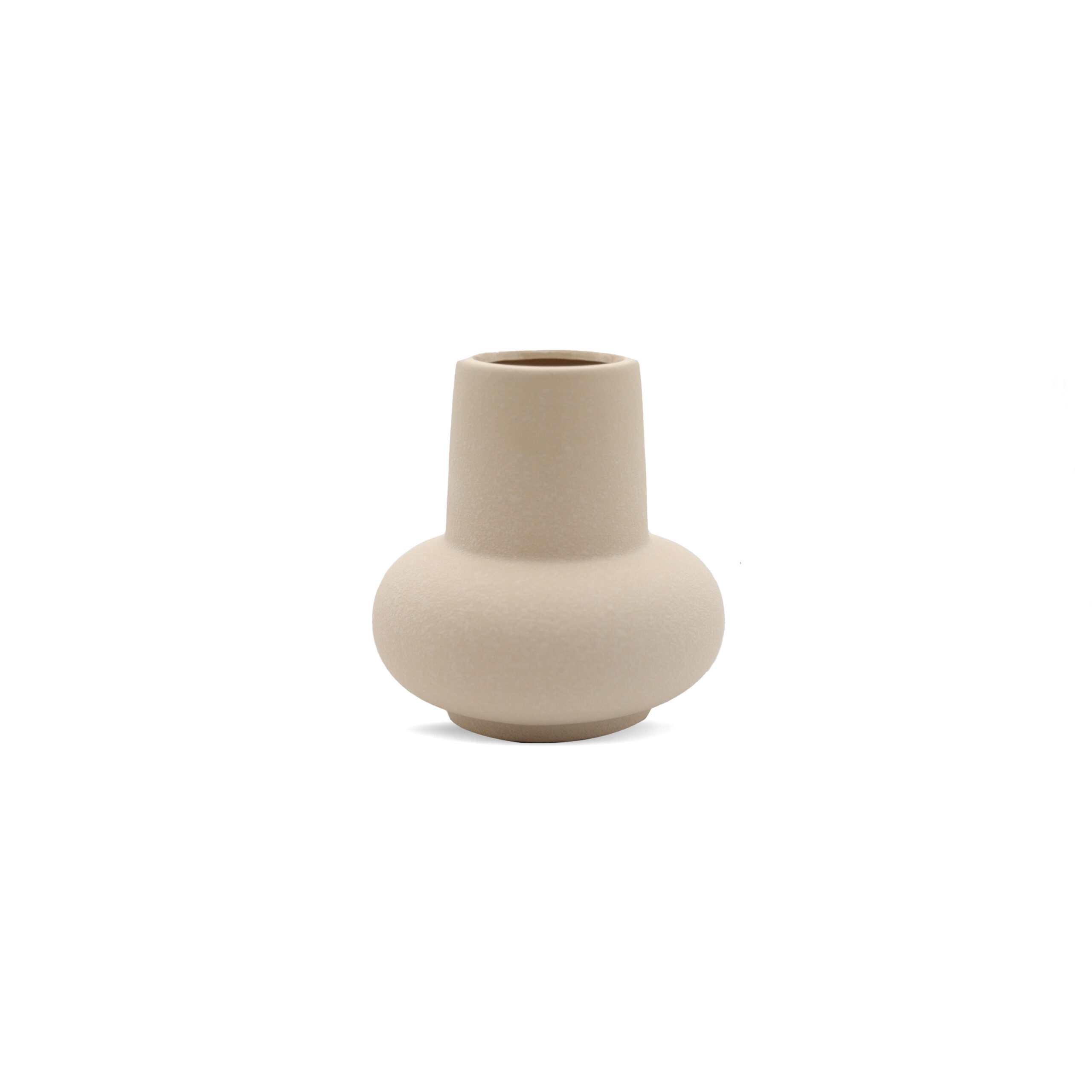 A small ceramic vase in warm beige with a textured finish, radiating subtle elegance and refined charm.