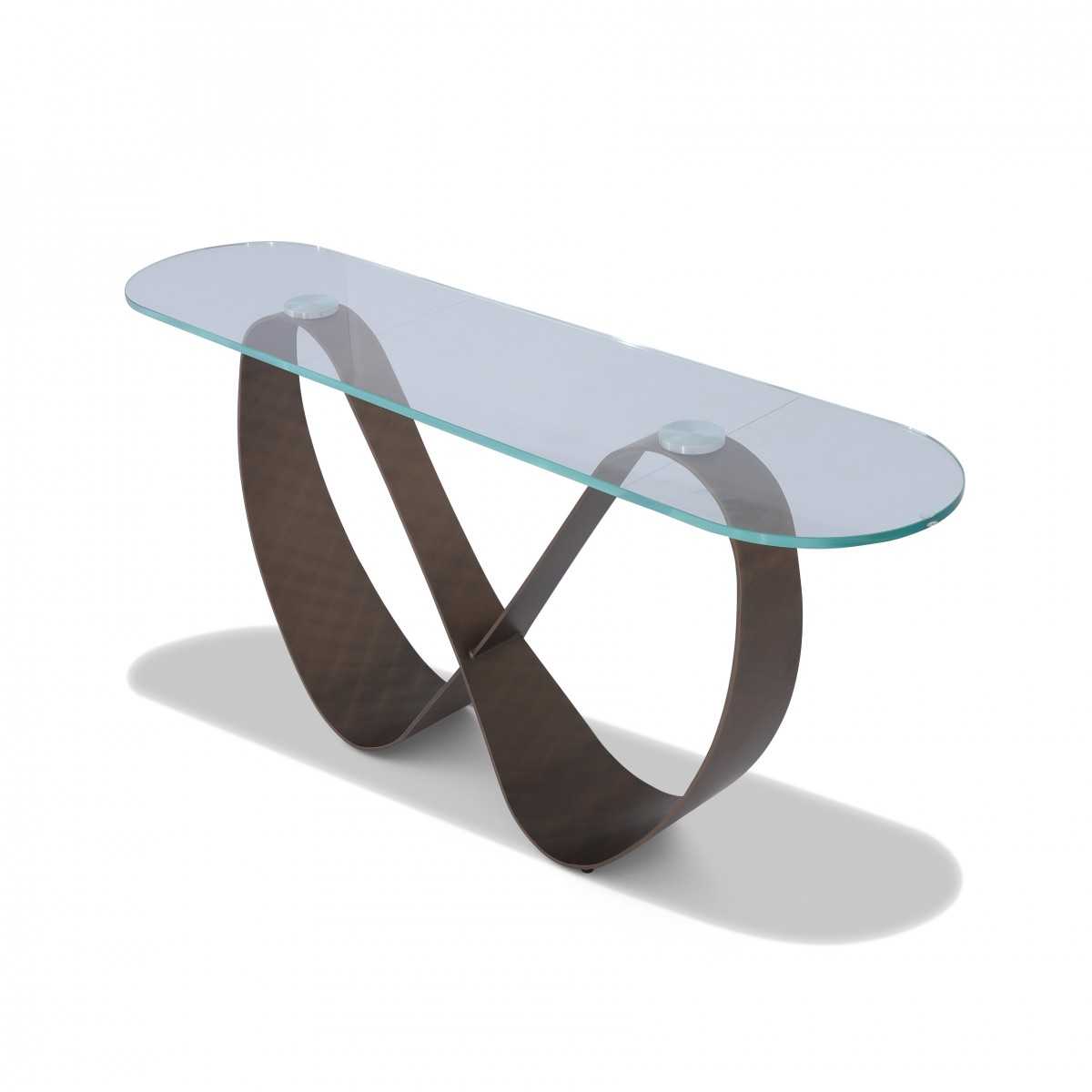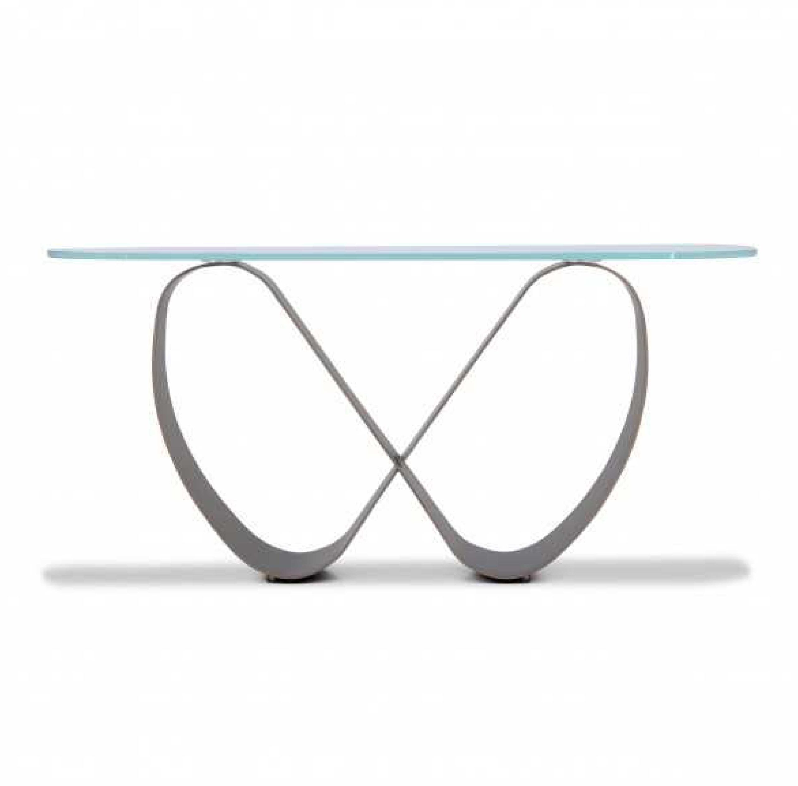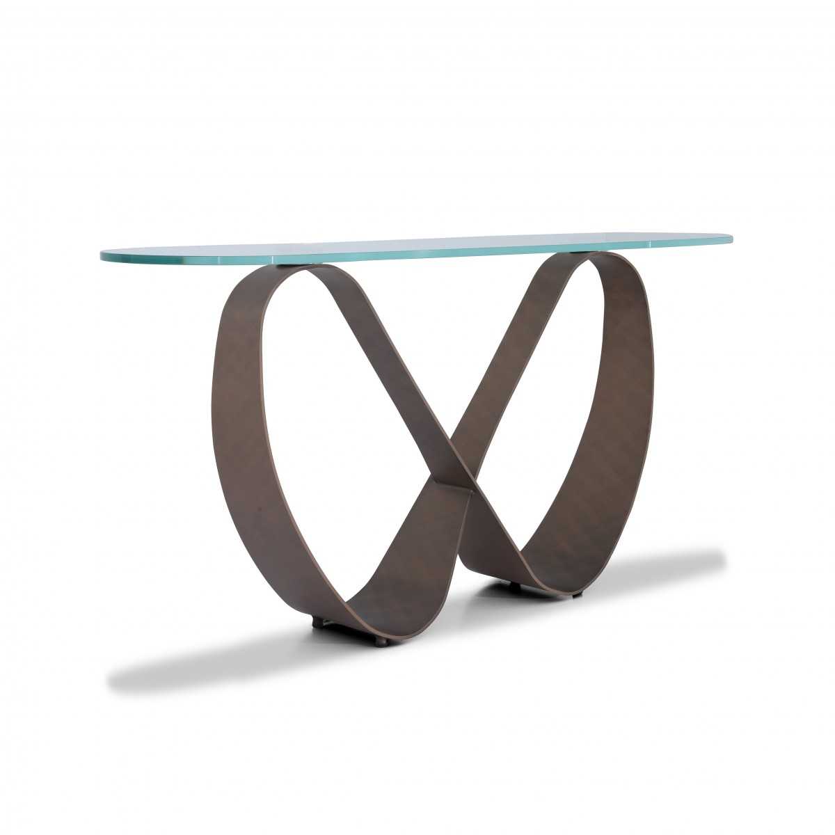 طاولة كونسول ذات سطح زجاجي وقاعدة منحنية فريدة.