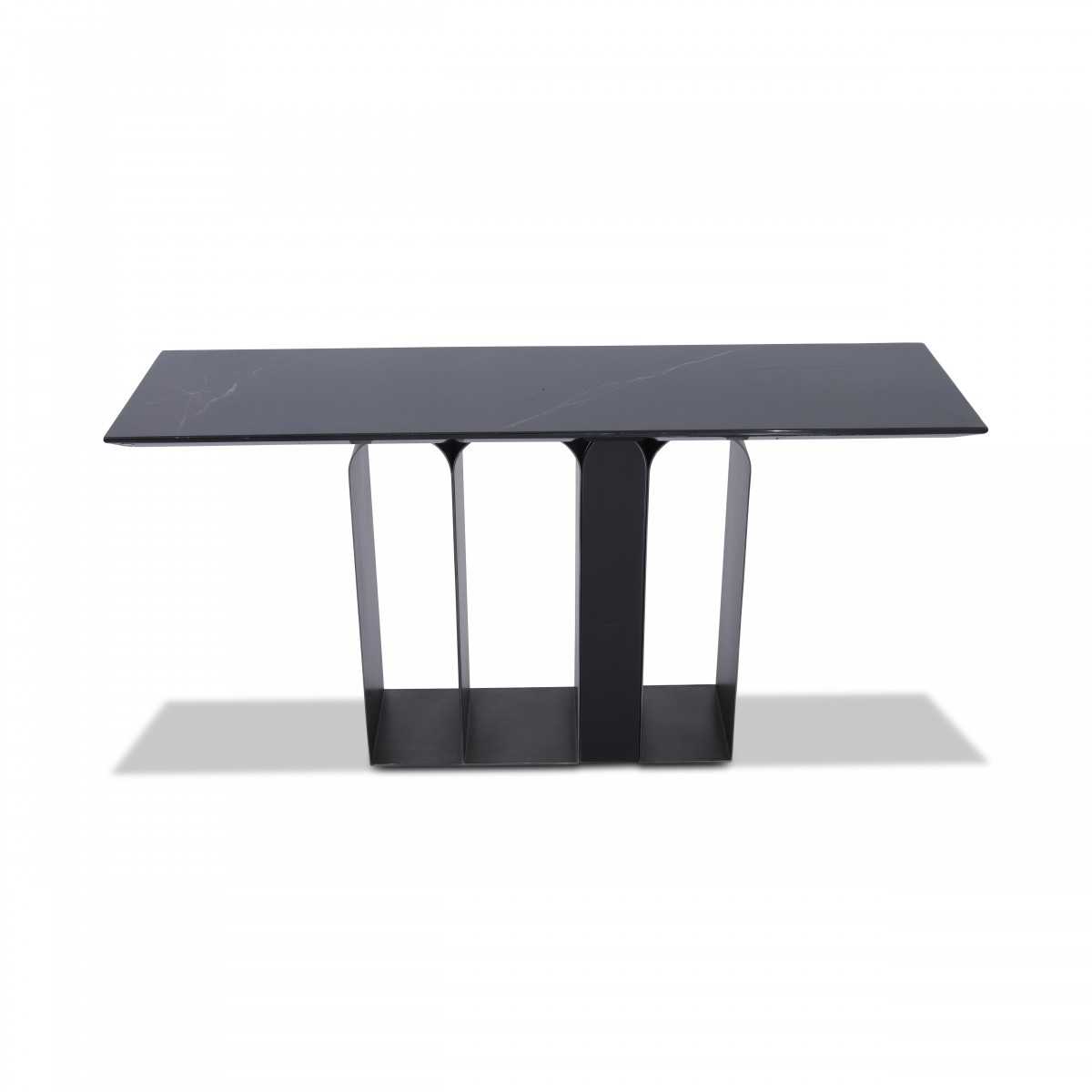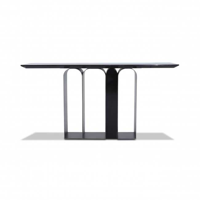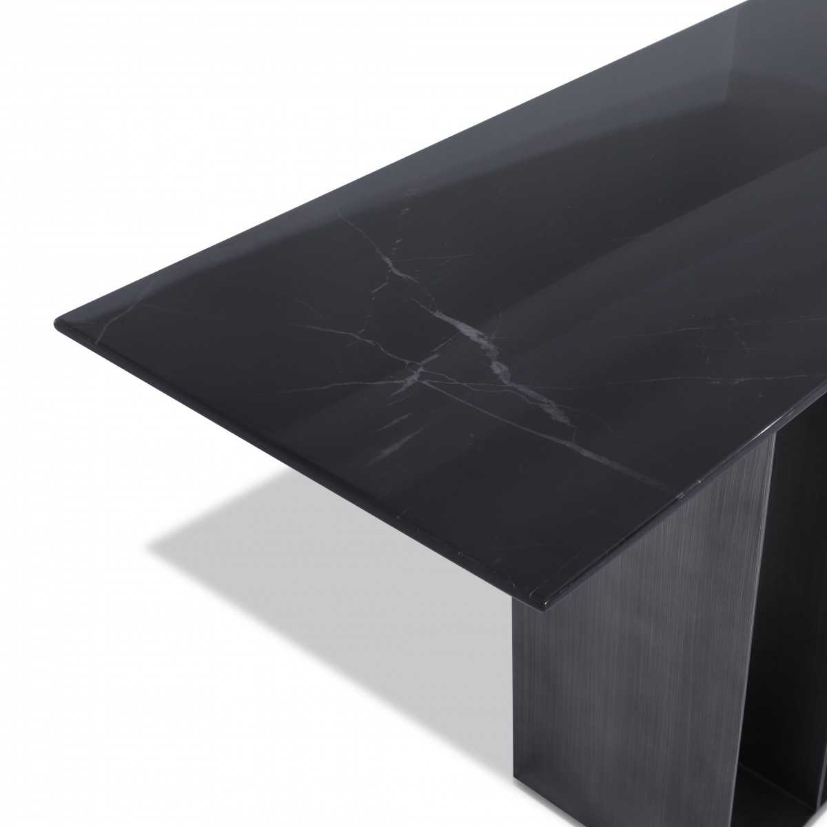 Featuring a black Marquita marble top, this console exudes quiet luxury. The stainless steel base, finished in gun metal, complements the marble perfectly.