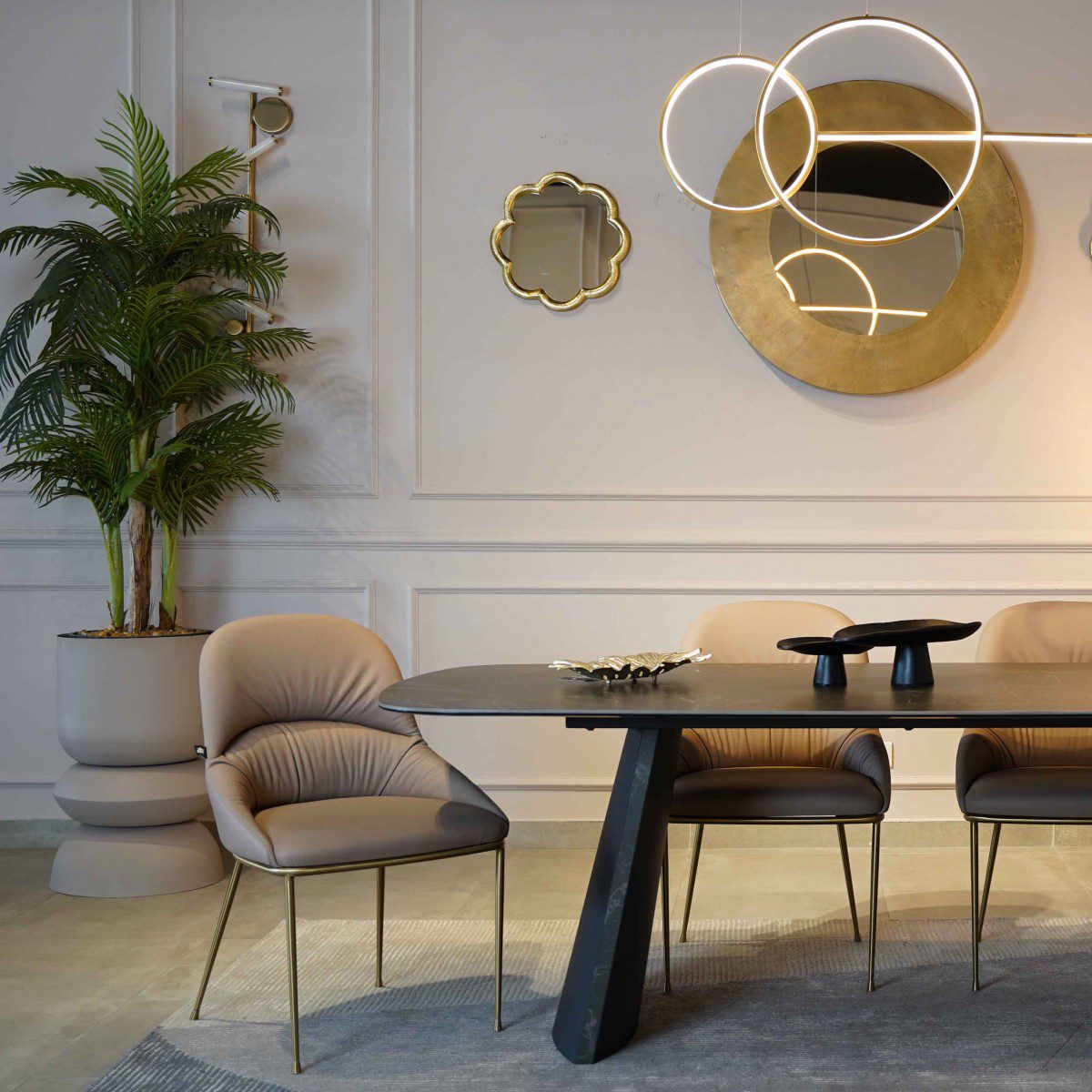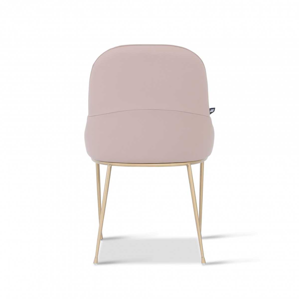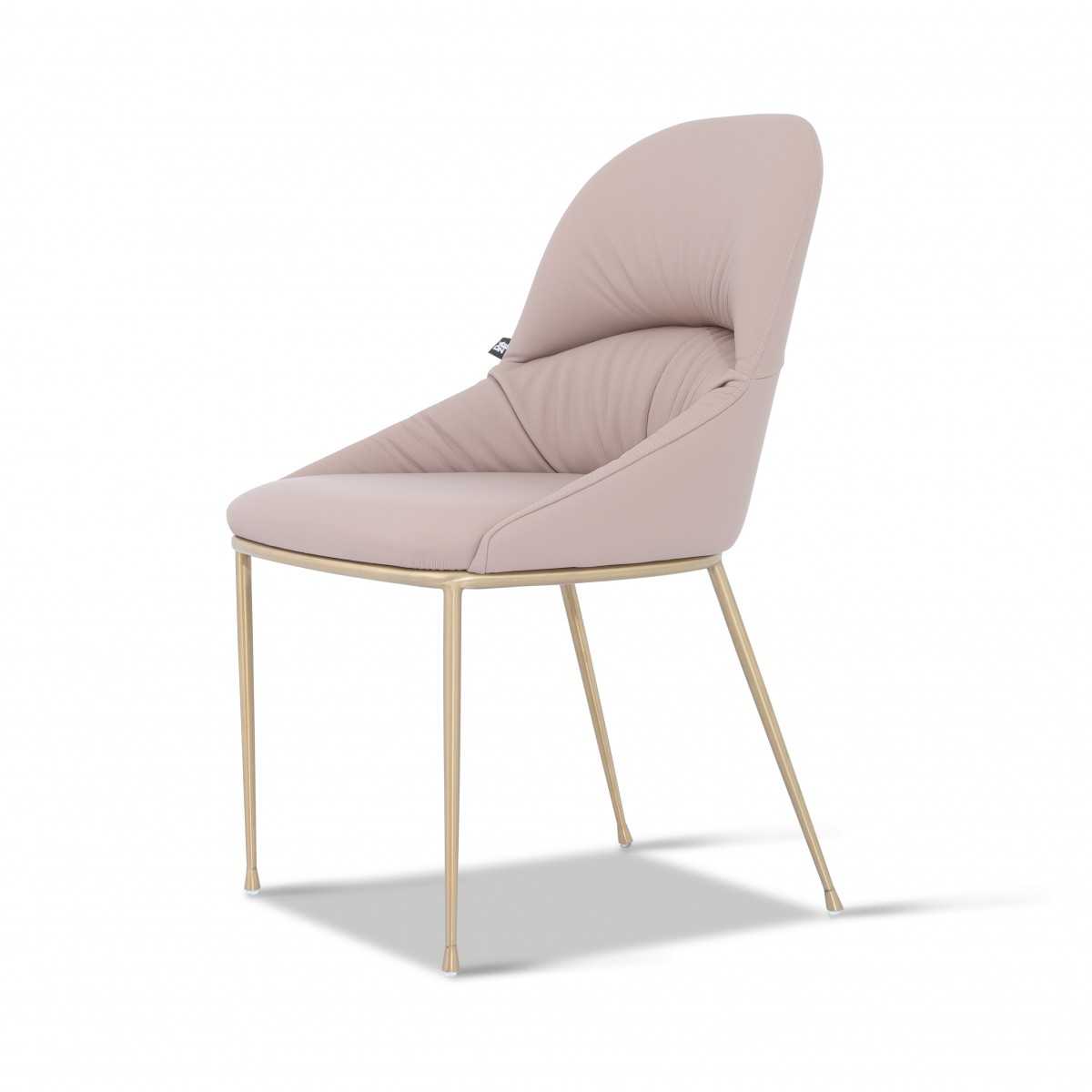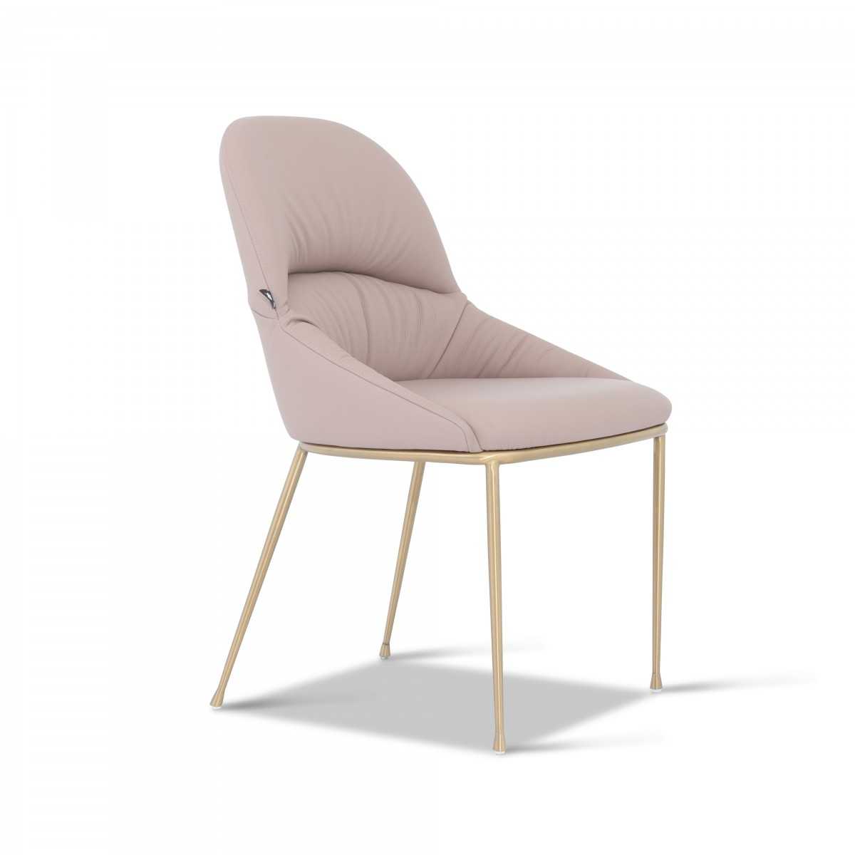 Plush upholstered dining chair with a curved backrest and sleek metal legs.
