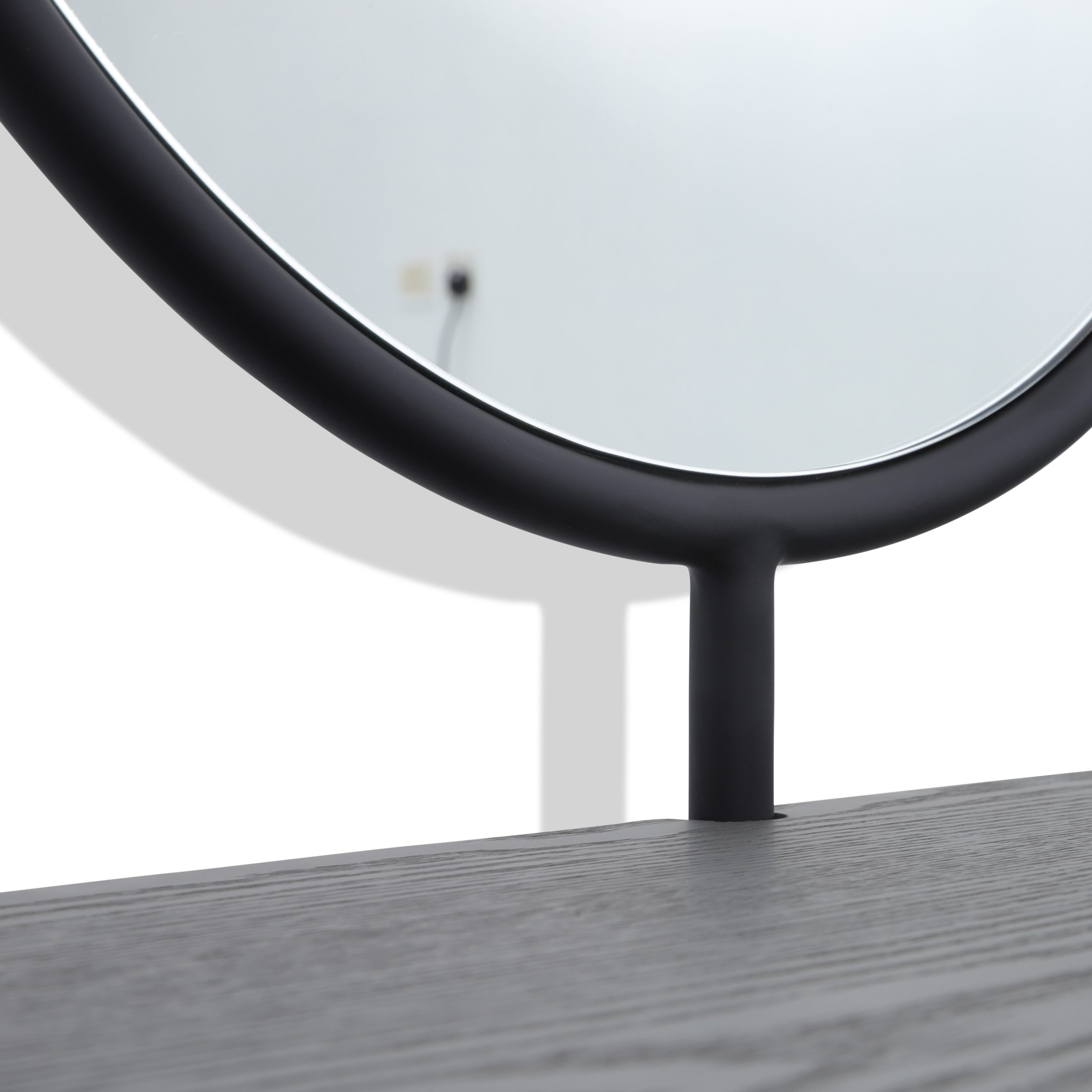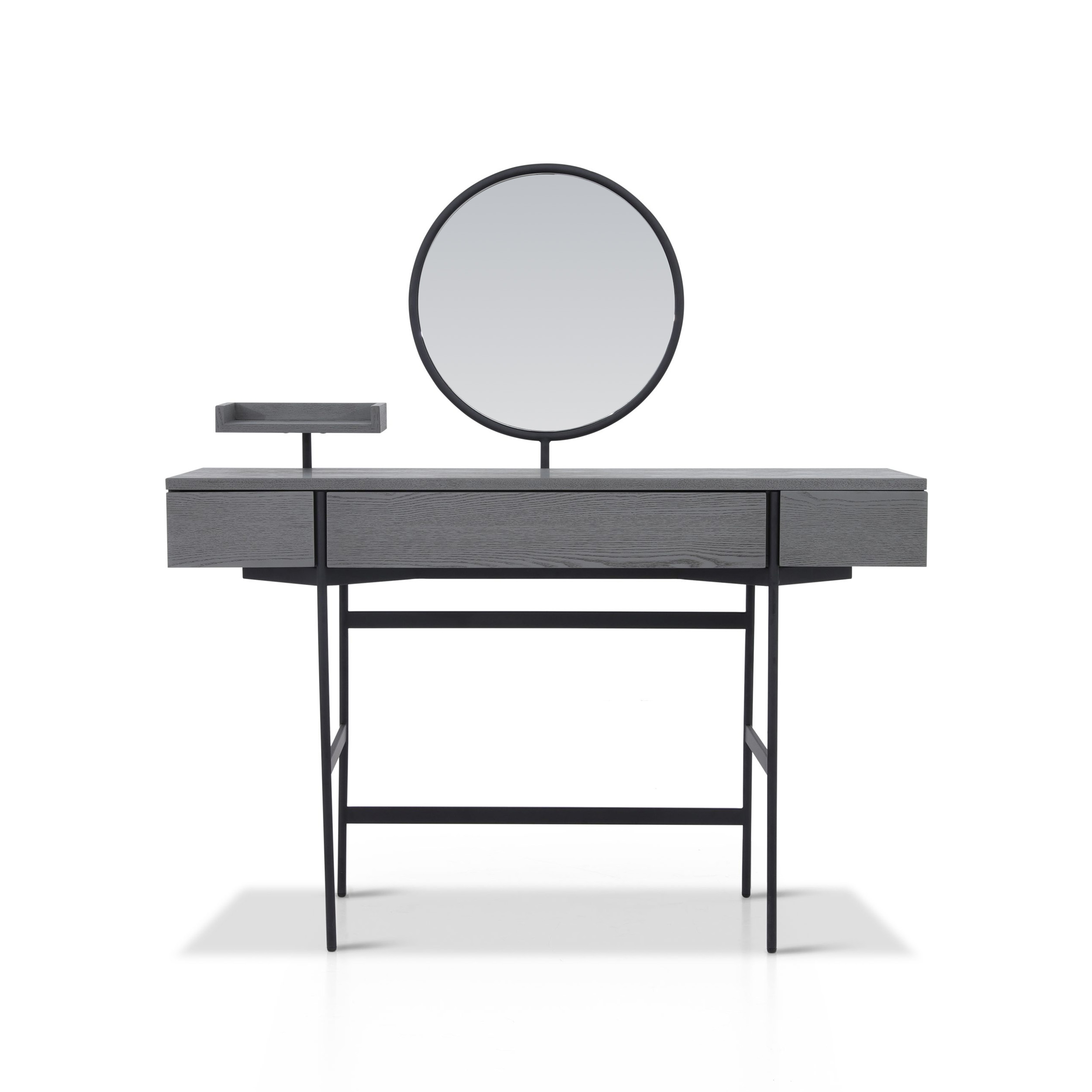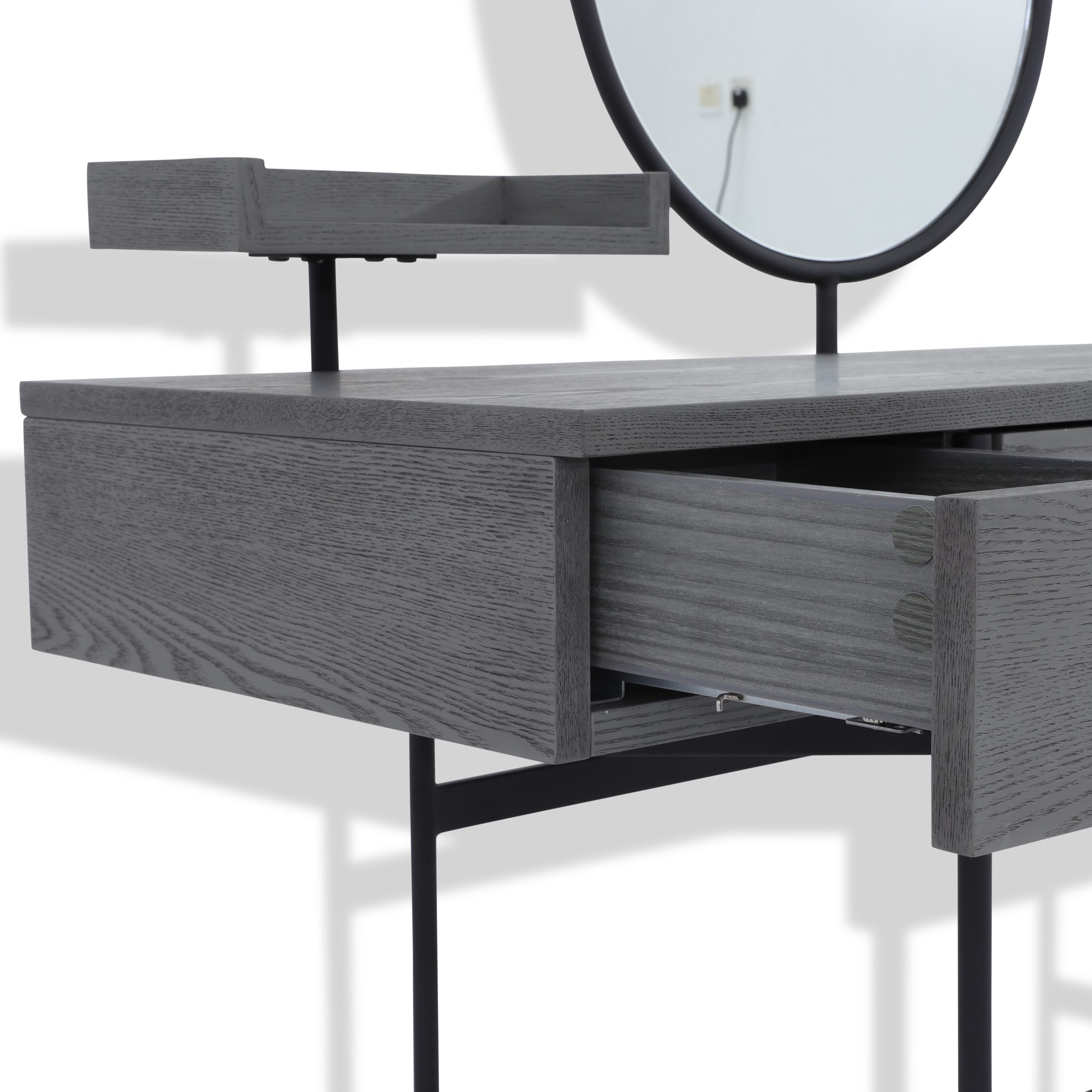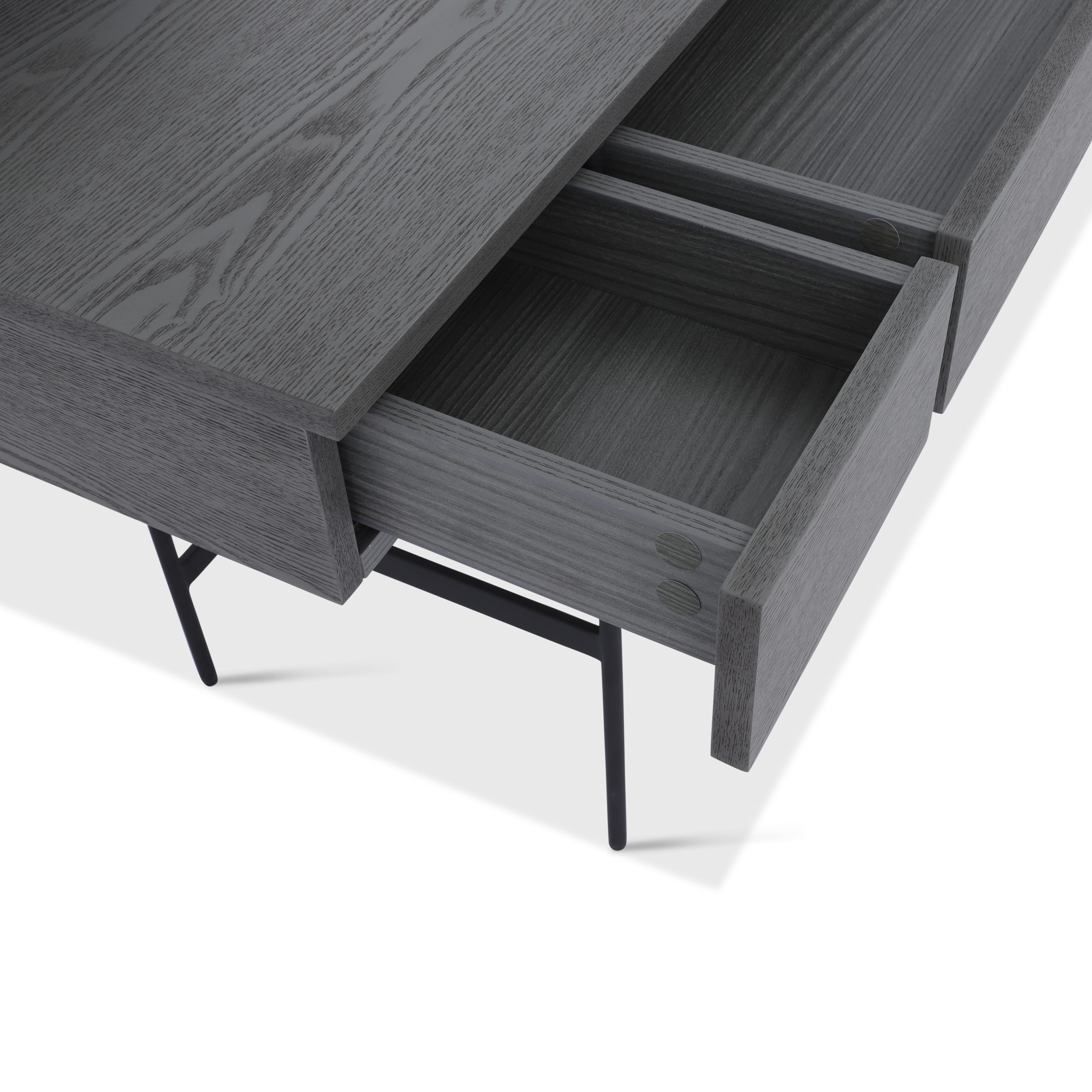 Elegant grey wood paired with a black powder-coated metal base creates a refined contrast of warmth and strength. Effortlessly sleek, this piece blends natural texture with modern edge.