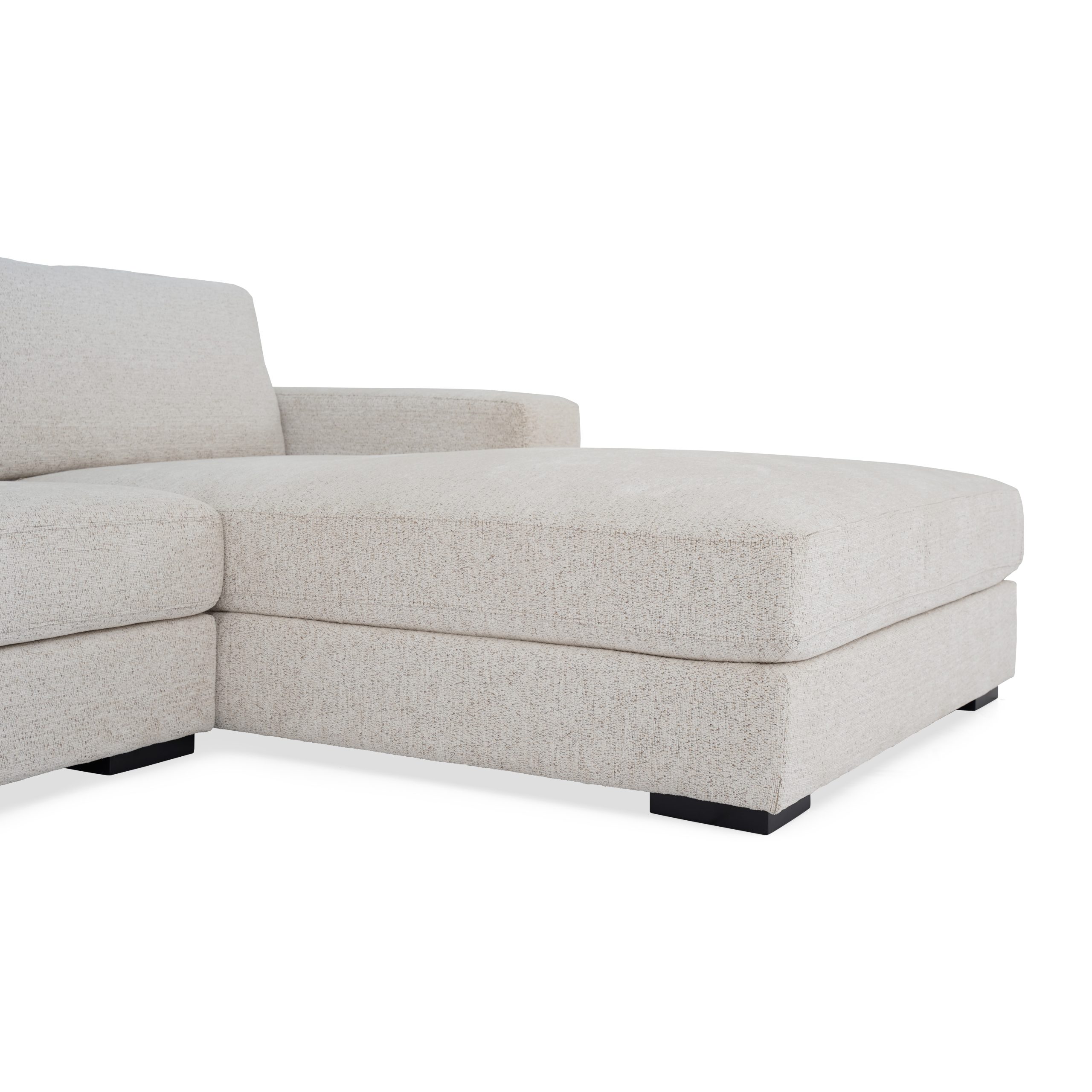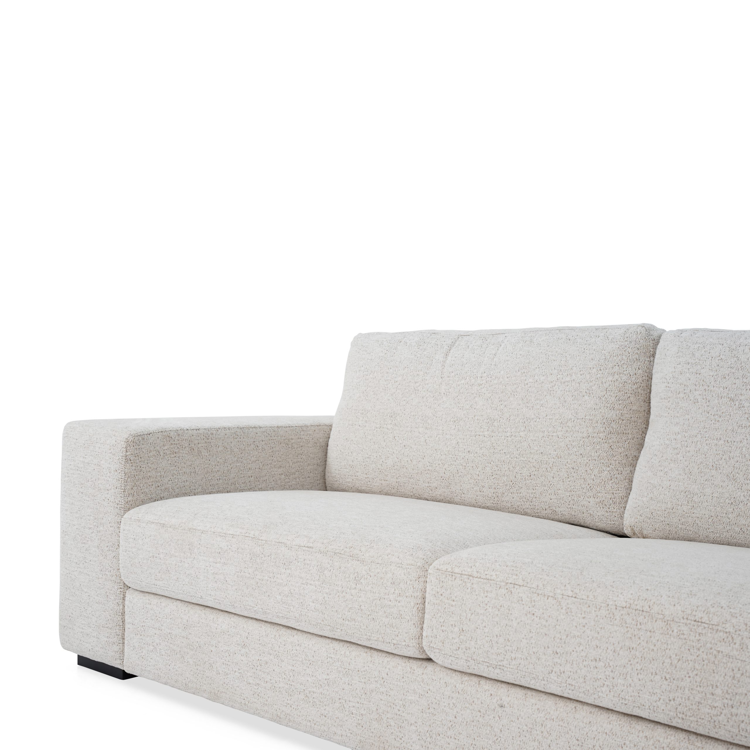A four seat sofa in light beige linen tweed effect, paired with a sleek black wooden base for a look of understated sophistication.