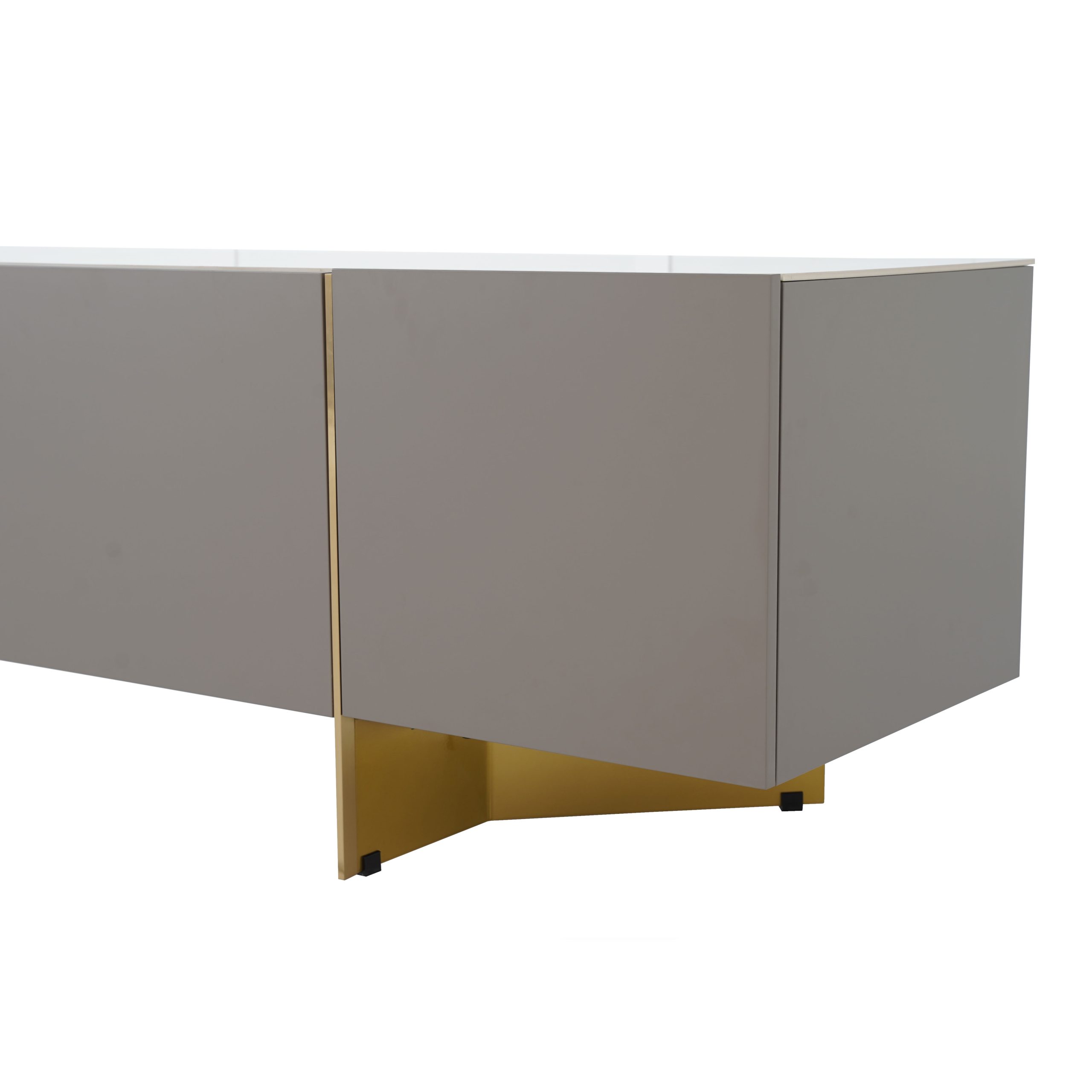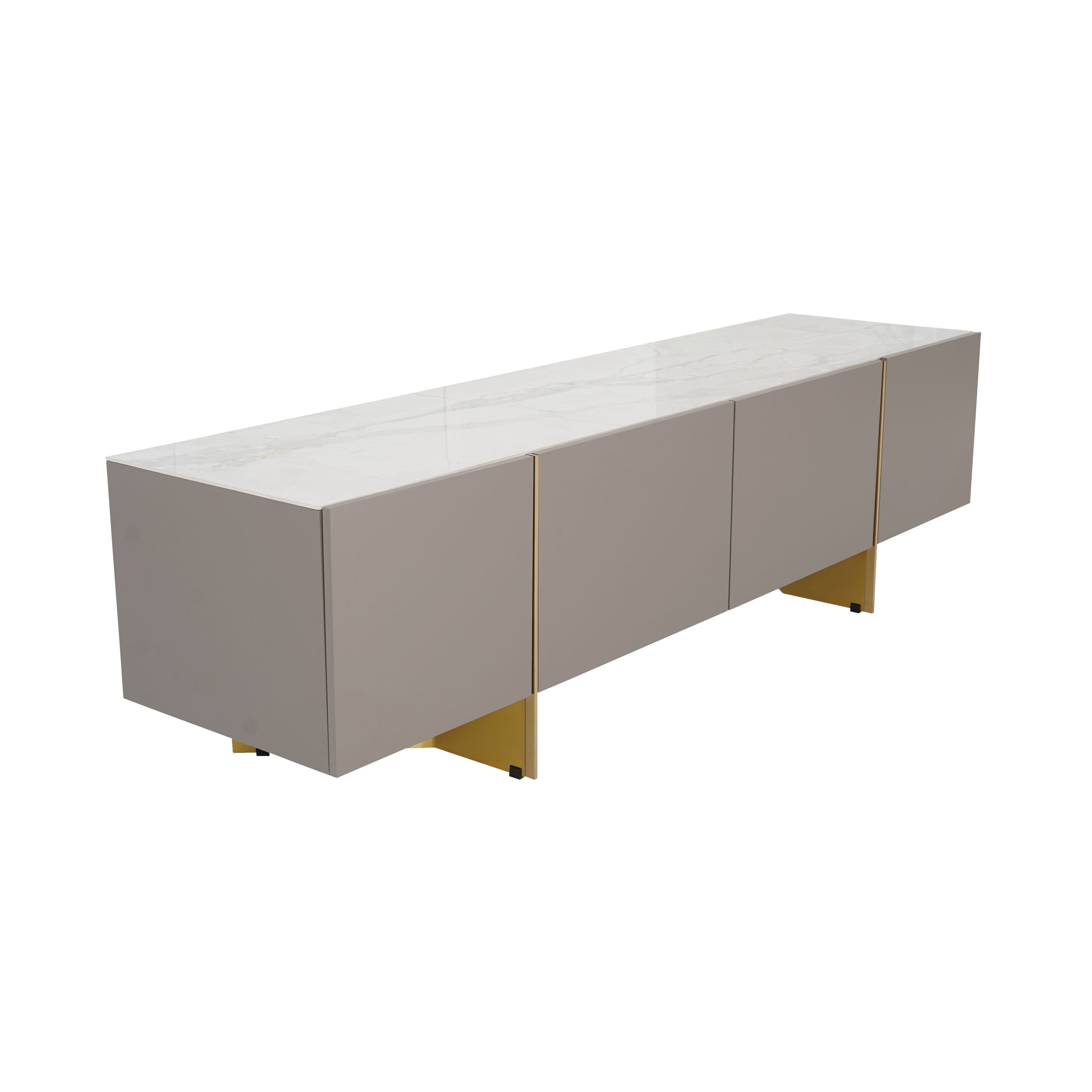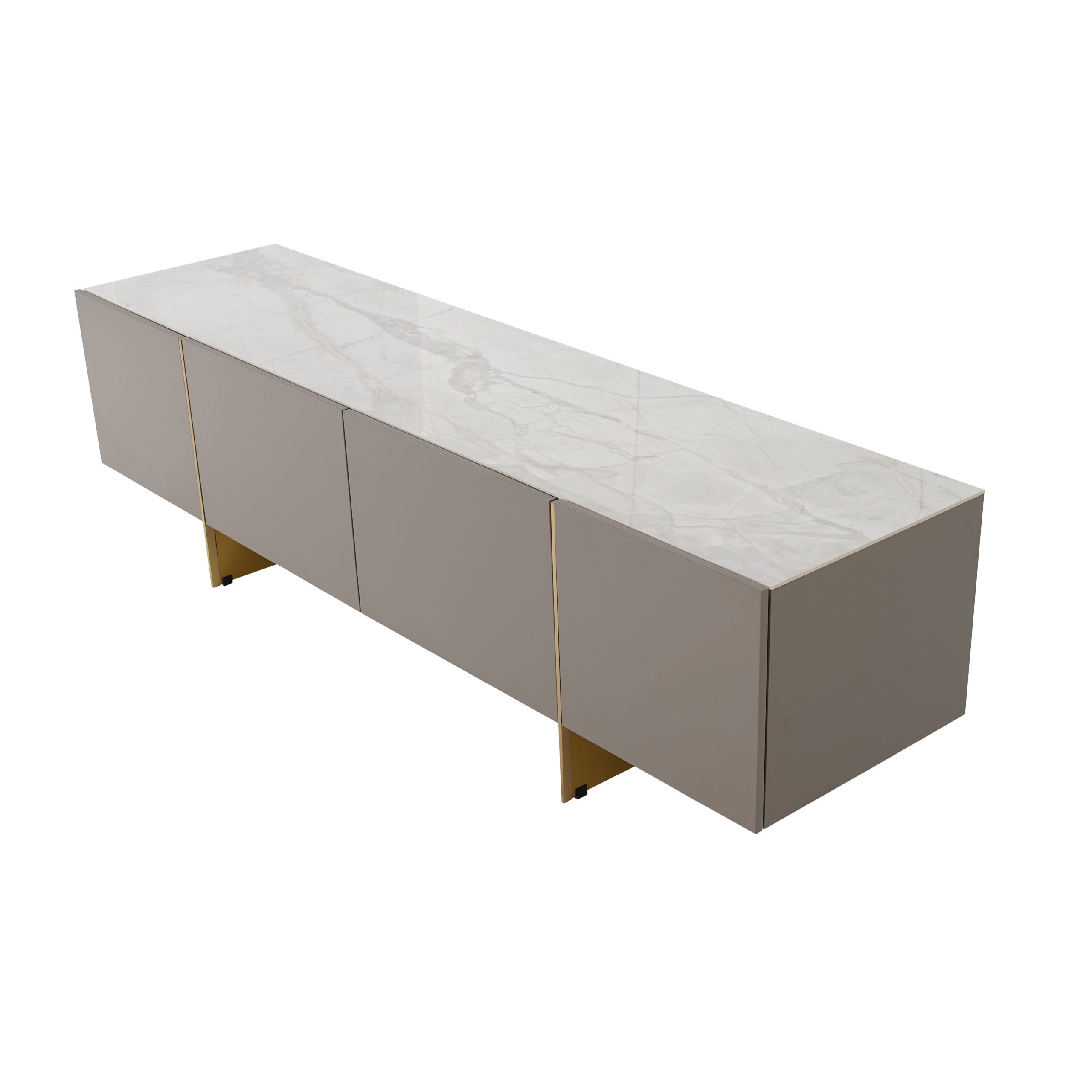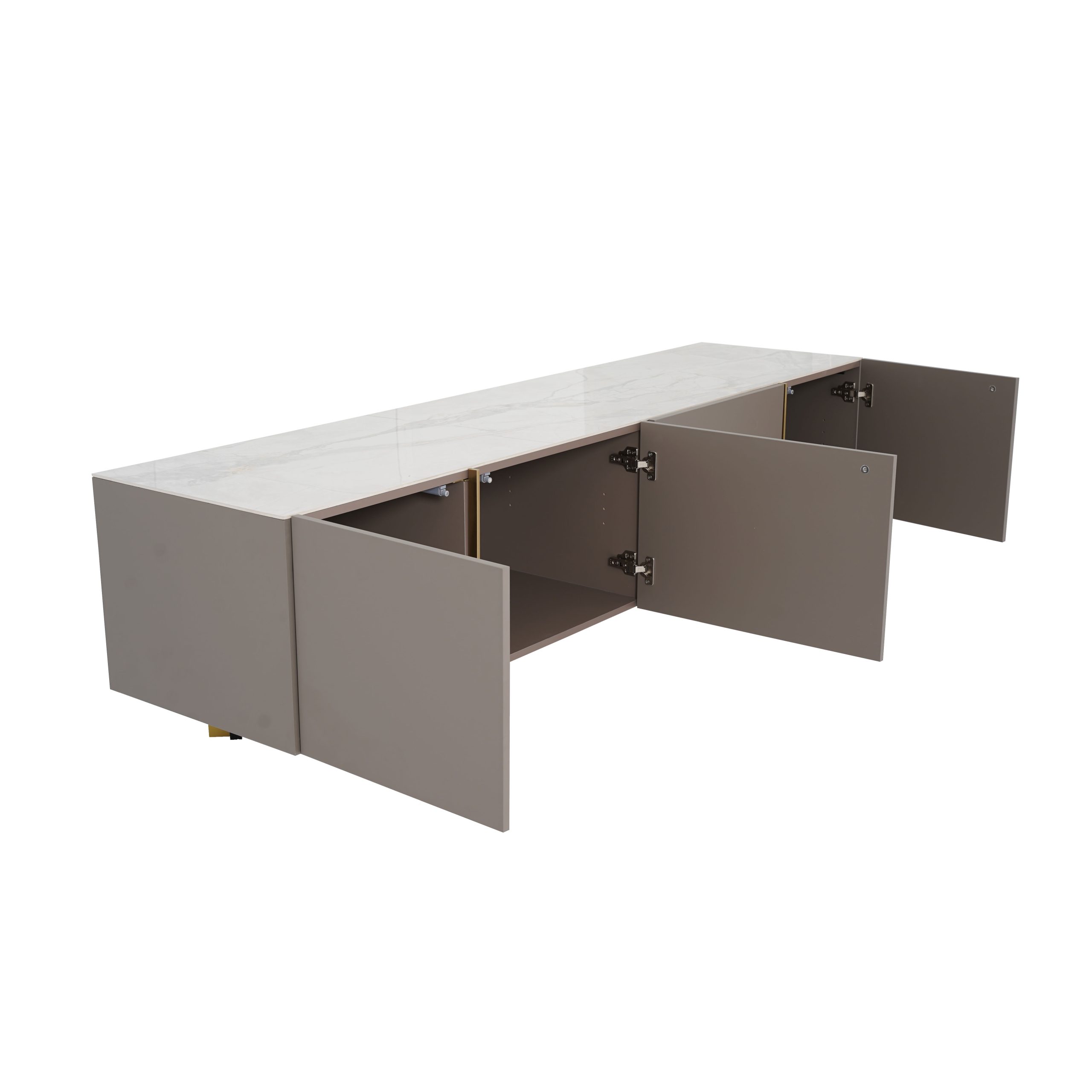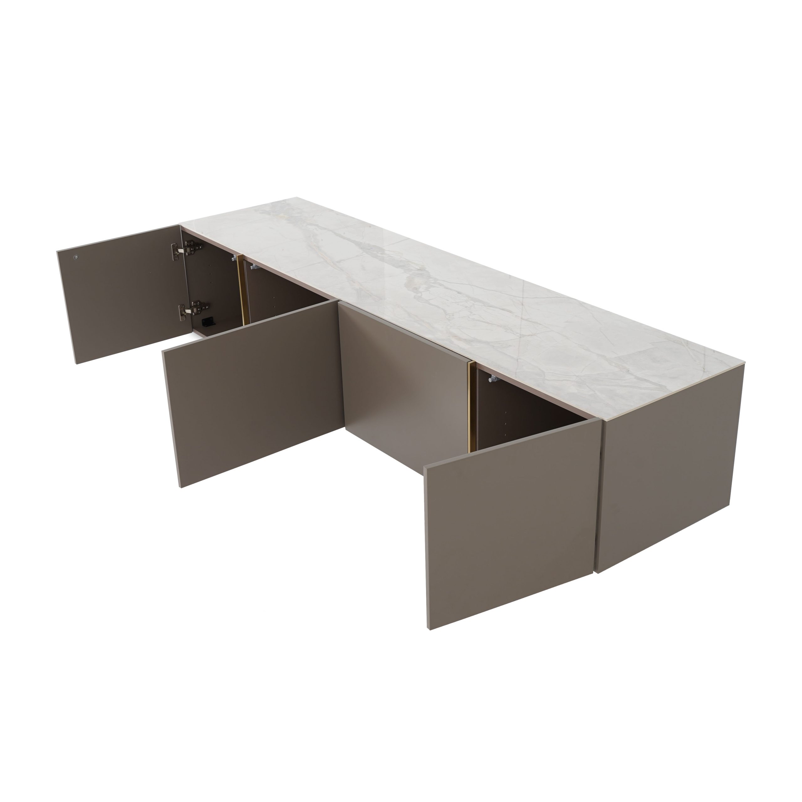TV unit with a white ceramic top, a taupe wooden body & a brushed brass metal base. To be wiped with clean water heat resistant: 500℃~1200℃