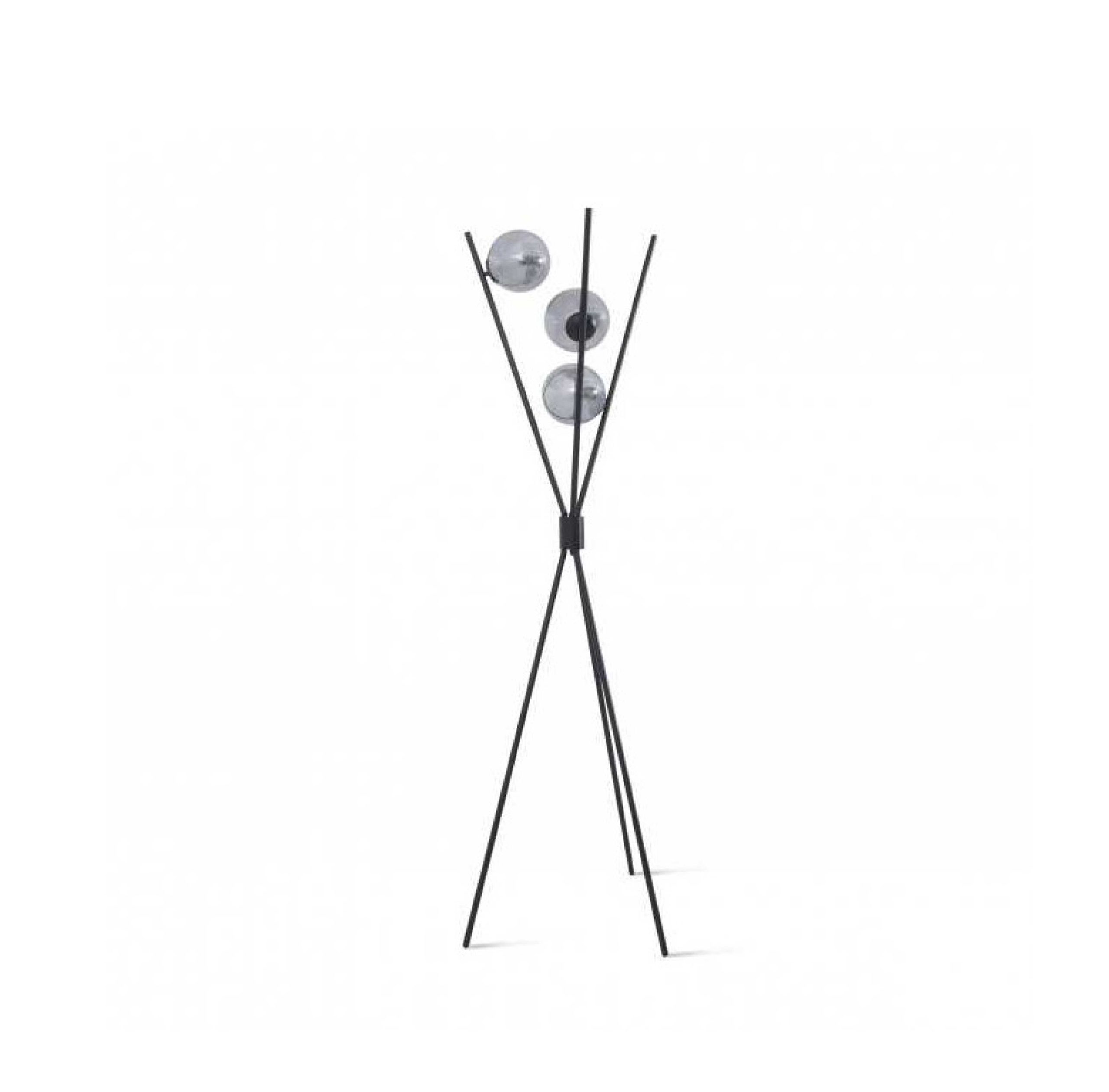 Black powder coated tripod floor lamp with three white glass sphere bulbs.
