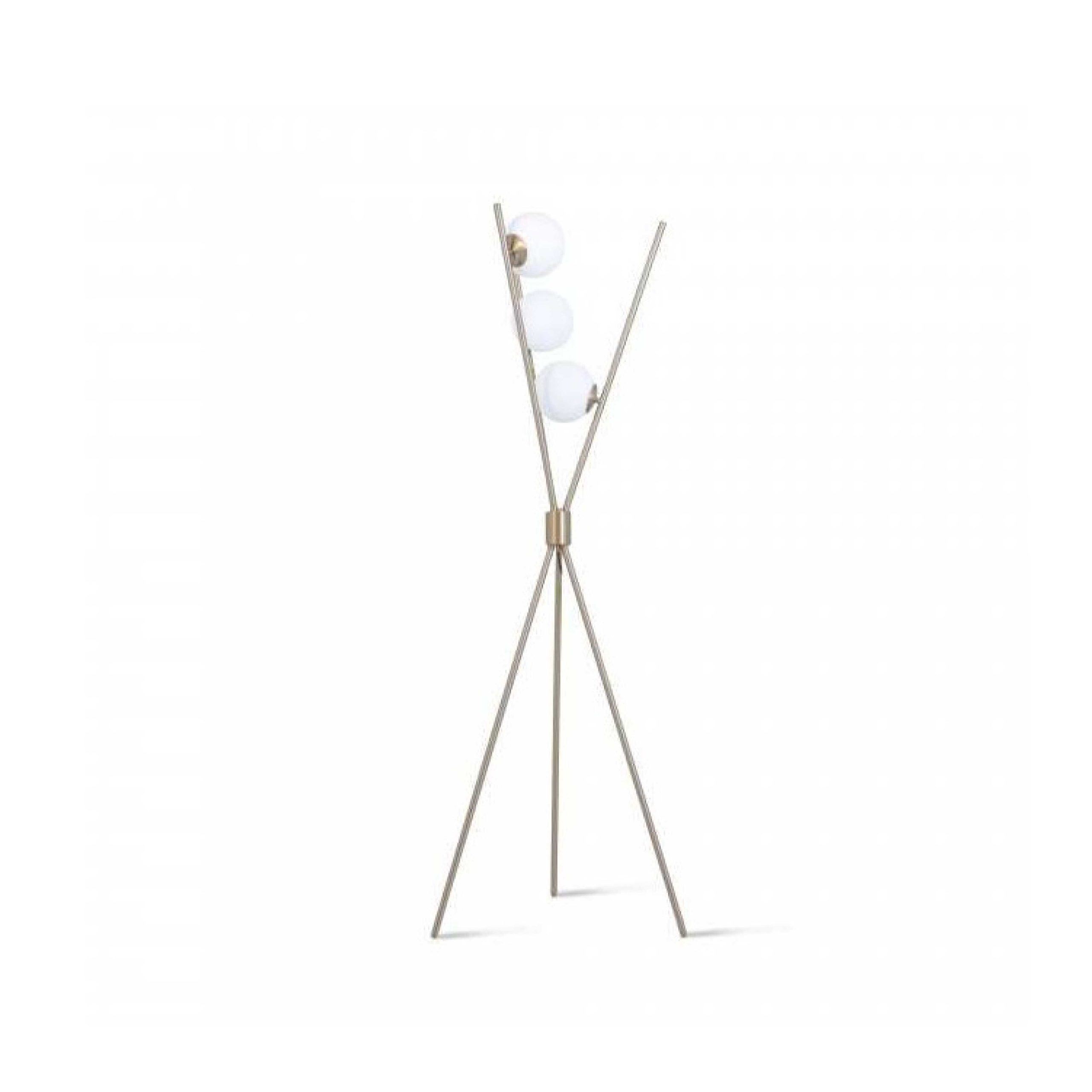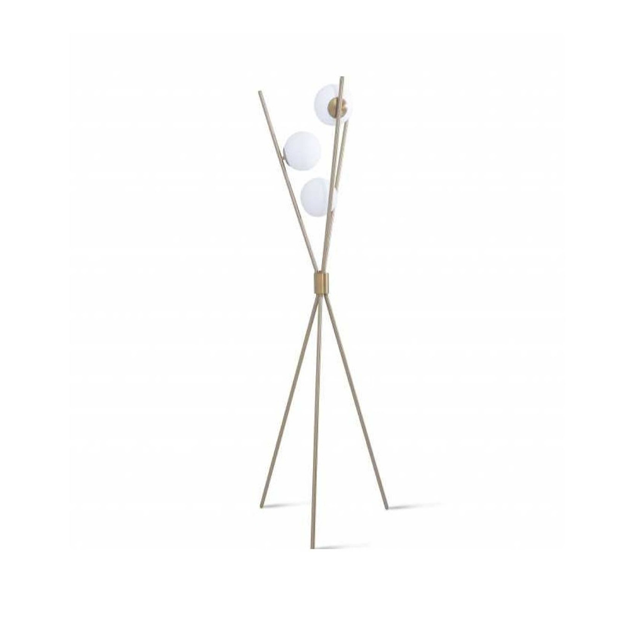 Brass tripod floor lamp with three white glass sphere bulbs.