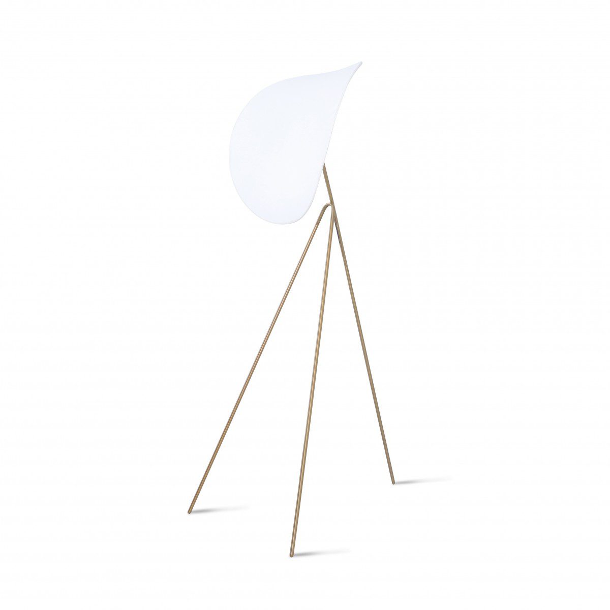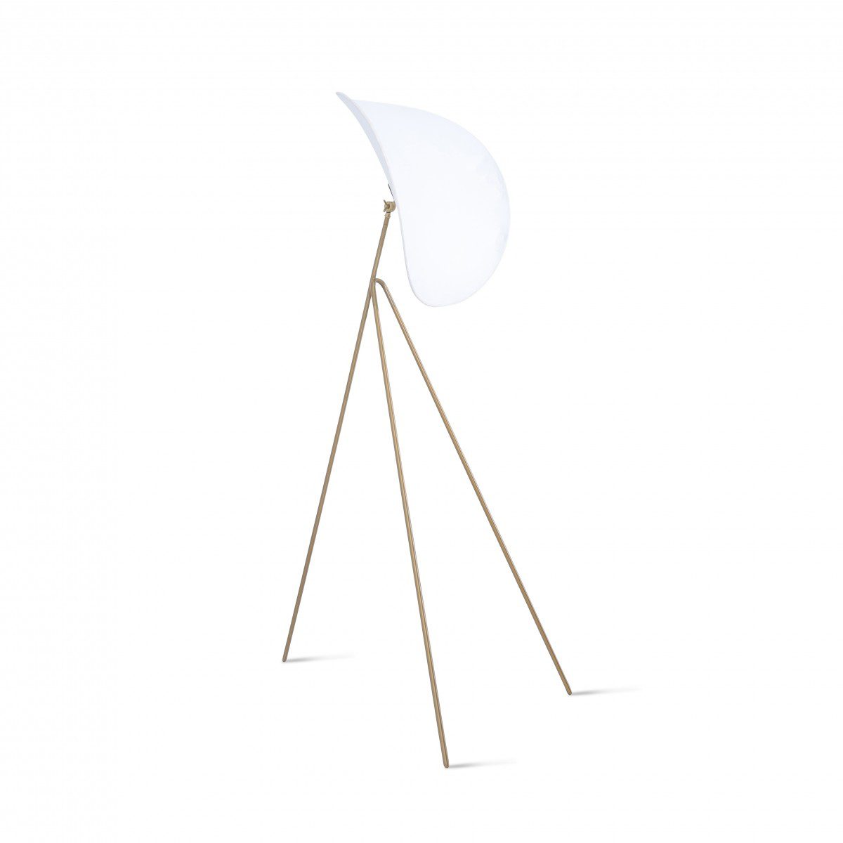 Single white lampshade on brass metal tripod base.