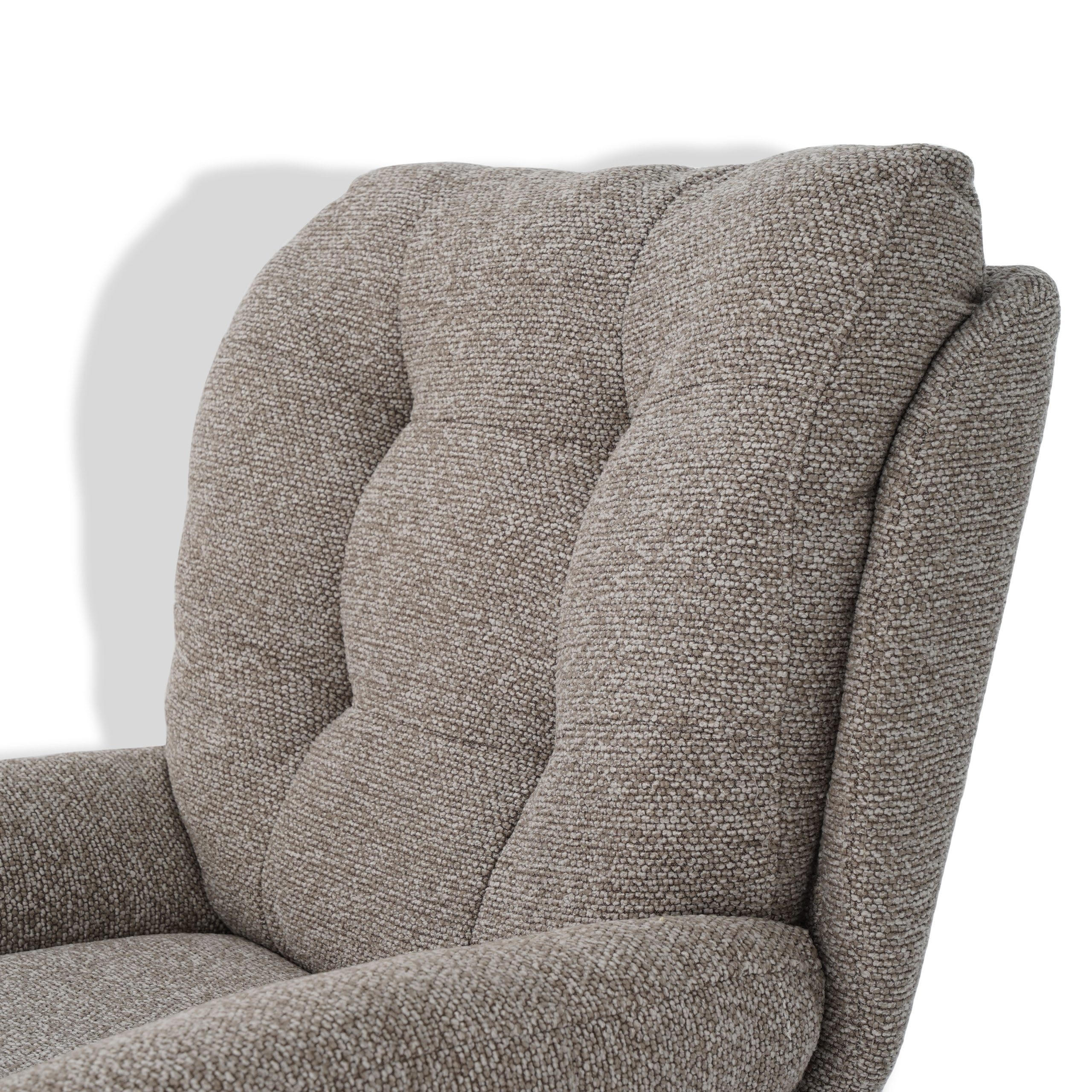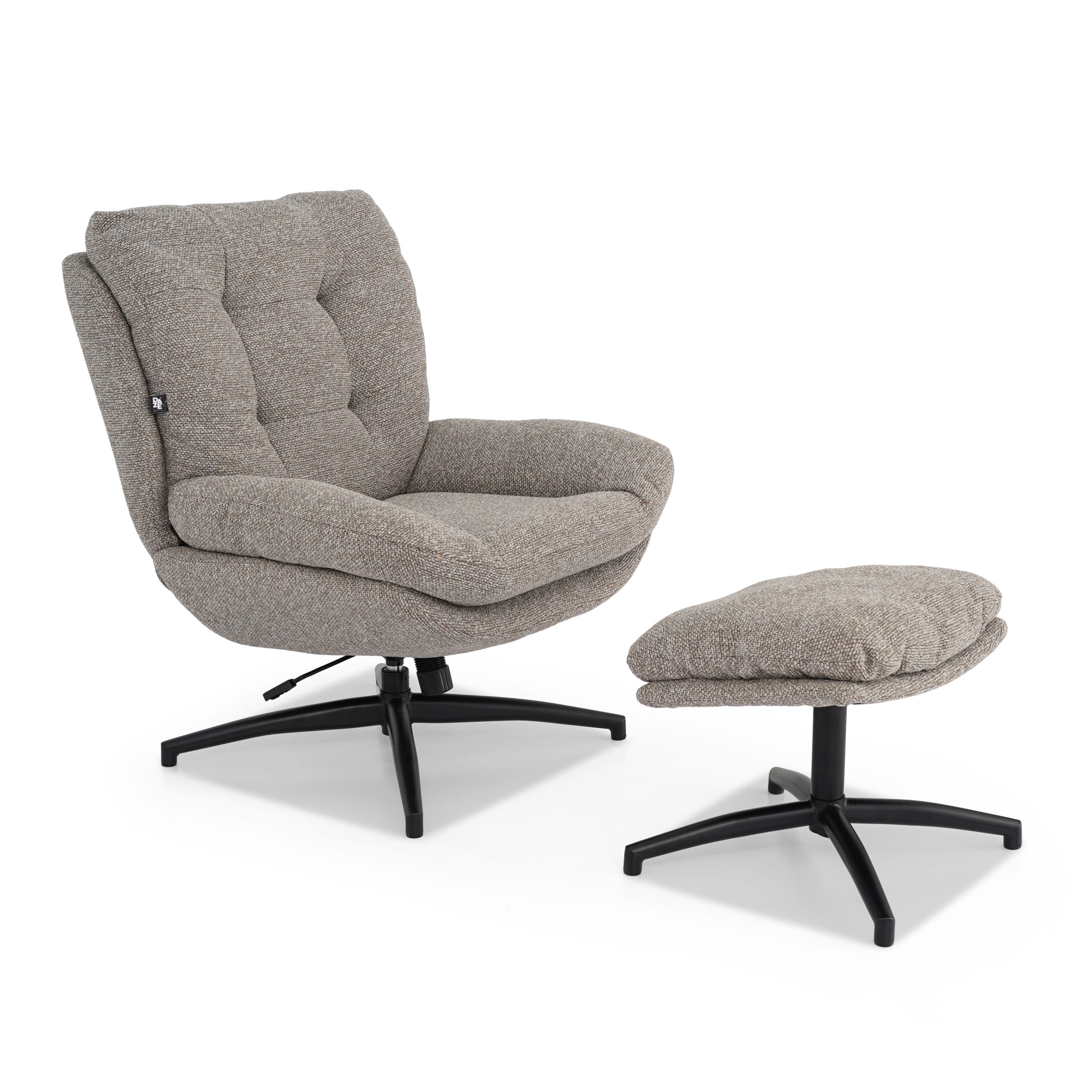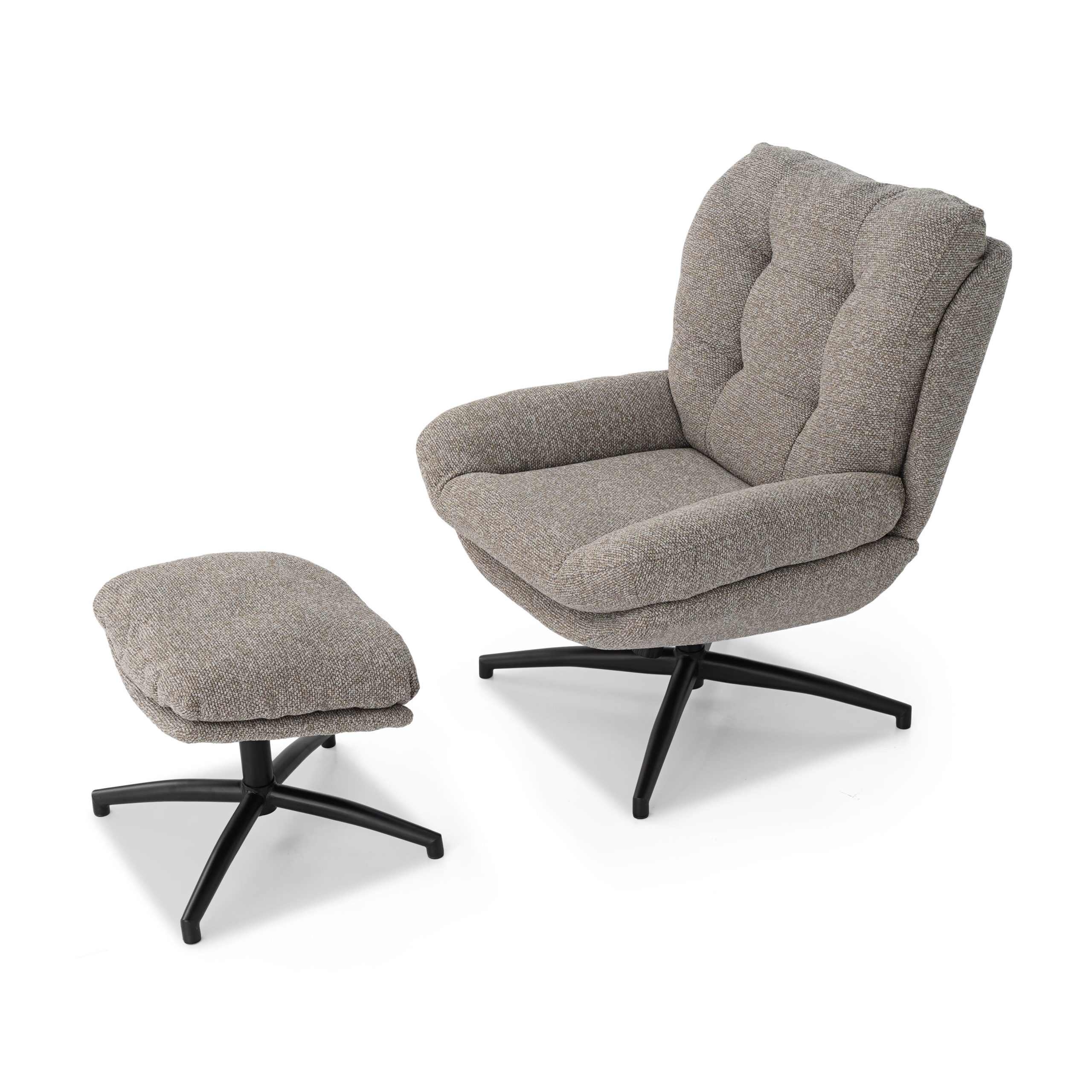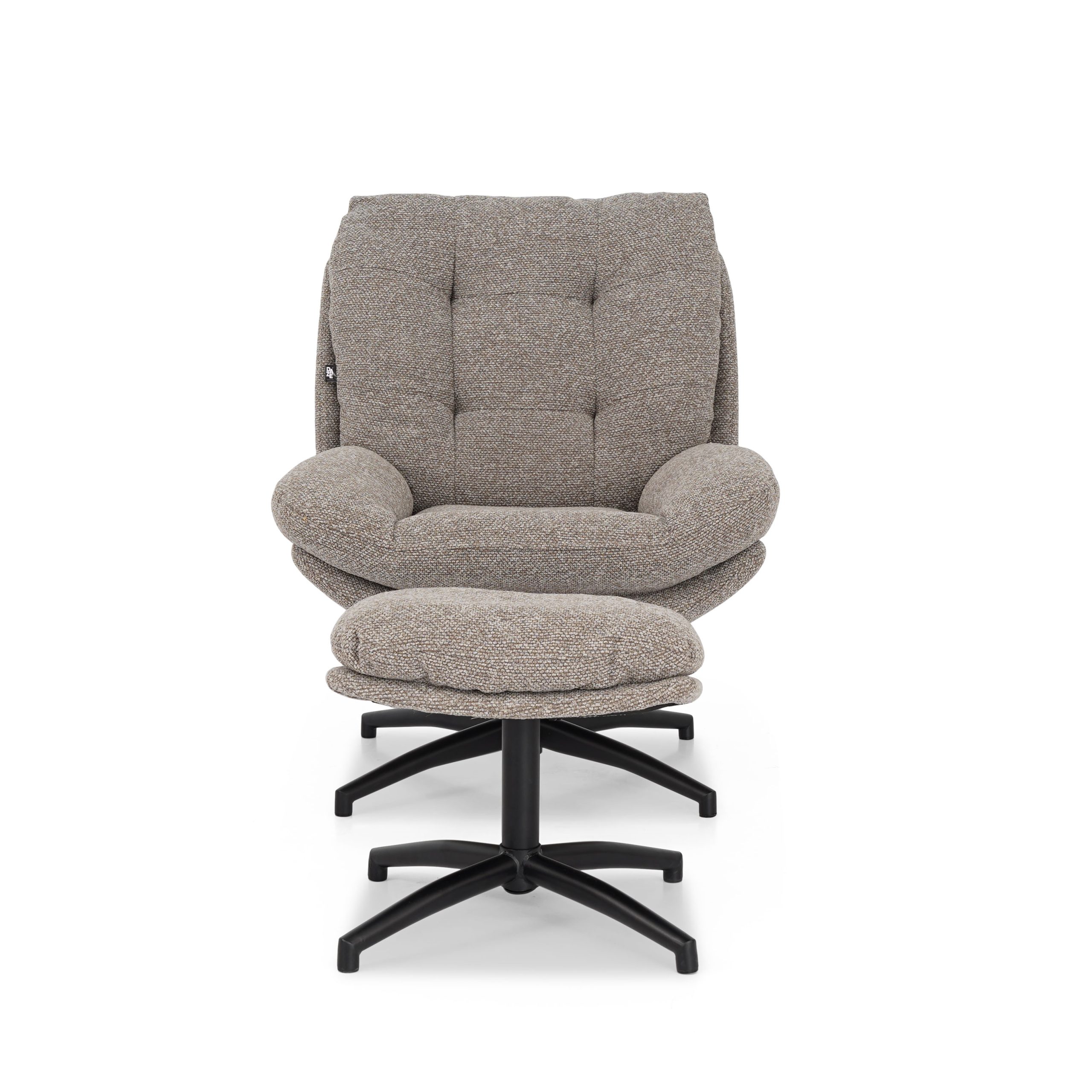 Beige linen wool effect lounge chair & ottoman with a black powder coated metal base. To be wiped with clean water.
