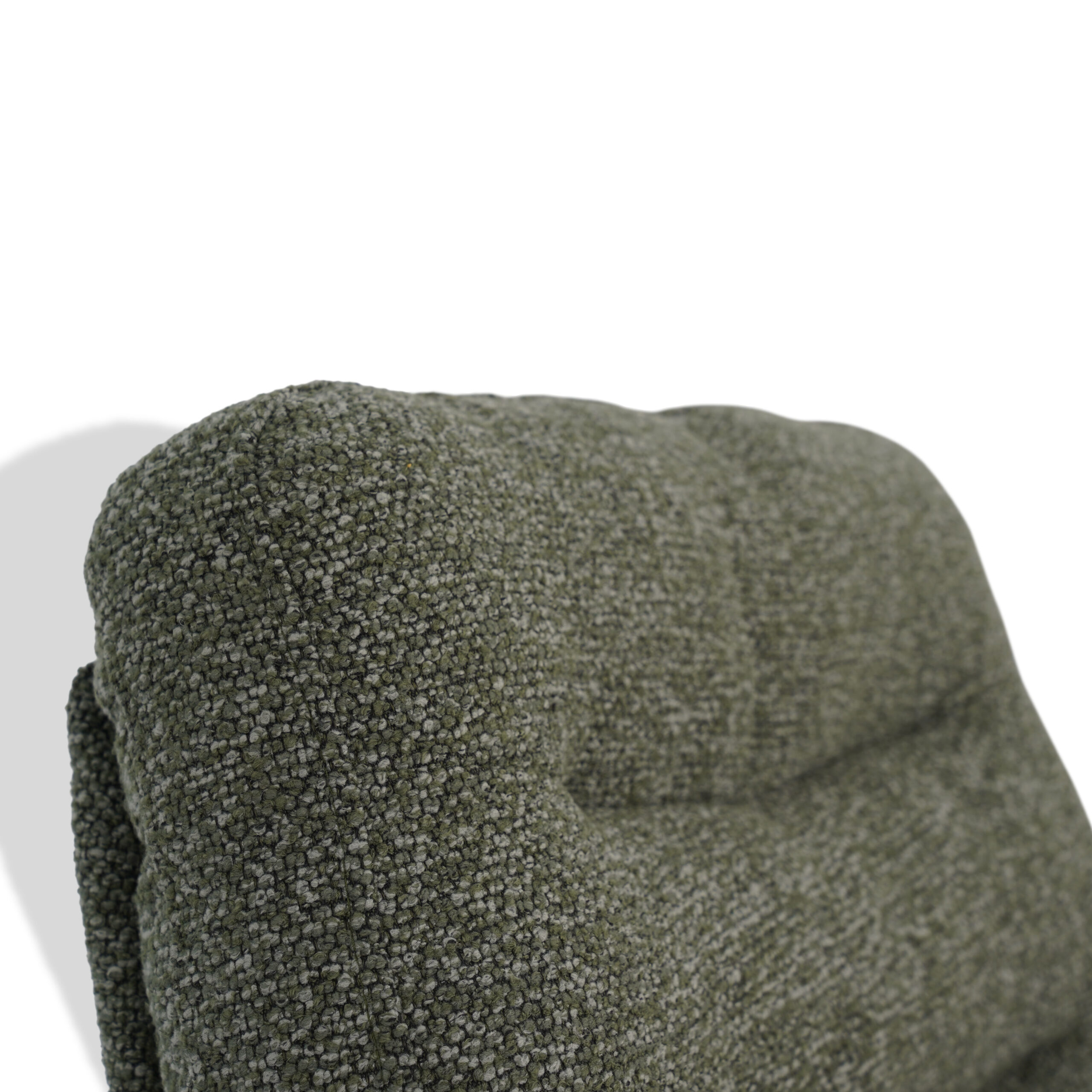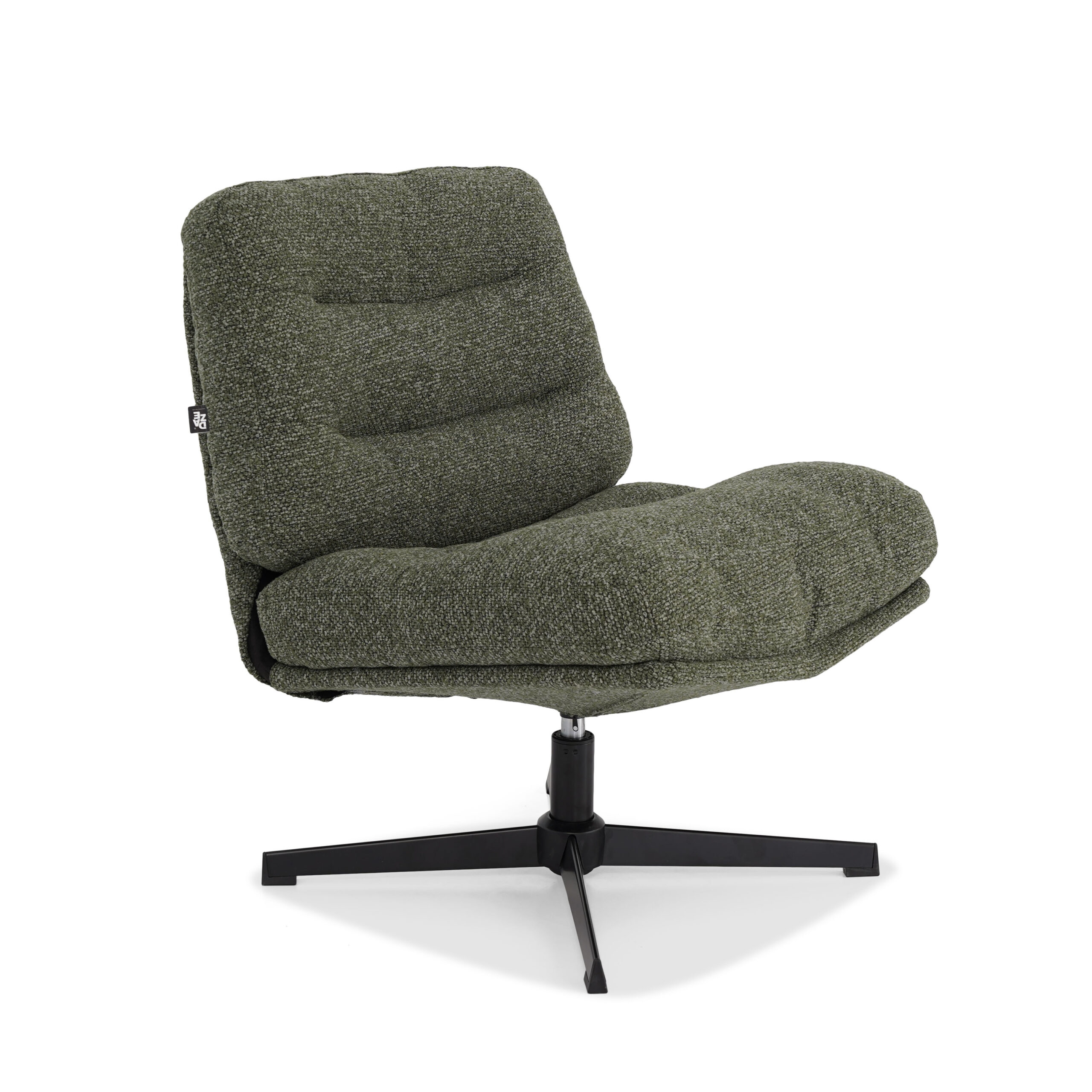 Green linen wool effect swivel chair with a black powder coated metal base. To be wiped with clean water.