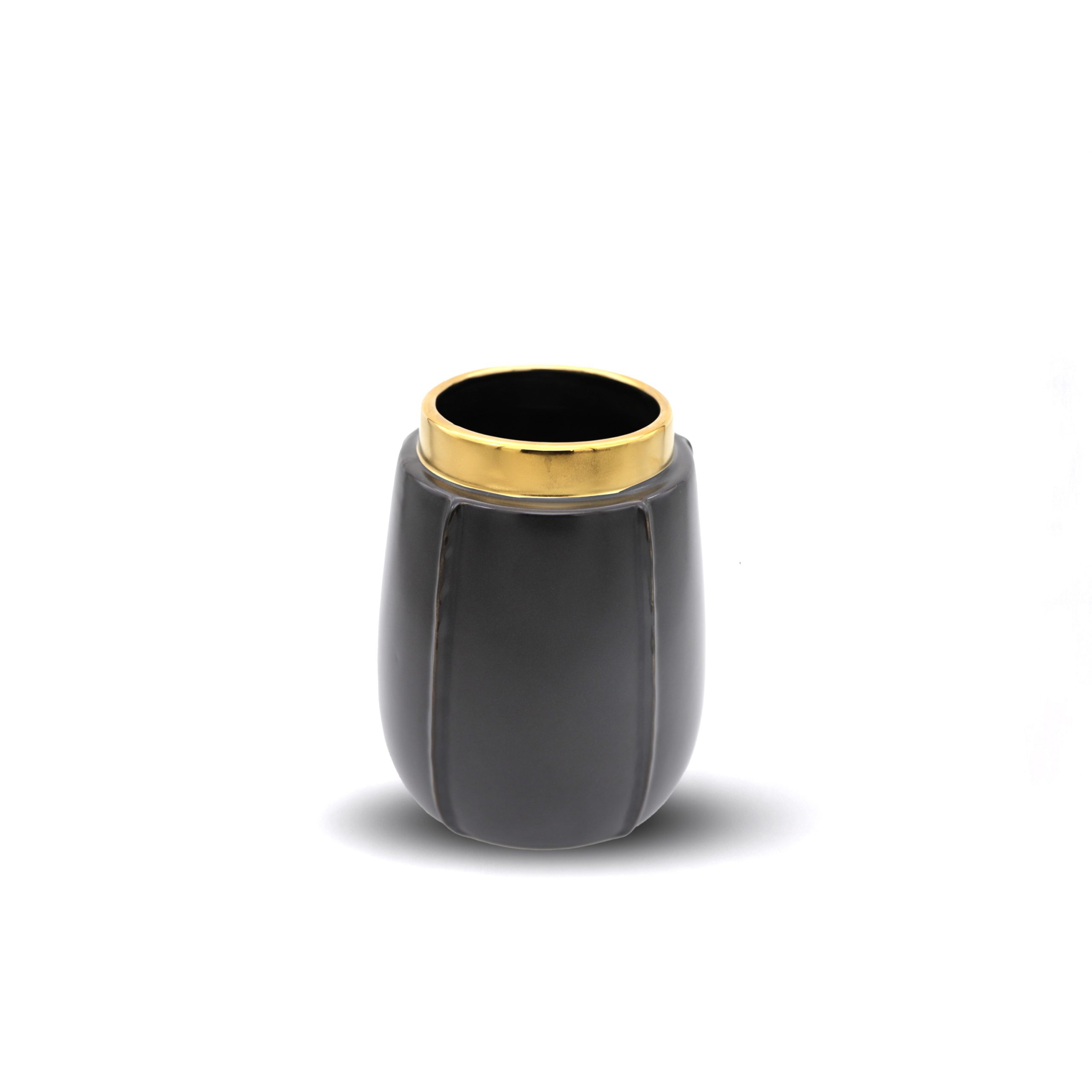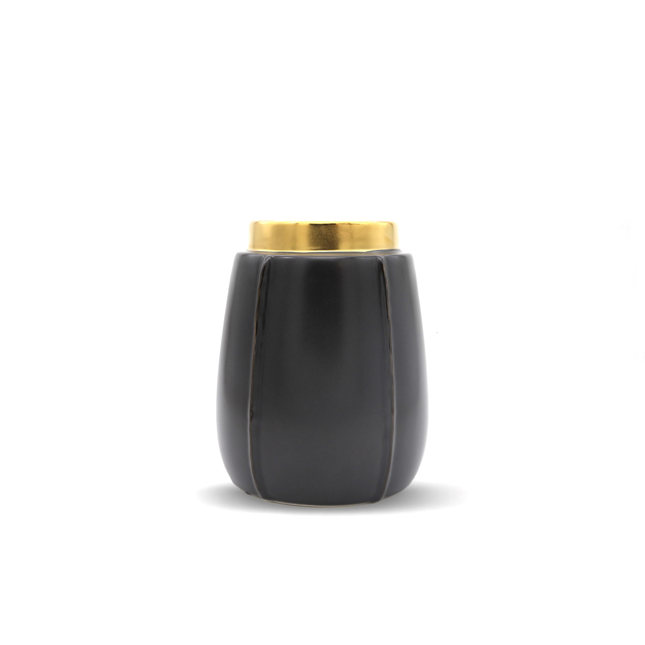 Medium size sleek ceramic vase featuring a matte black body with vertical contour lines and a contrasting metallic gold neck, blending modern sophistication with luxurious detail.