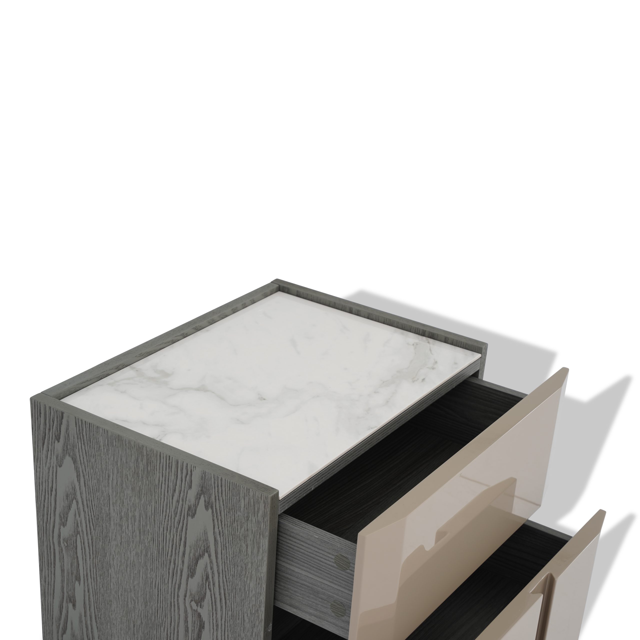 A modern essential boasting a soft ash grey and white top, paired with a sleek metal base.