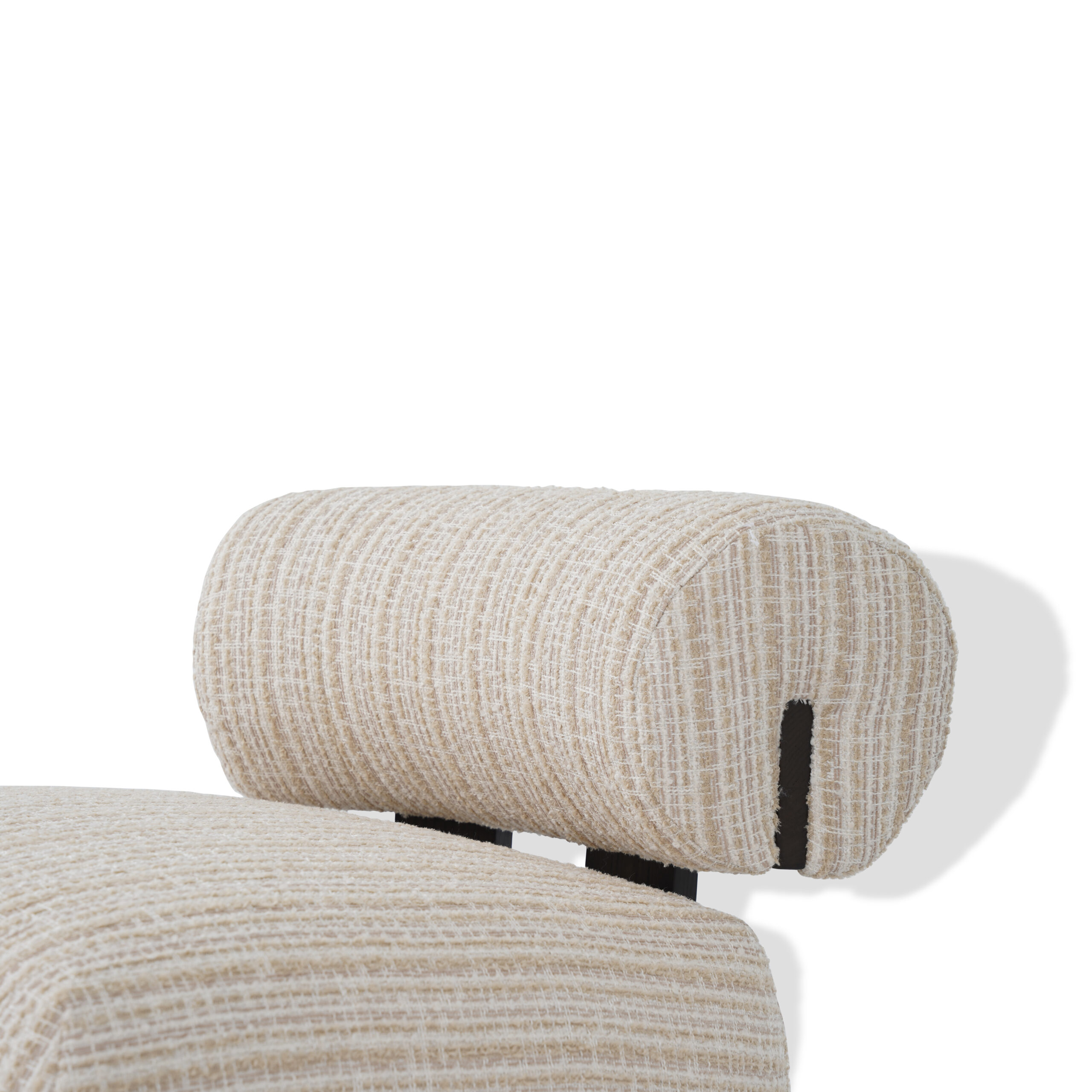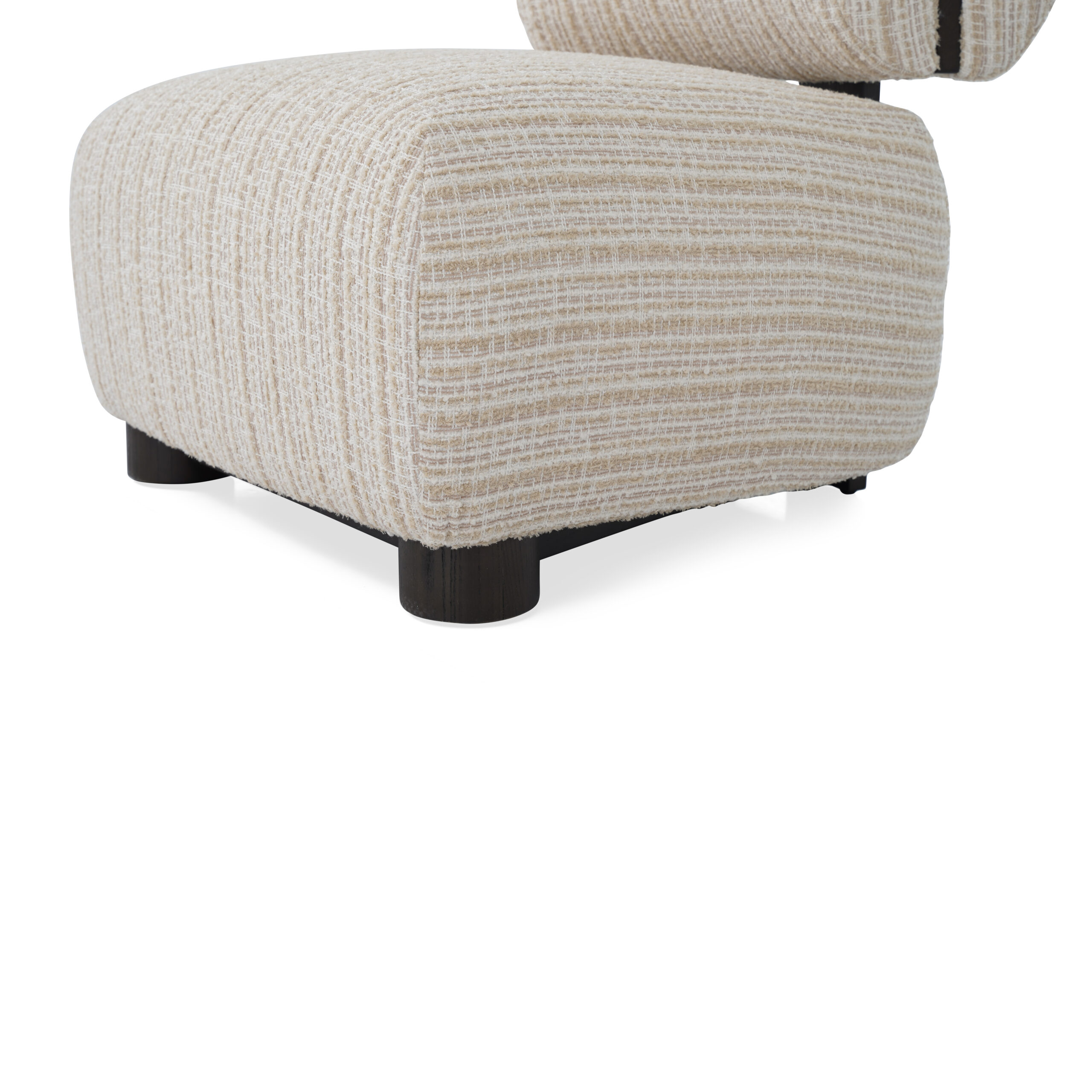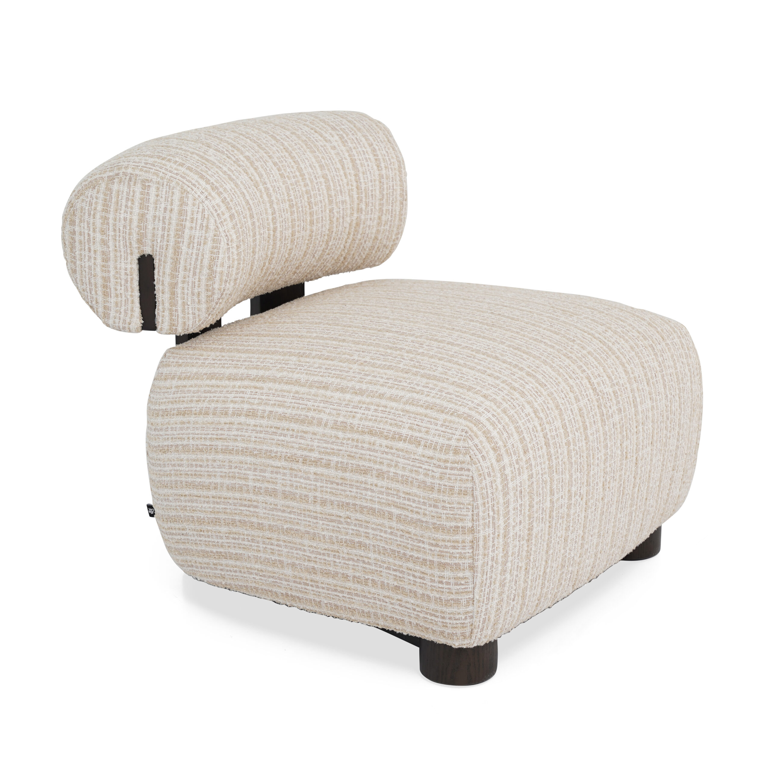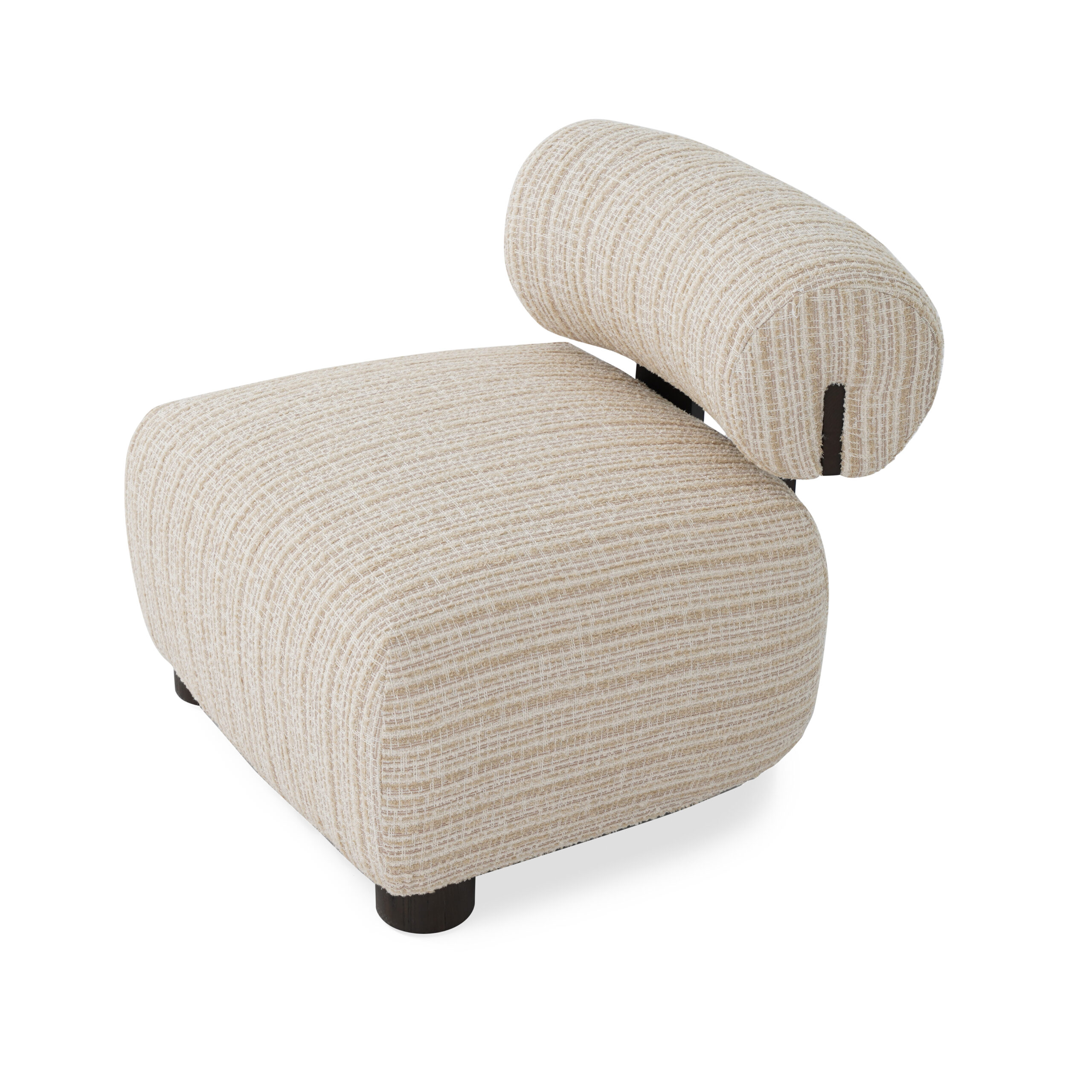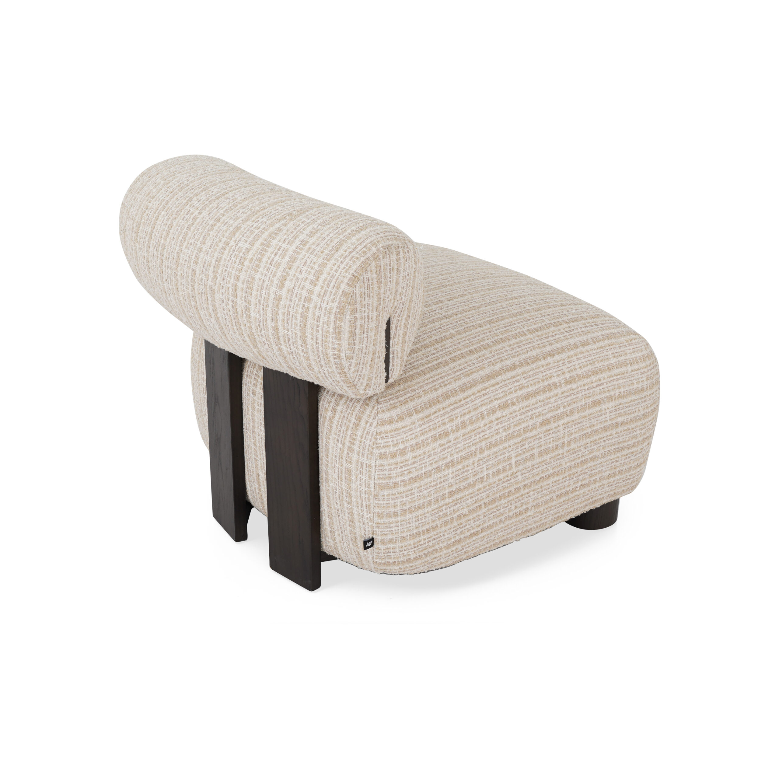 A greige linen wool effect armchair with an oak wooden base, blending soft texture with natural warmth in a refined silhouette.