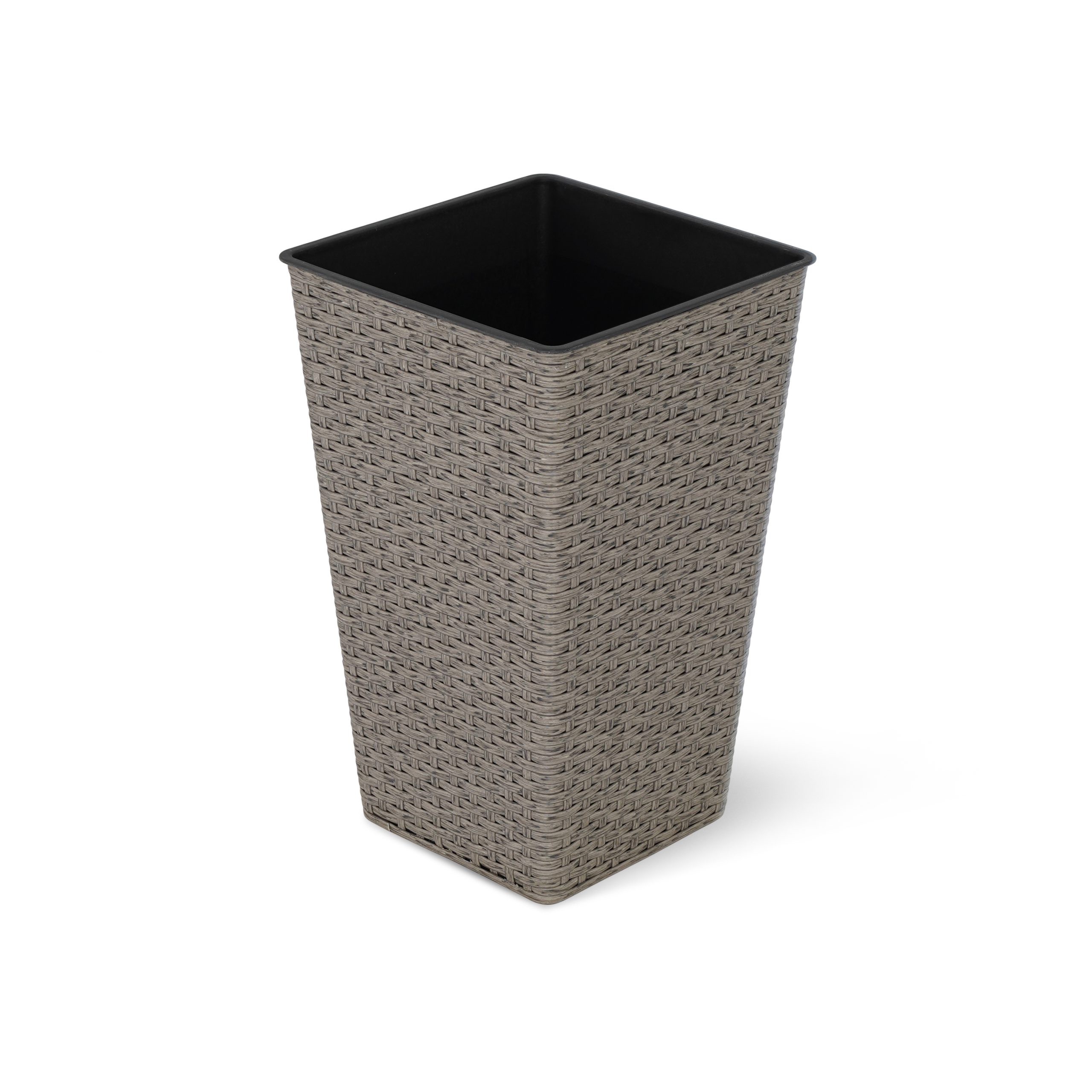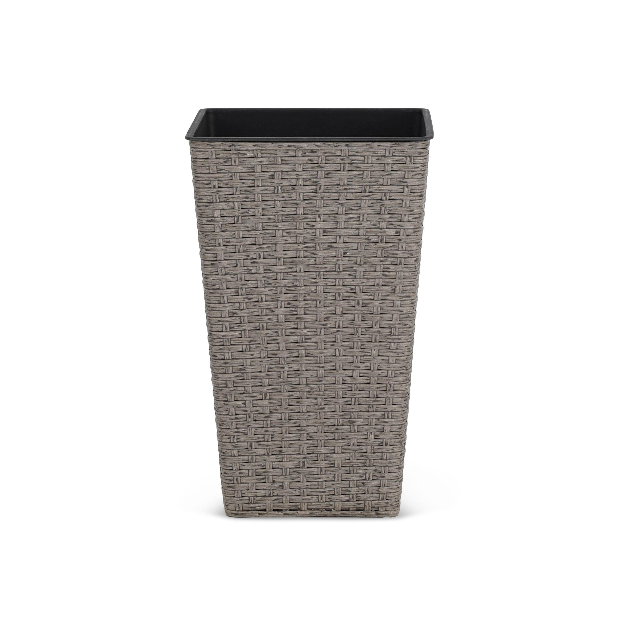 Large grey poly rattan planter with plastic lining.